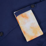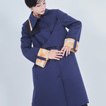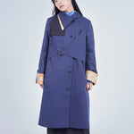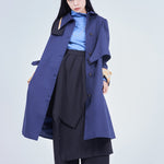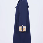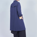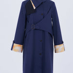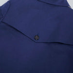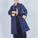 A trench coat based on navy stretch twill with Mizuid original printed fabric on the collar and sleeves to express the sunset that fades into the deepening night sky.