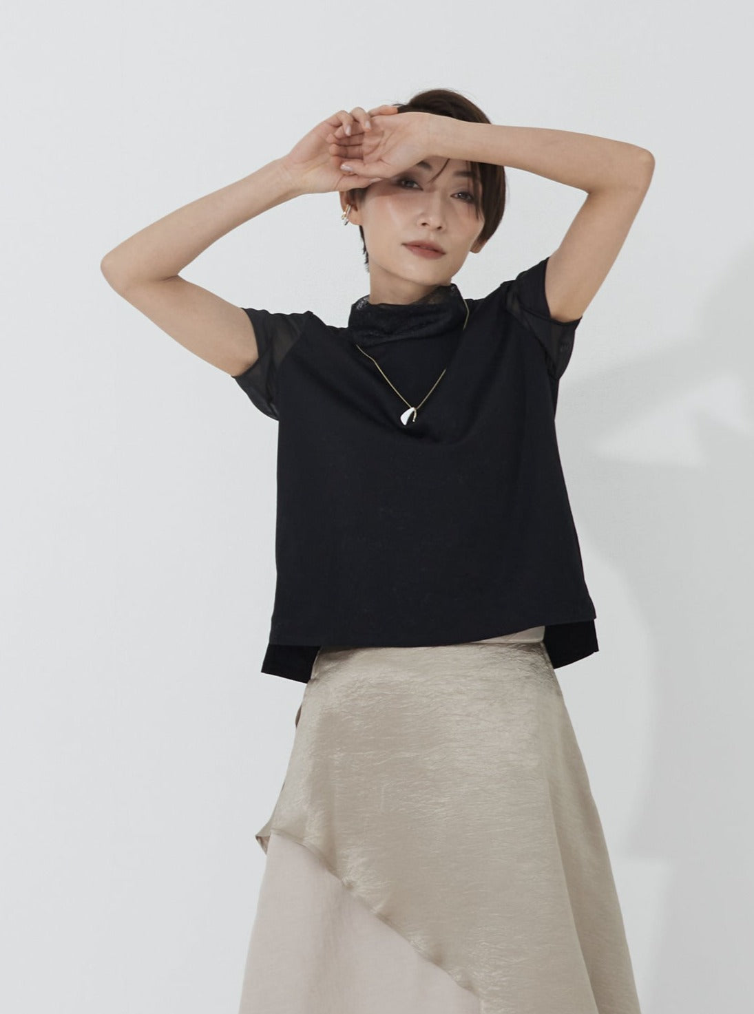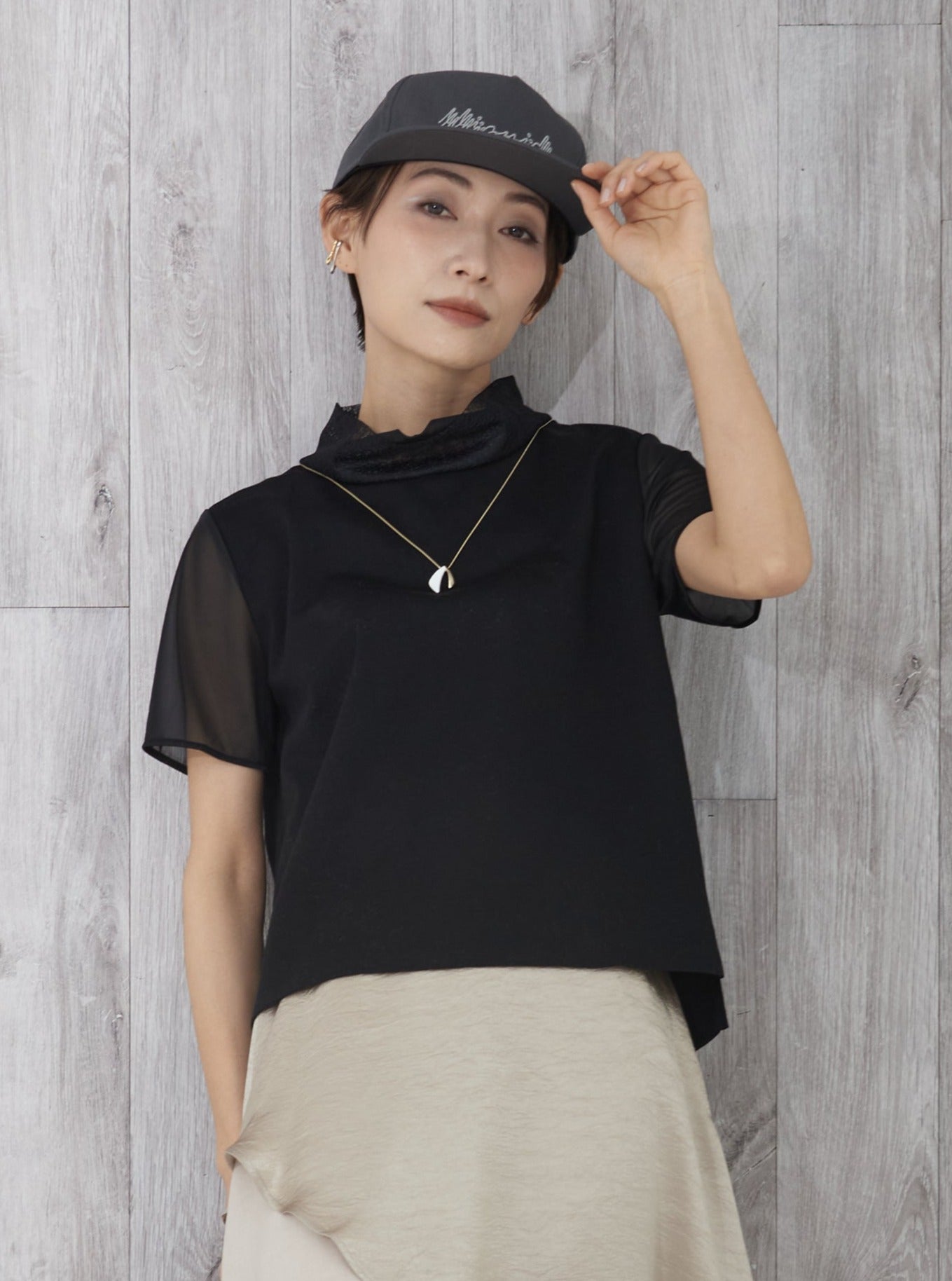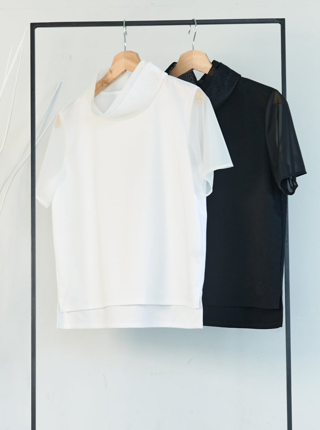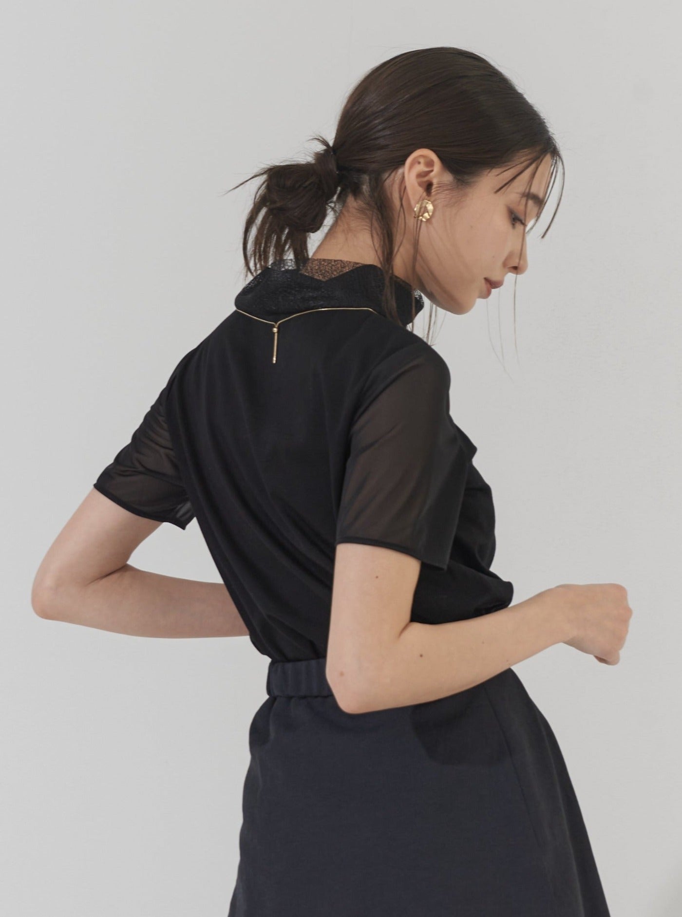 The body is made of a clean T-shirt fabric that allows for easy movement, and the sheer collar and sleeves give you an elegant look.