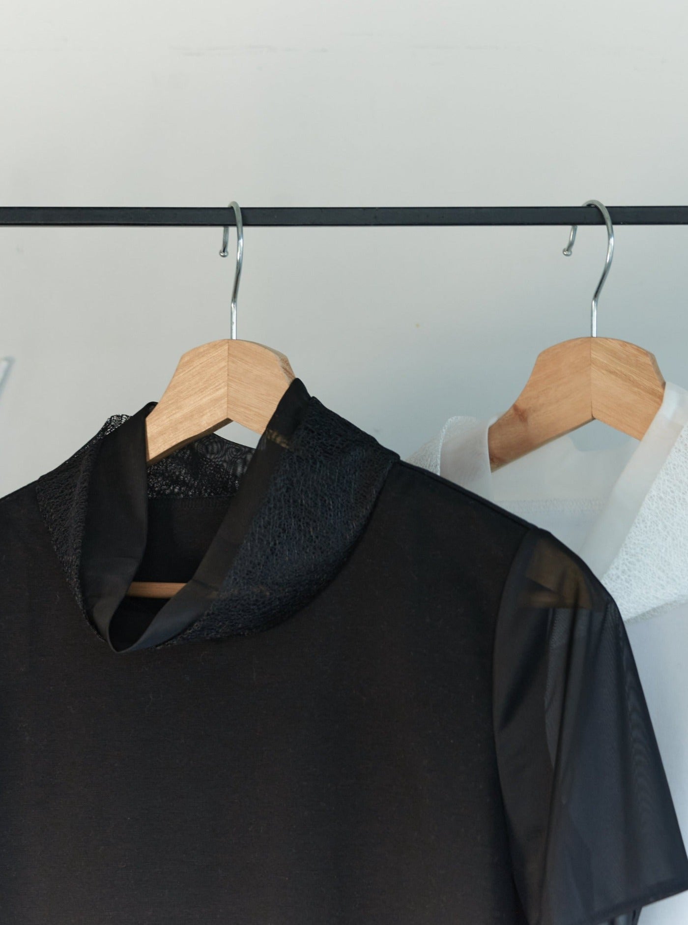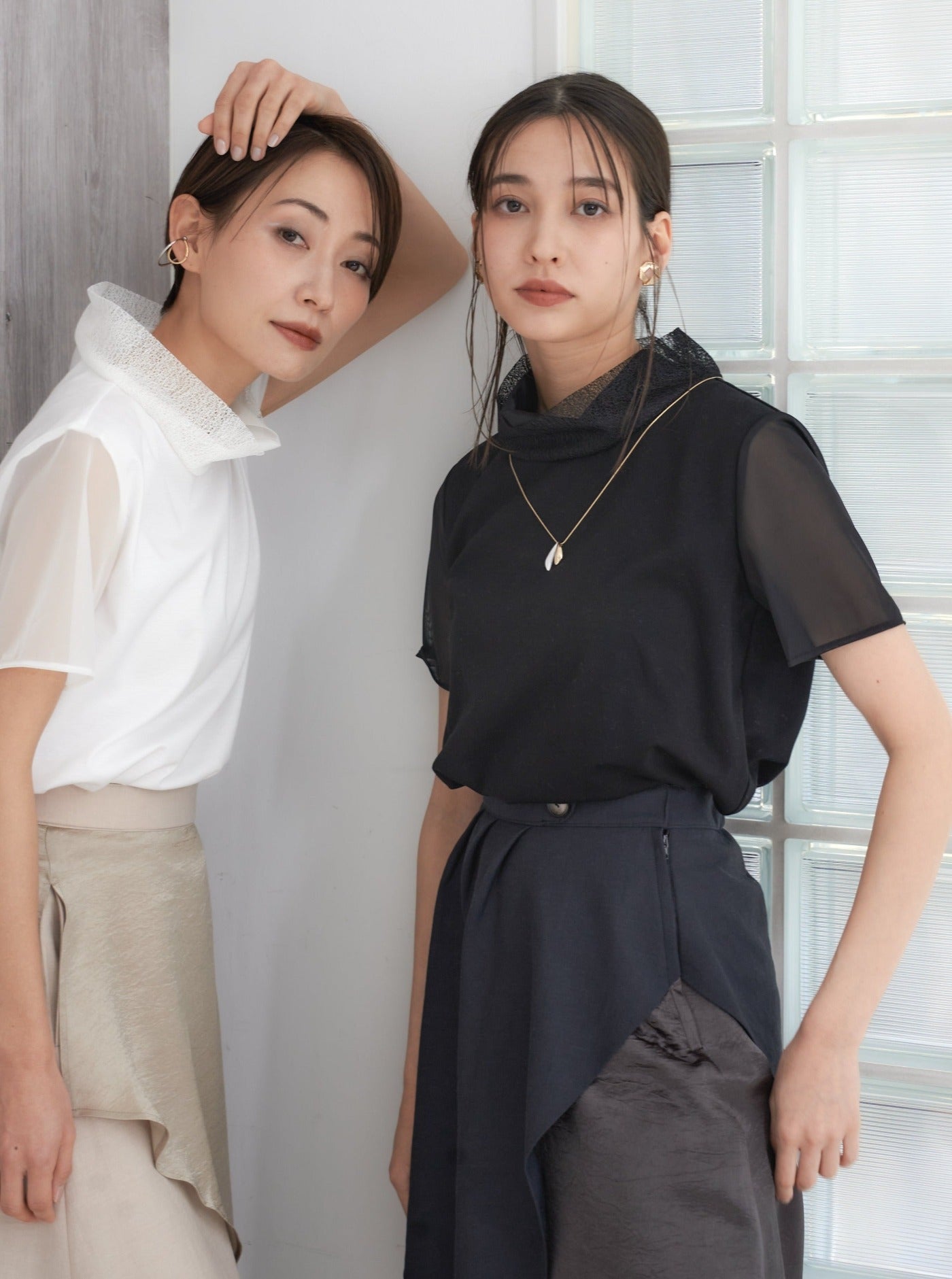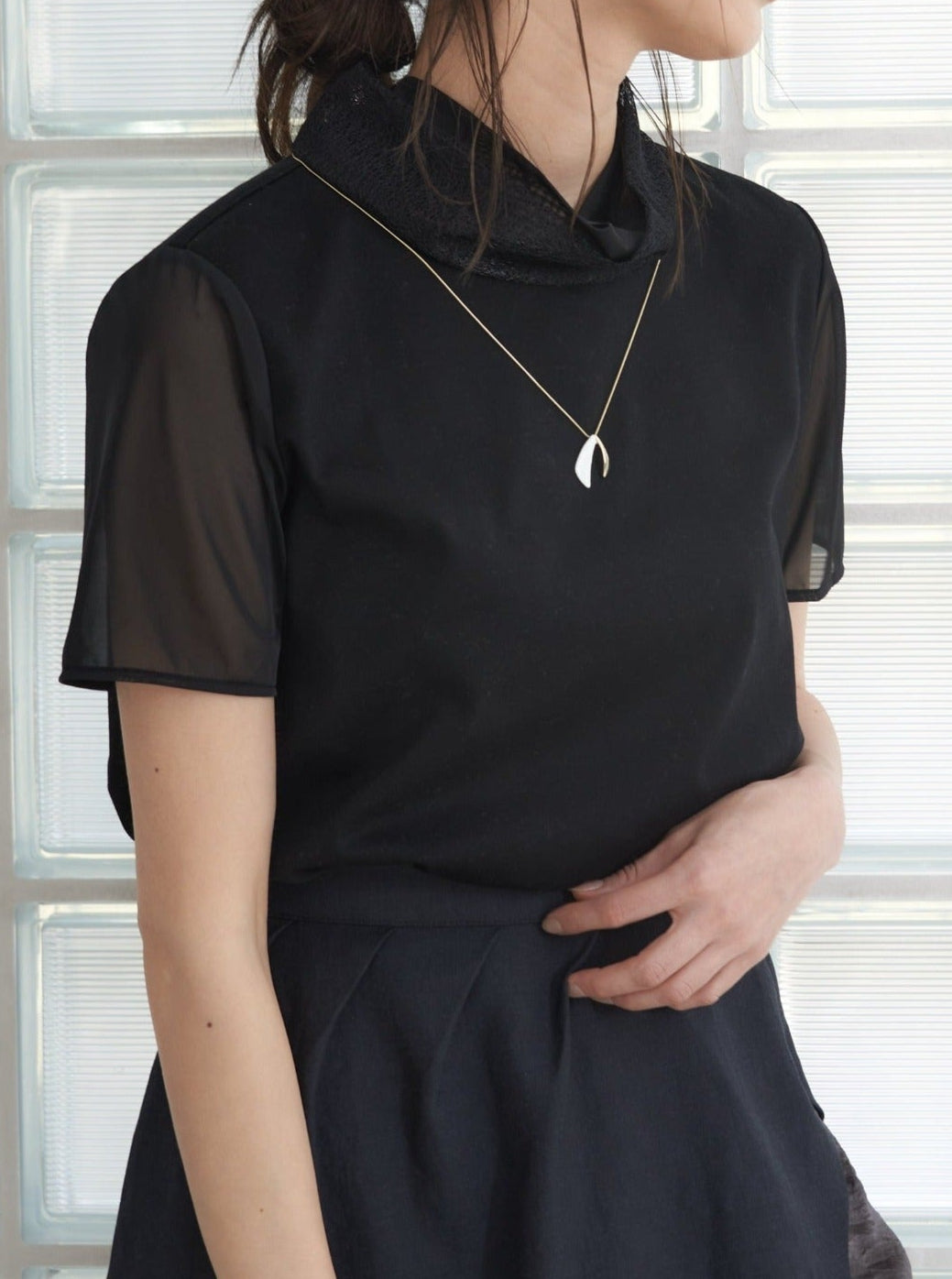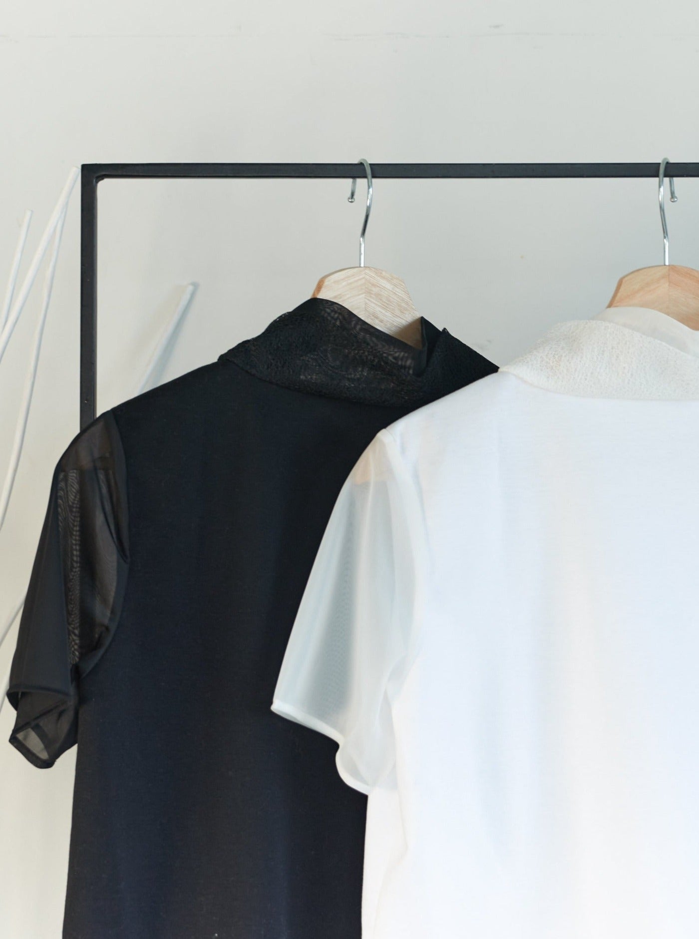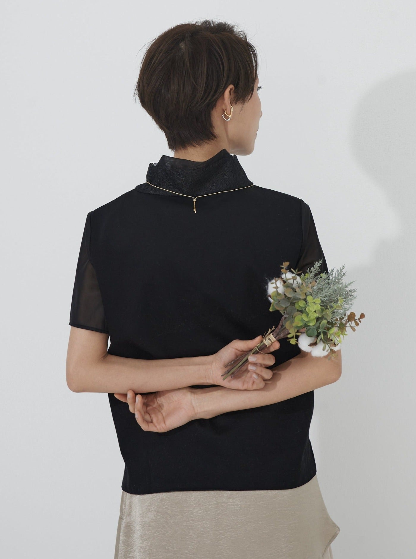 The body is made of a clean T-shirt fabric that allows for easy movement, and the sheer collar and sleeves give you an elegant look.