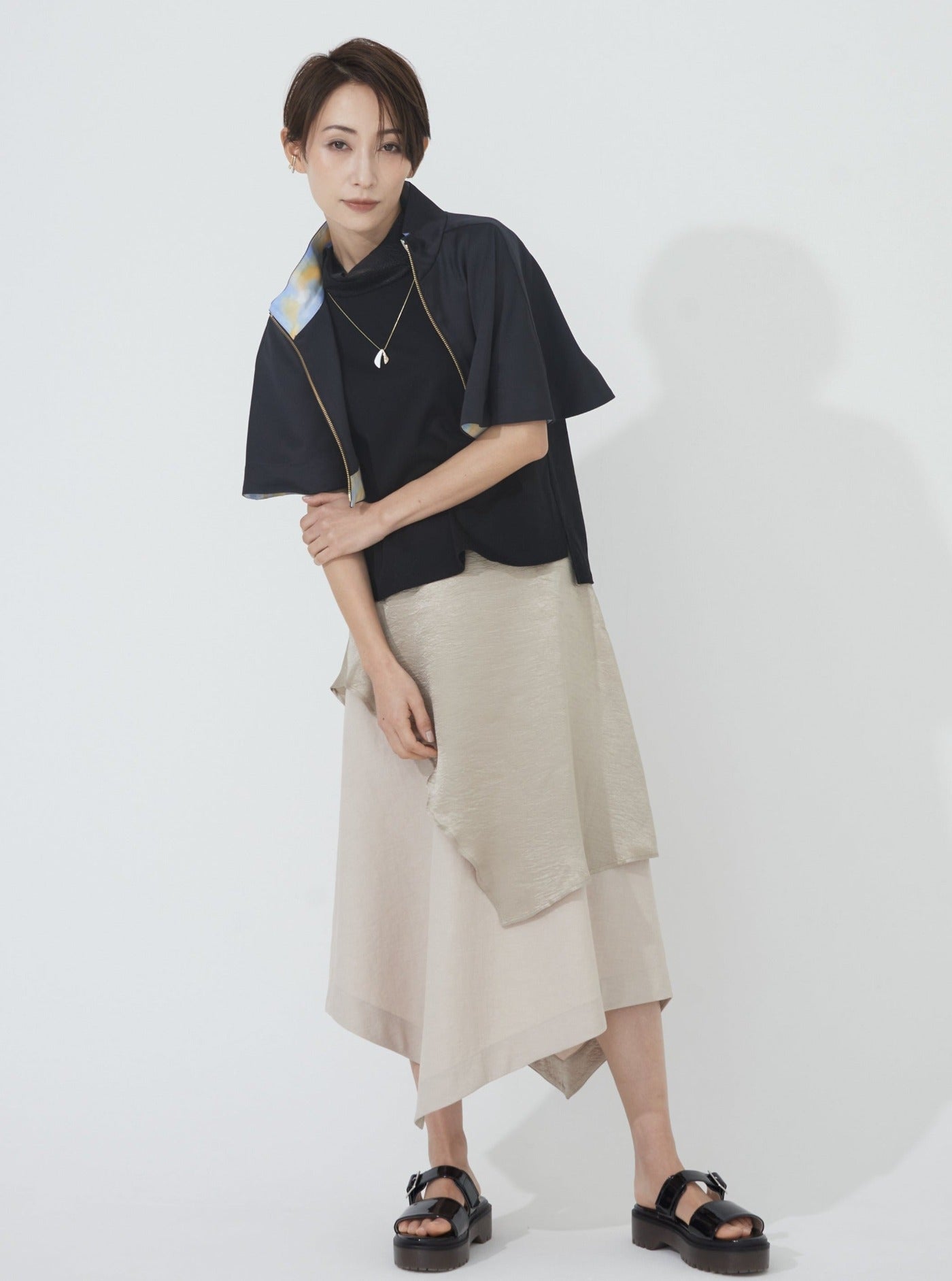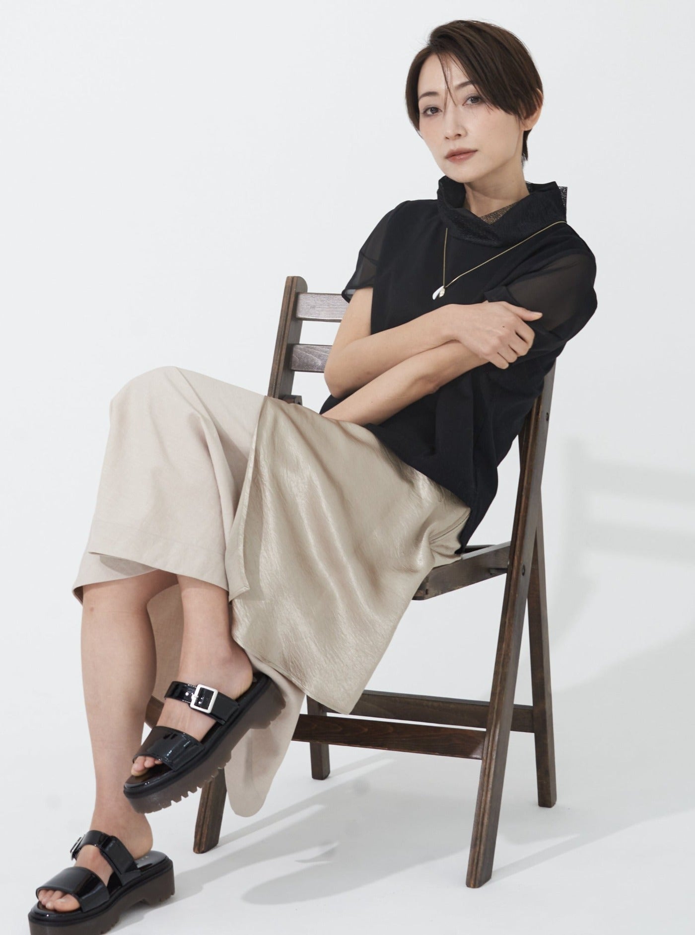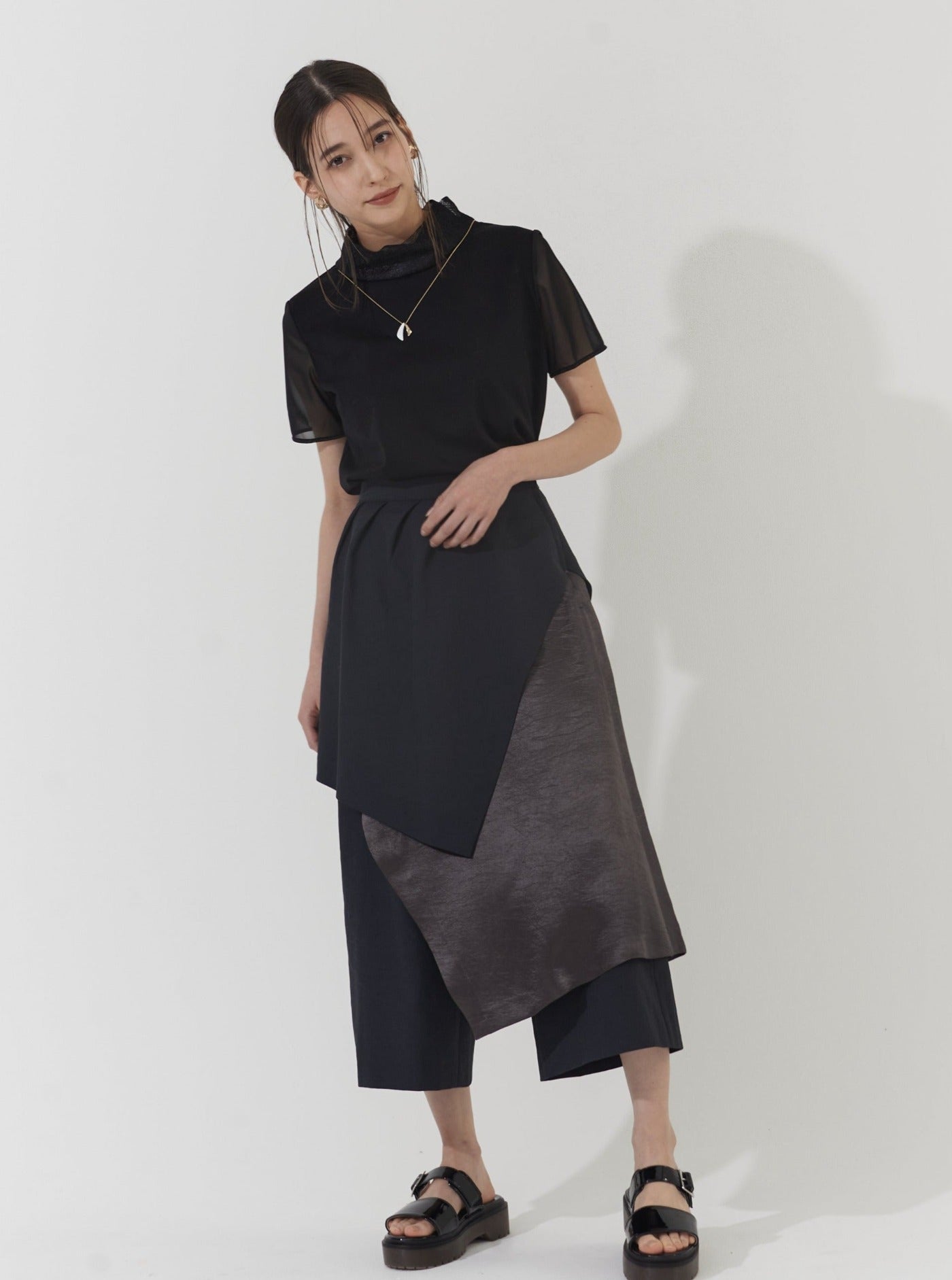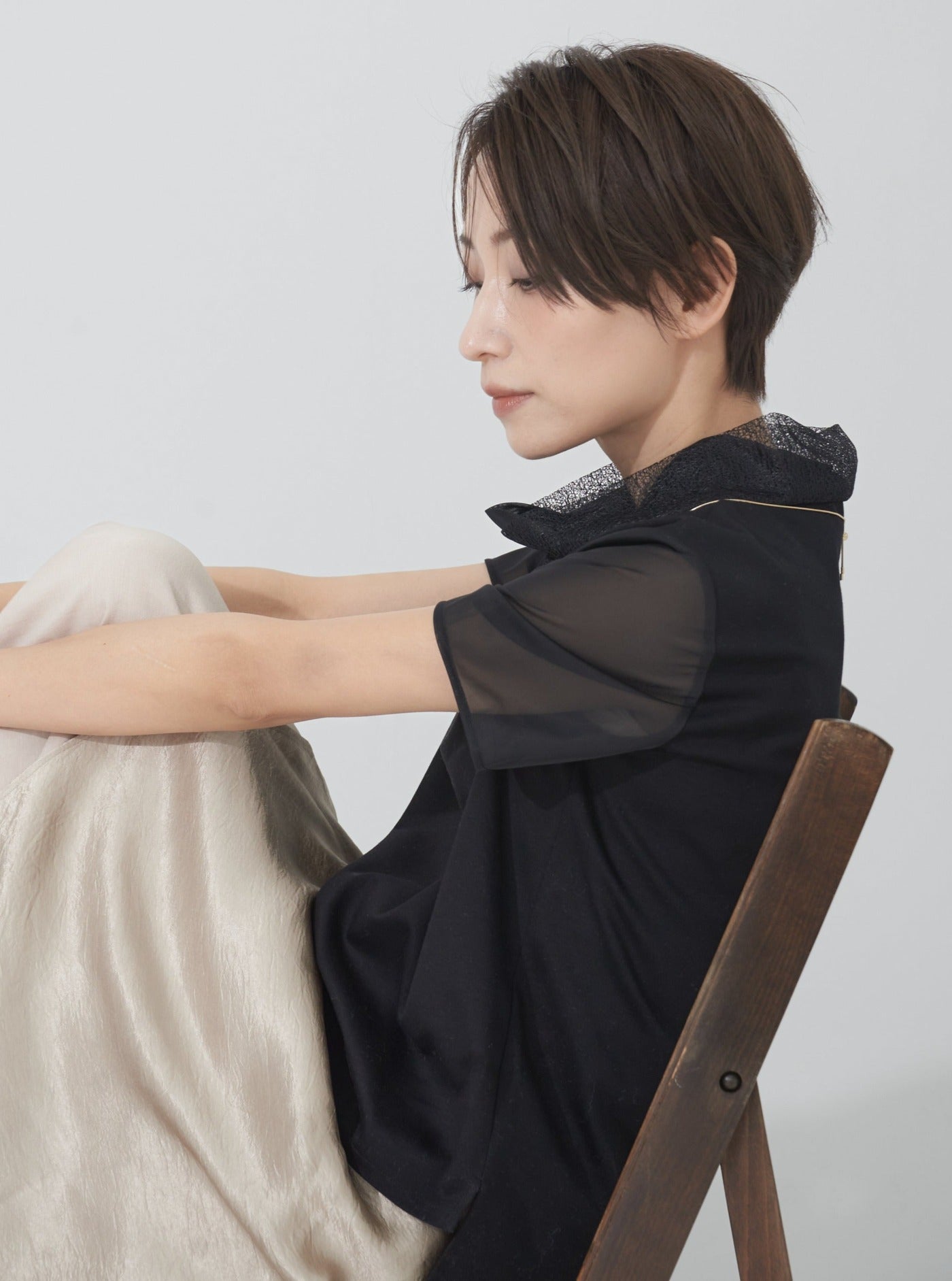 The body is made of a clean T-shirt fabric that allows for easy movement, and the sheer collar and sleeves give you an elegant look.