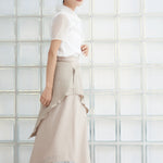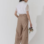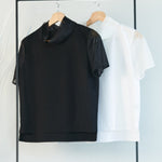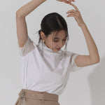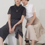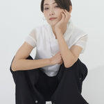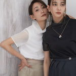 The body is made of a clean T-shirt fabric that allows for easy movement, and the sheer collar and sleeves give you an elegant look.