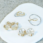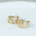 Ring-shaped earrings woven with a three-dimensional geometric design.