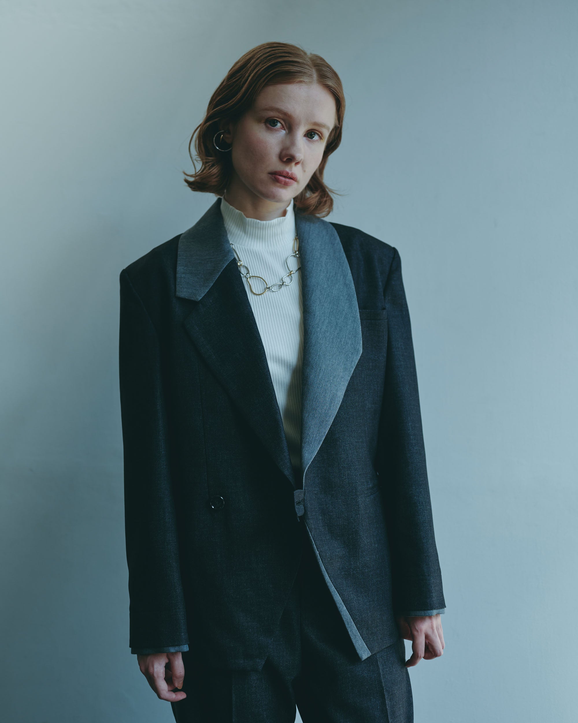 The elegant silhouette is combined with two types of denim-like fabric, giving it a casual feel.