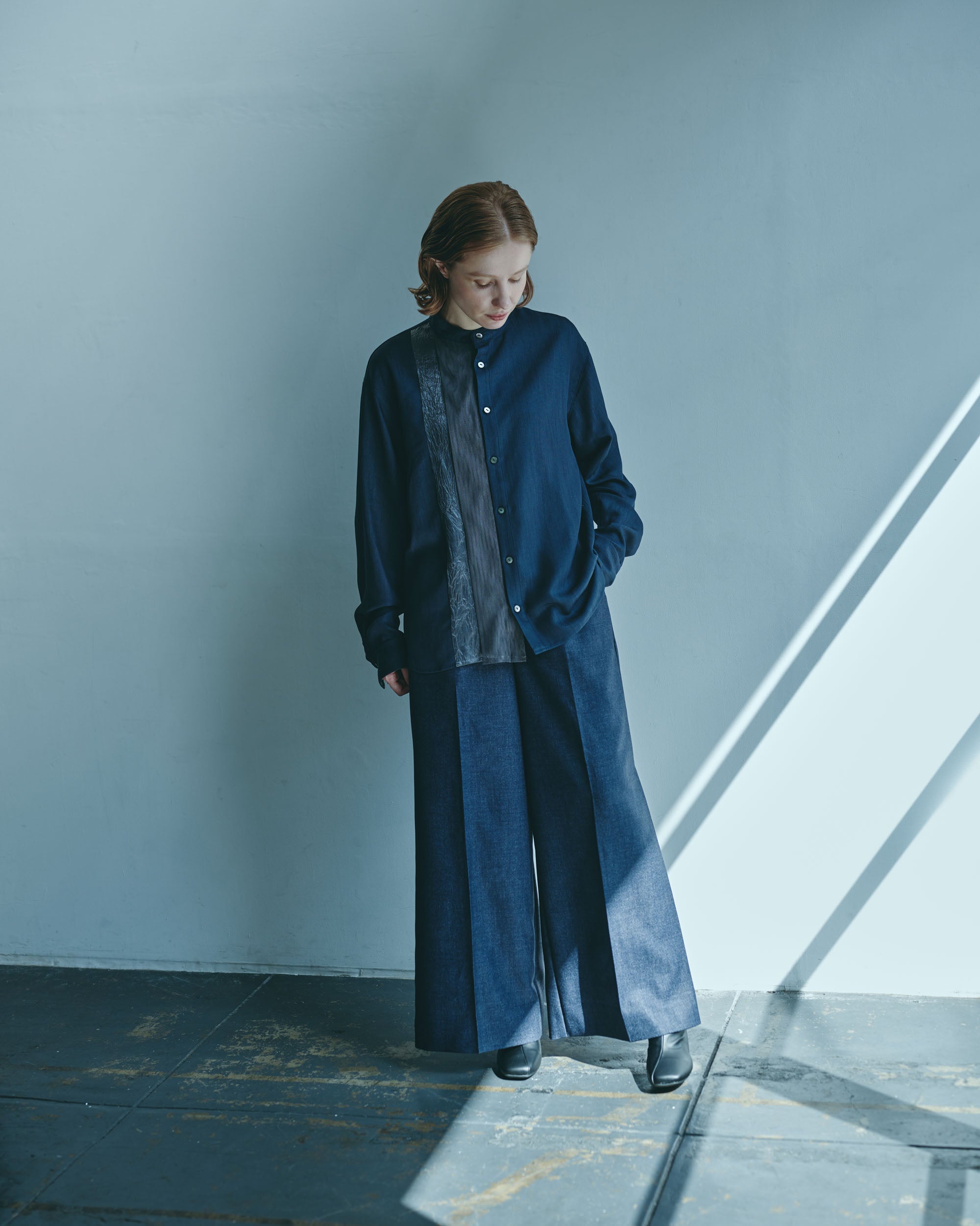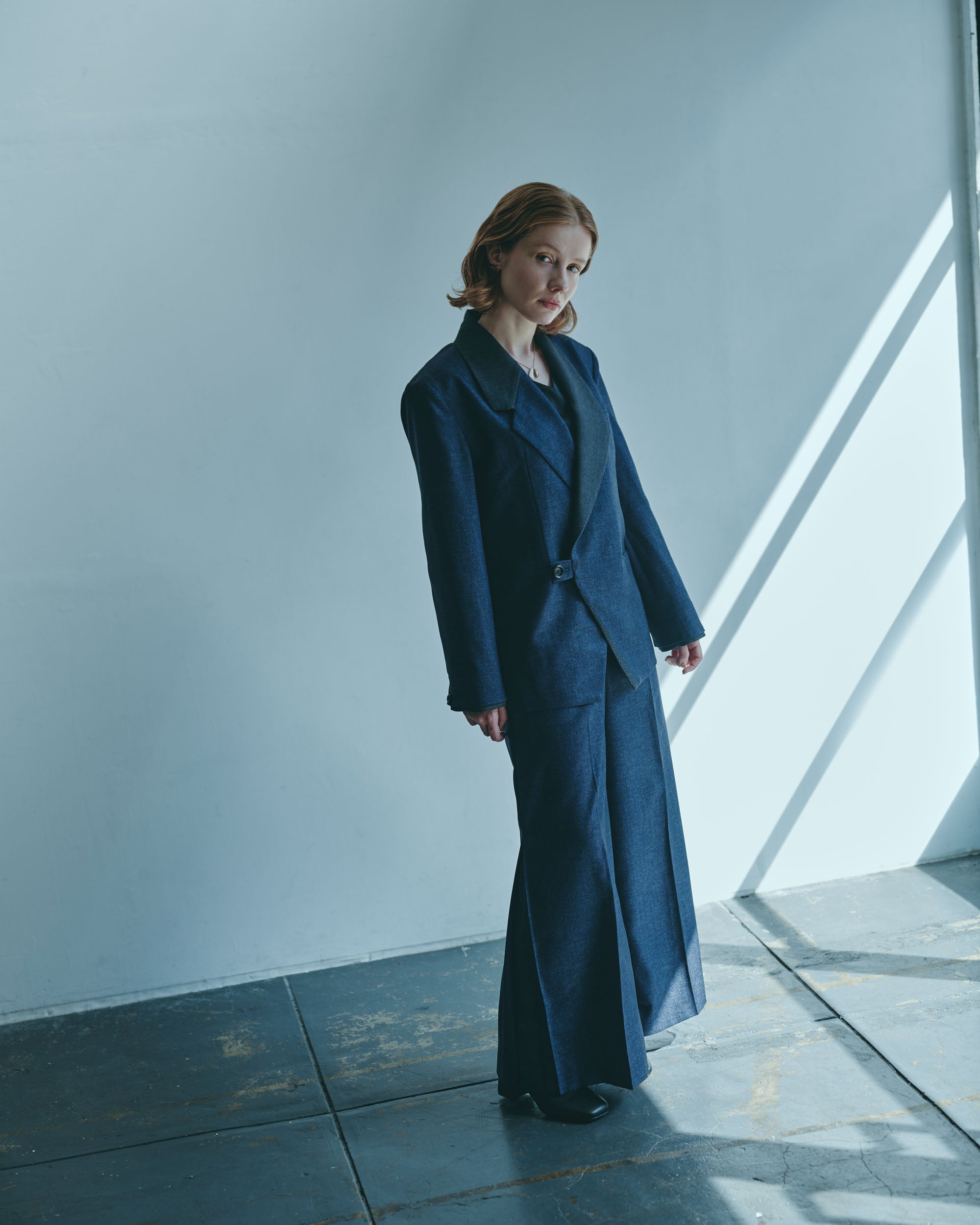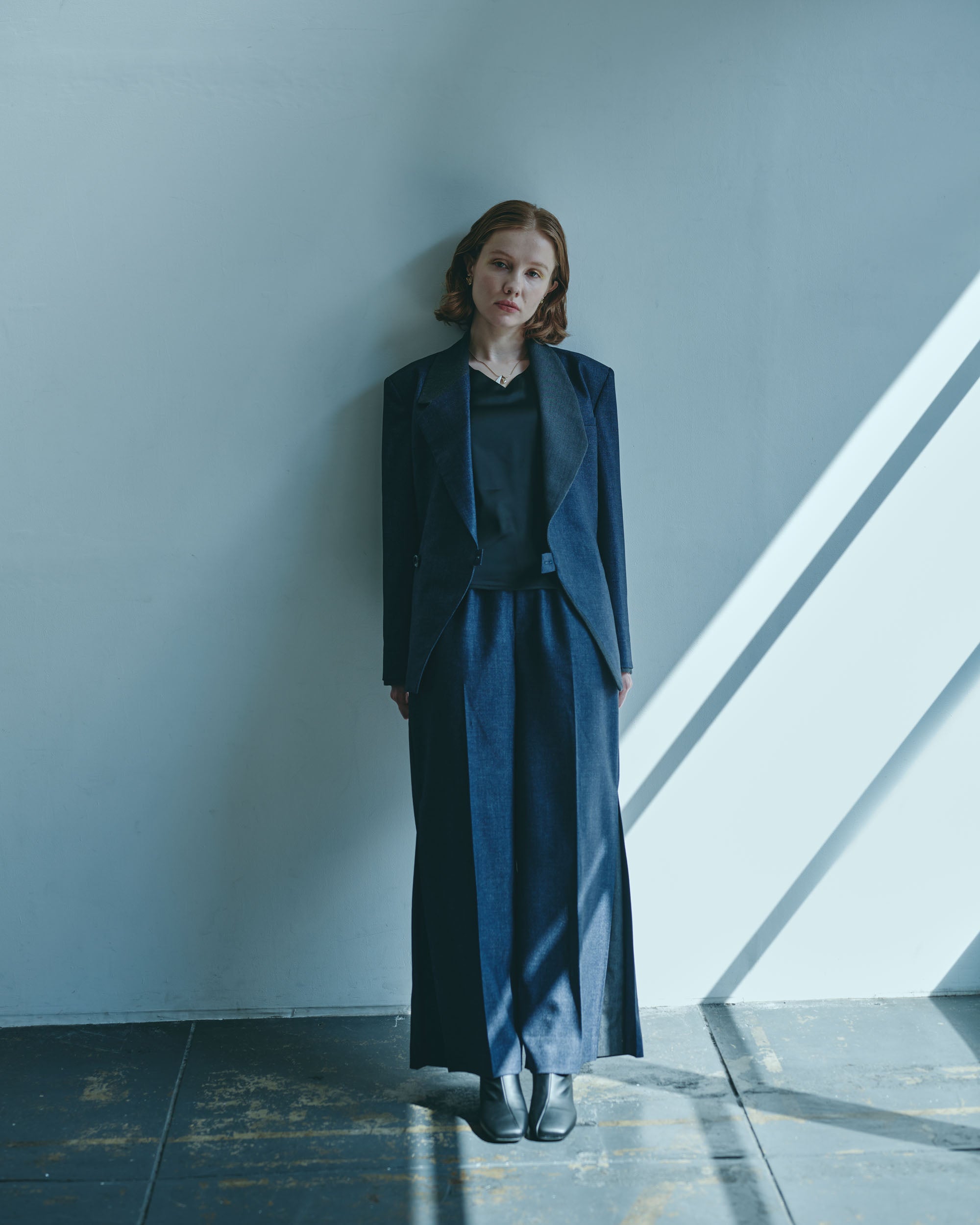 Combining two different denim-like fabrics, this piece is easy to wear for both casual and formal occasions, as well as everyday styles.