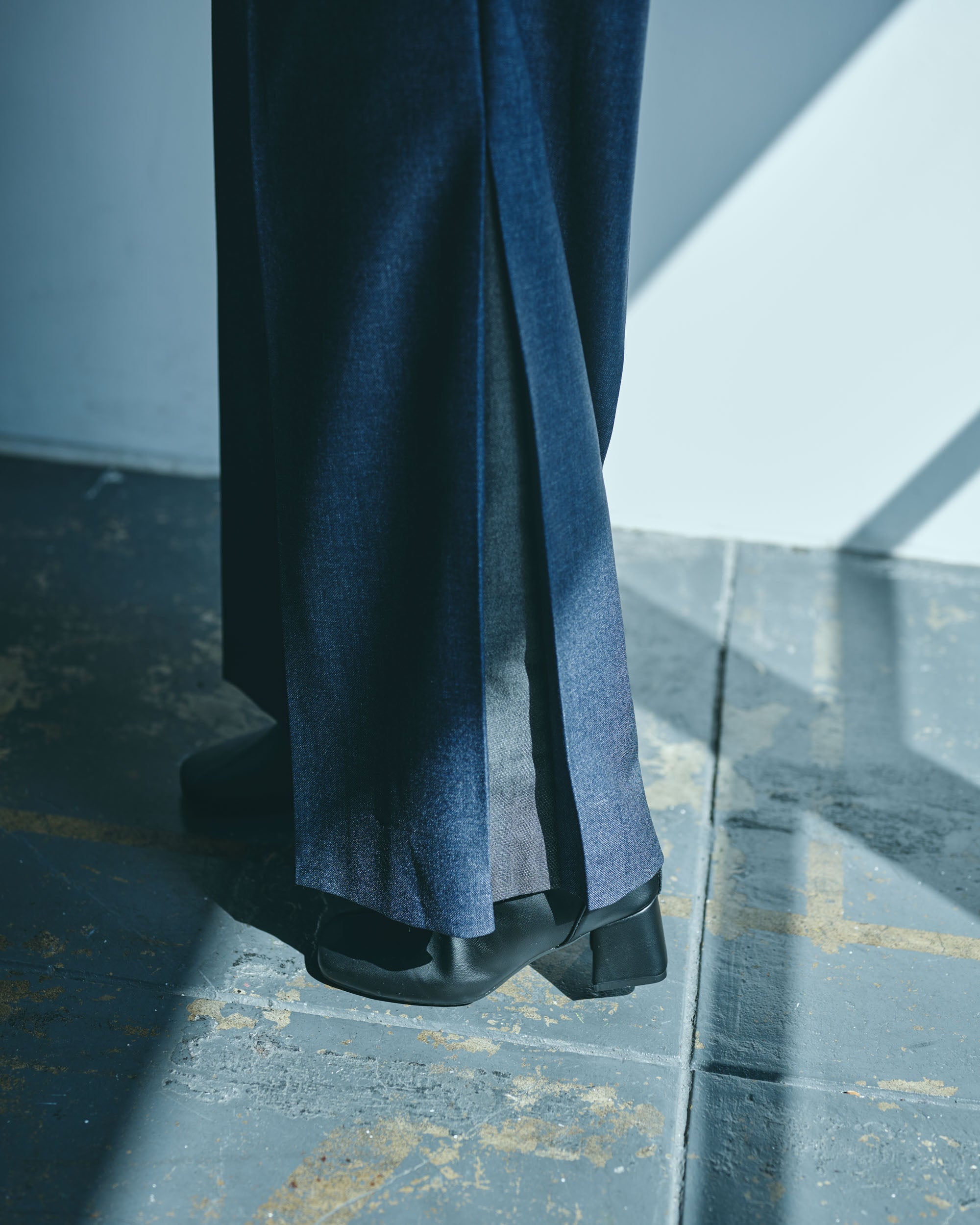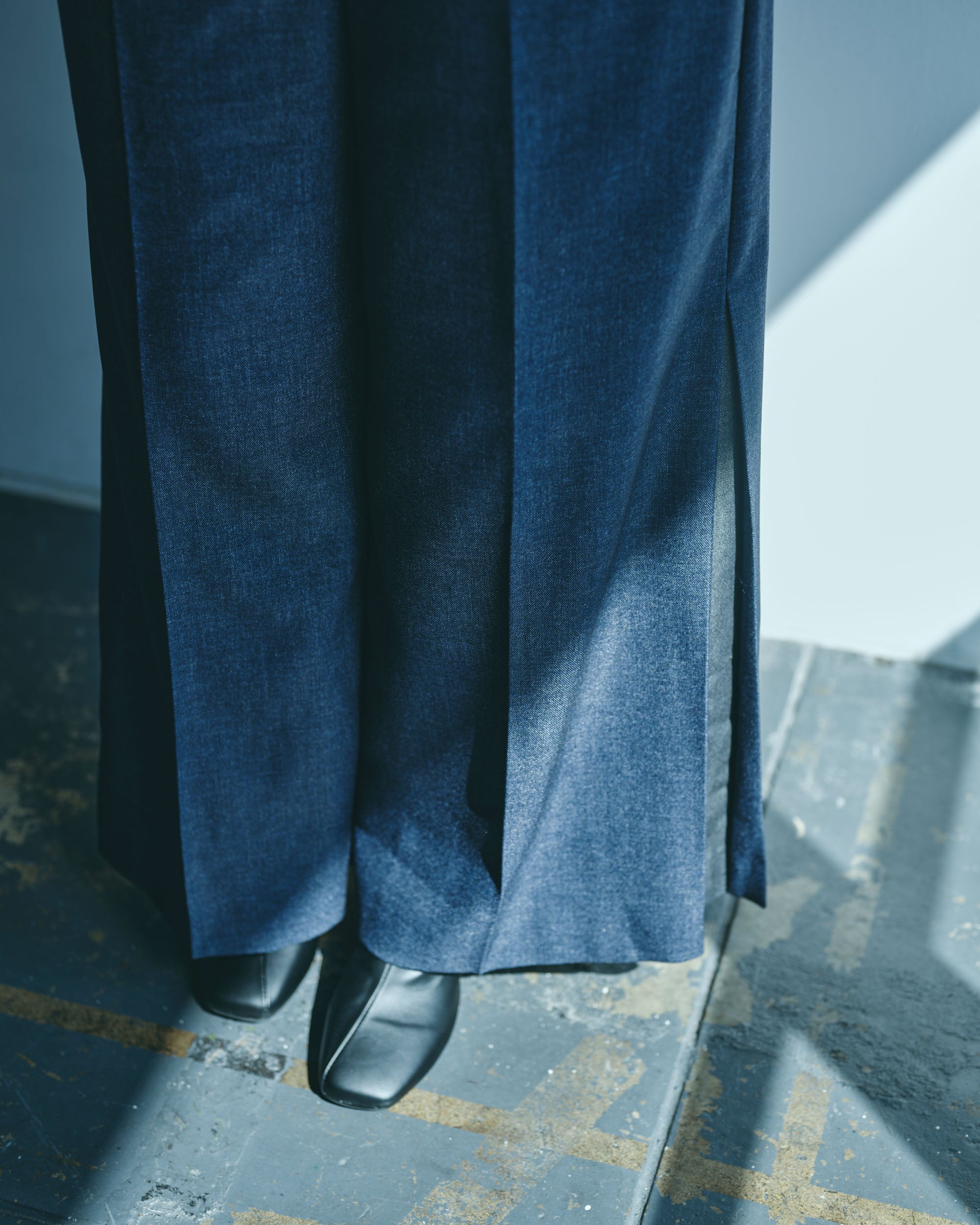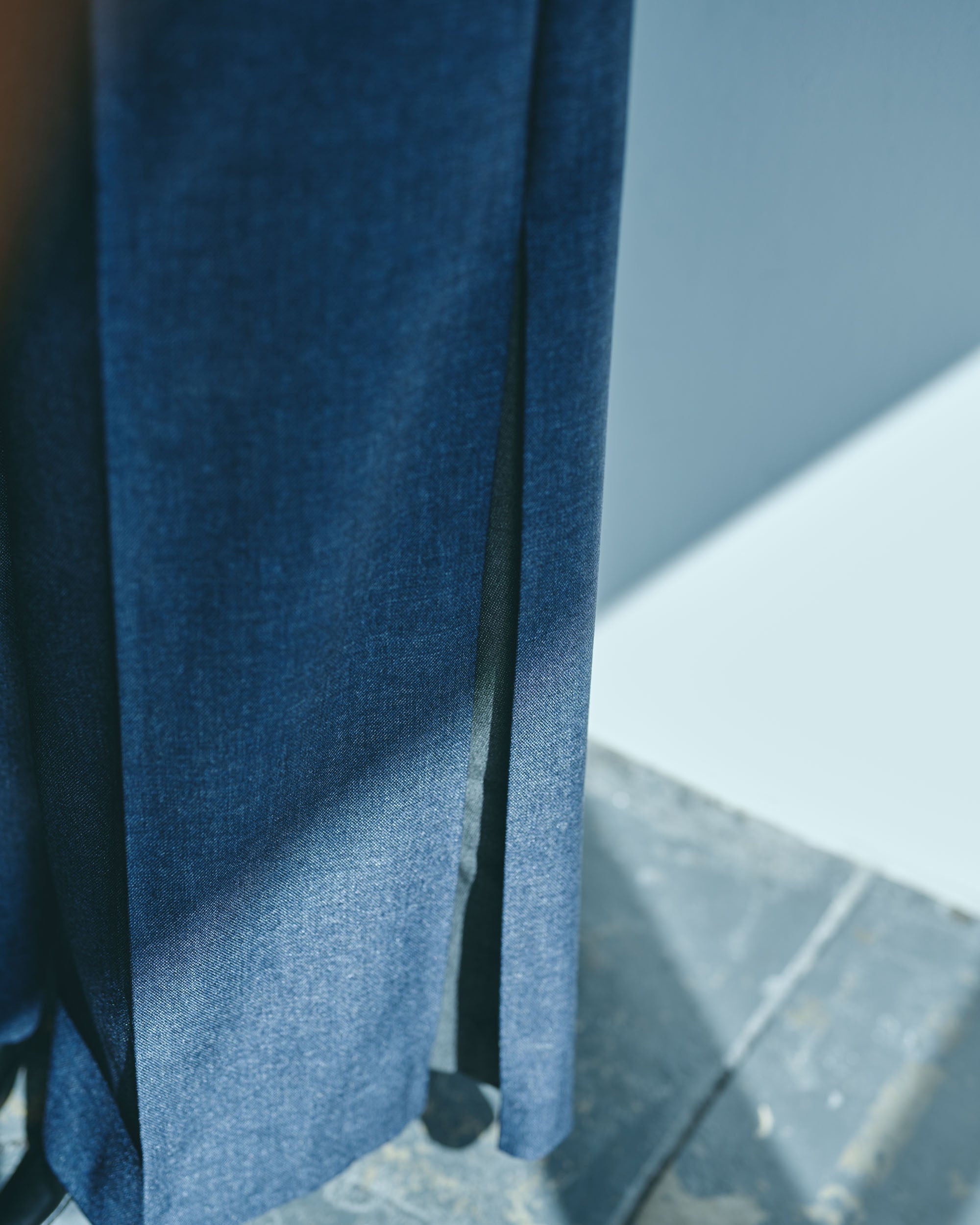 Combining two different denim-like fabrics, this piece is easy to wear for both casual and formal occasions, as well as everyday styles.