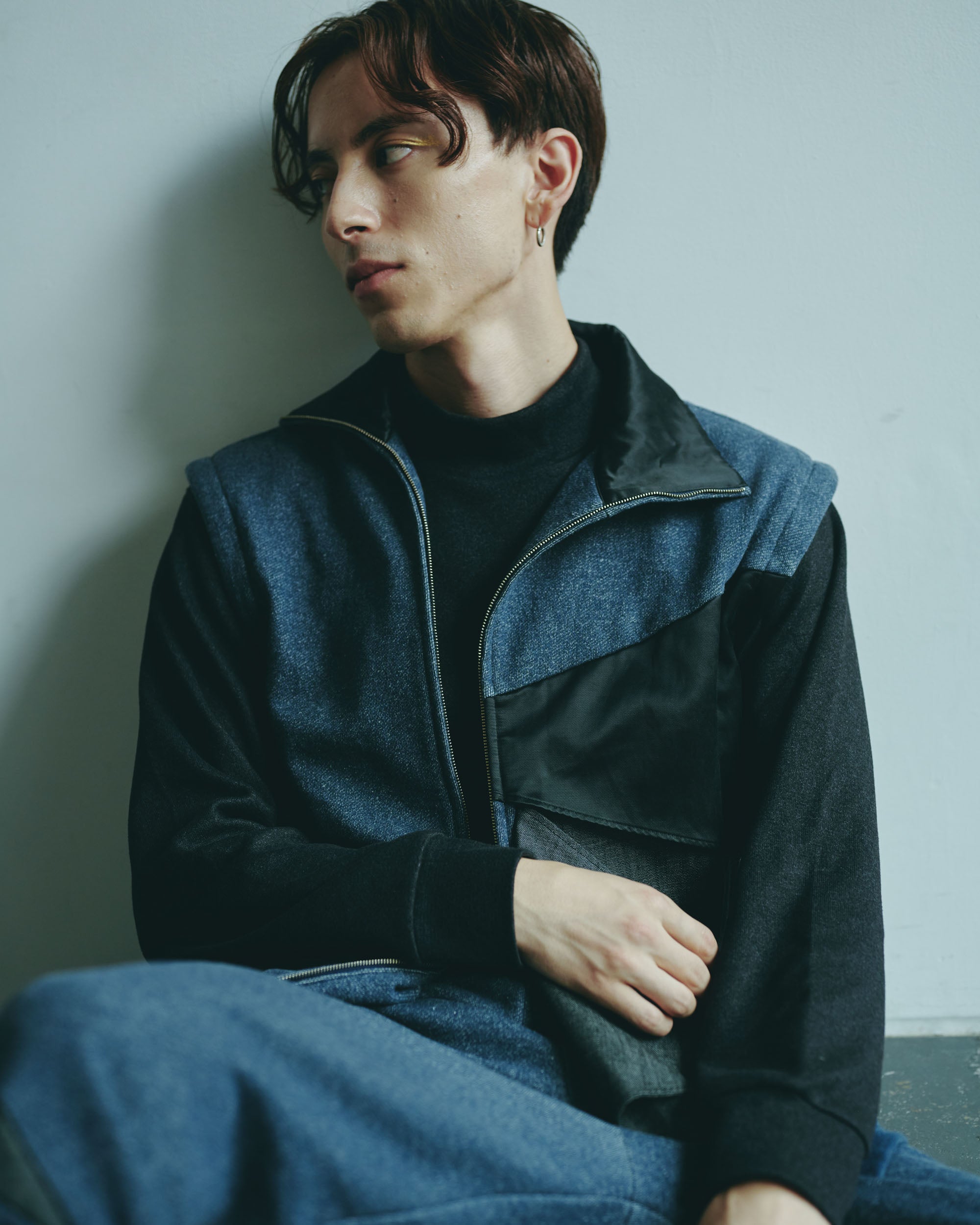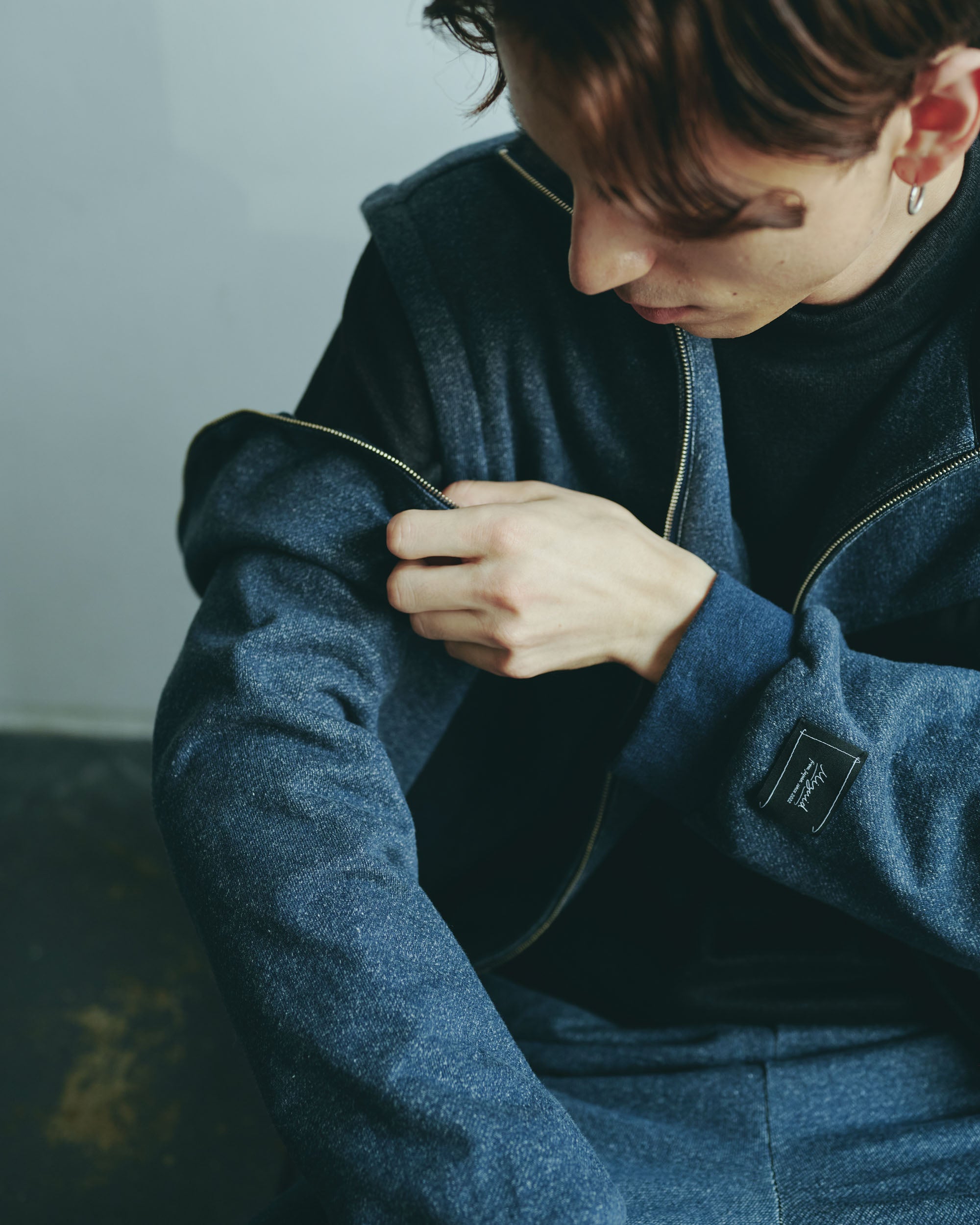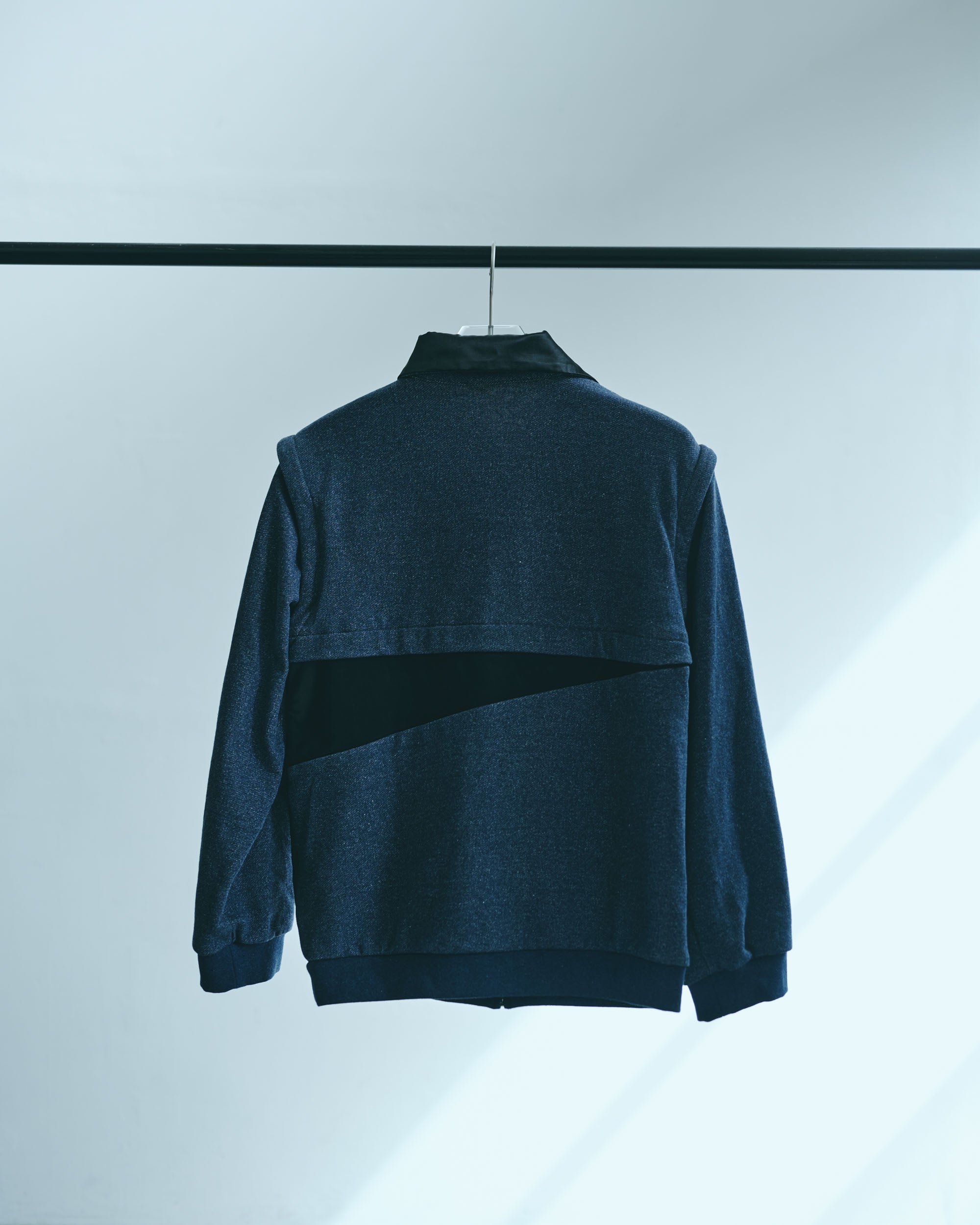 A design zip blouson that can be worn in a variety of styles by removing the sleeves and adjusting the front zipper and buttons.