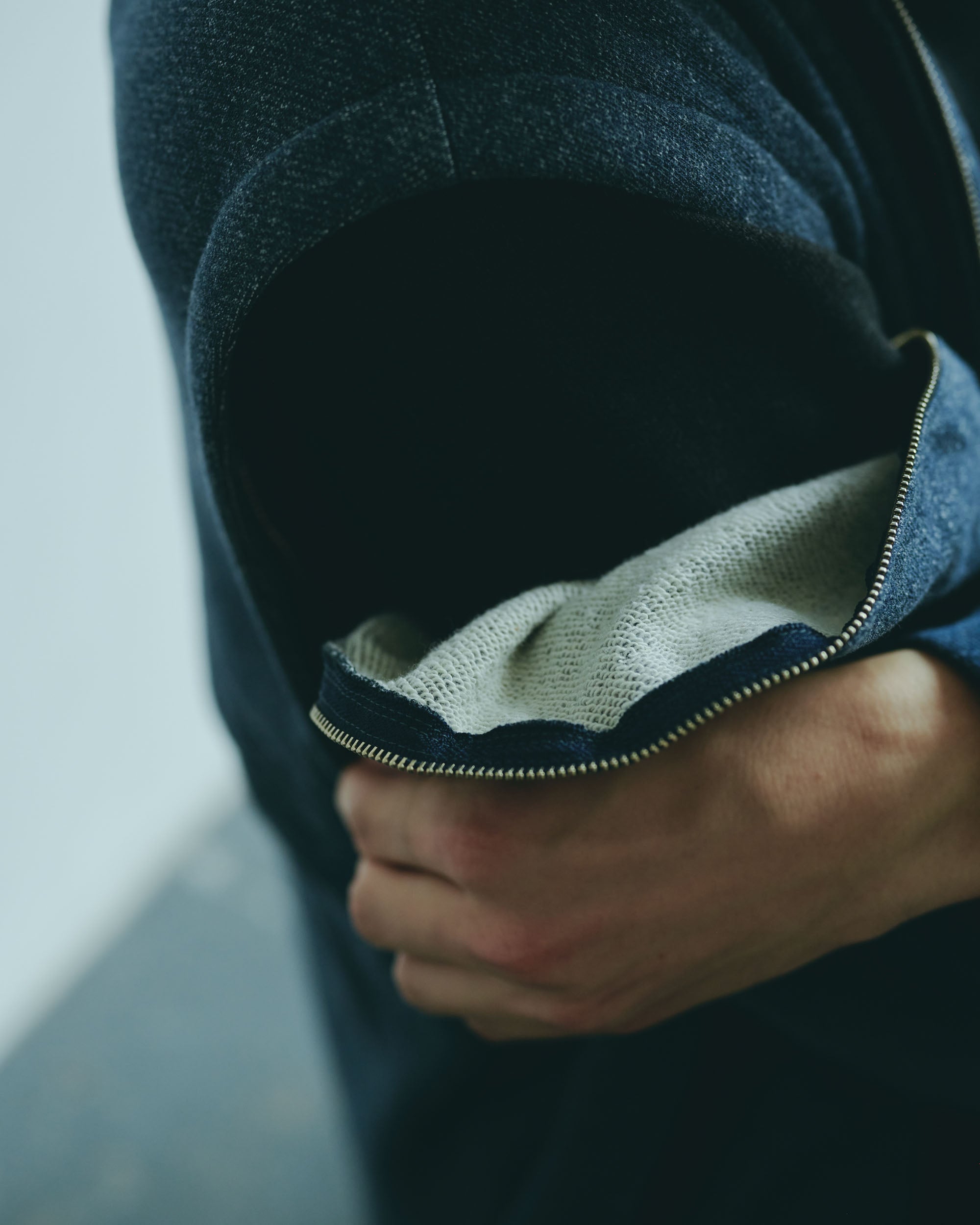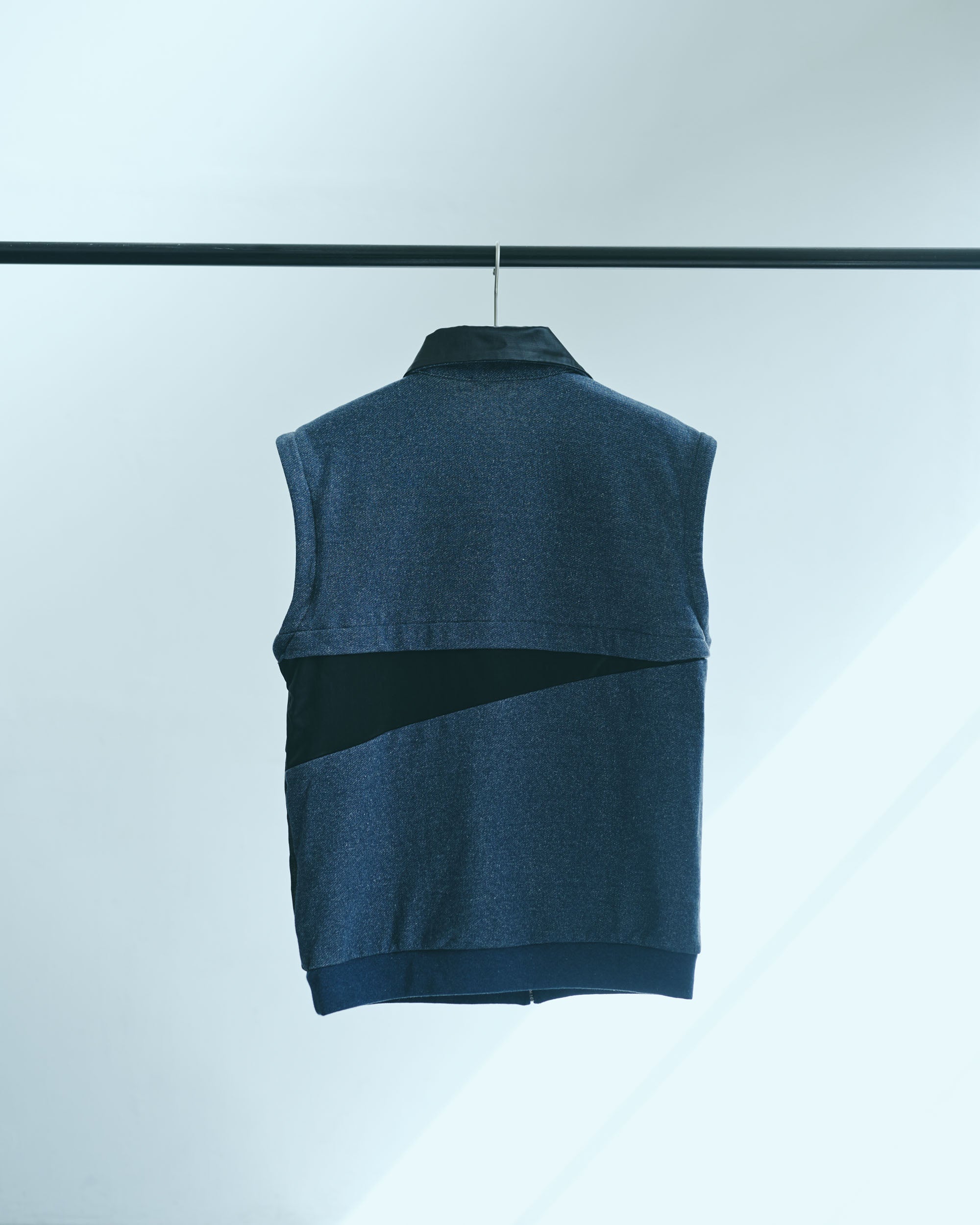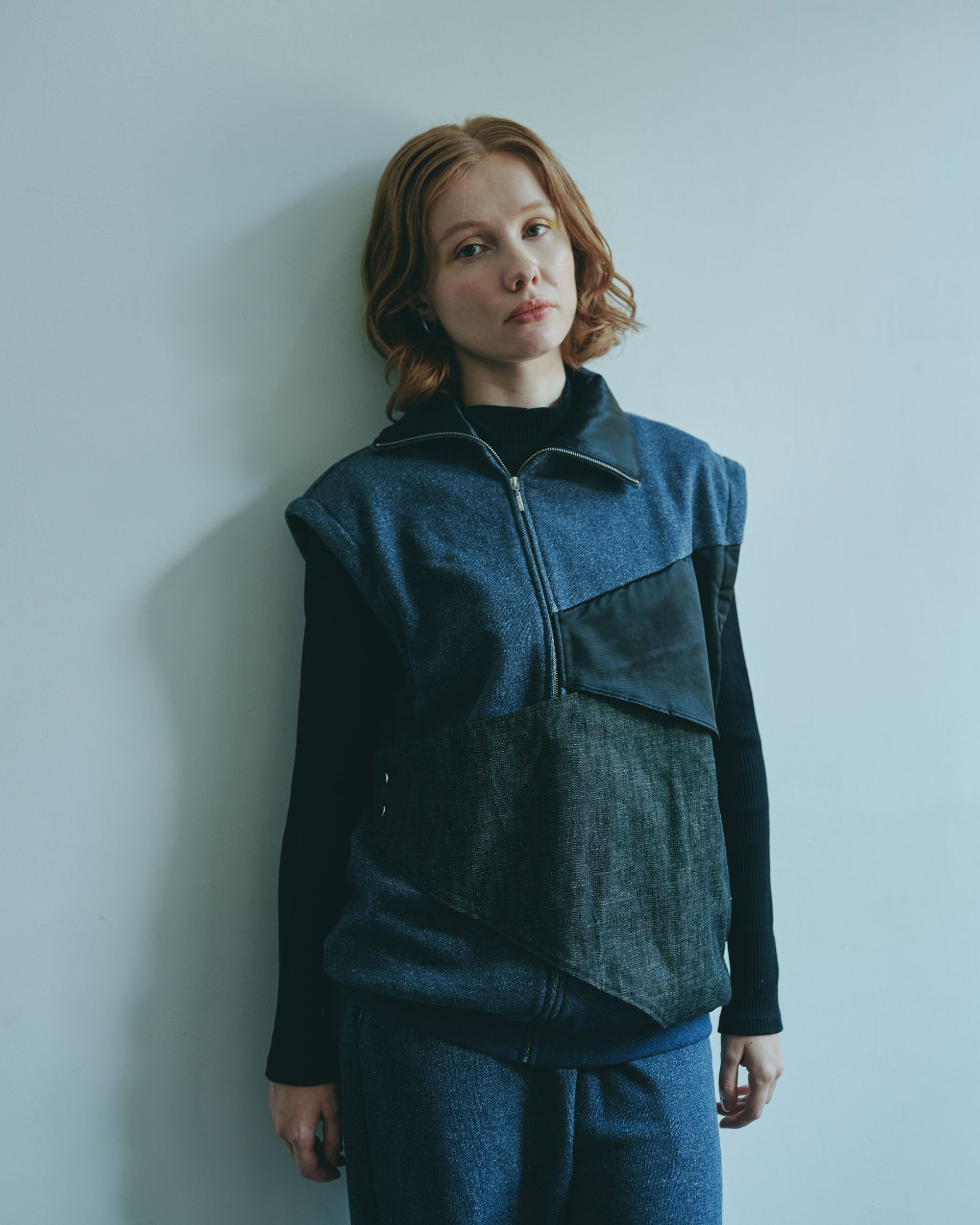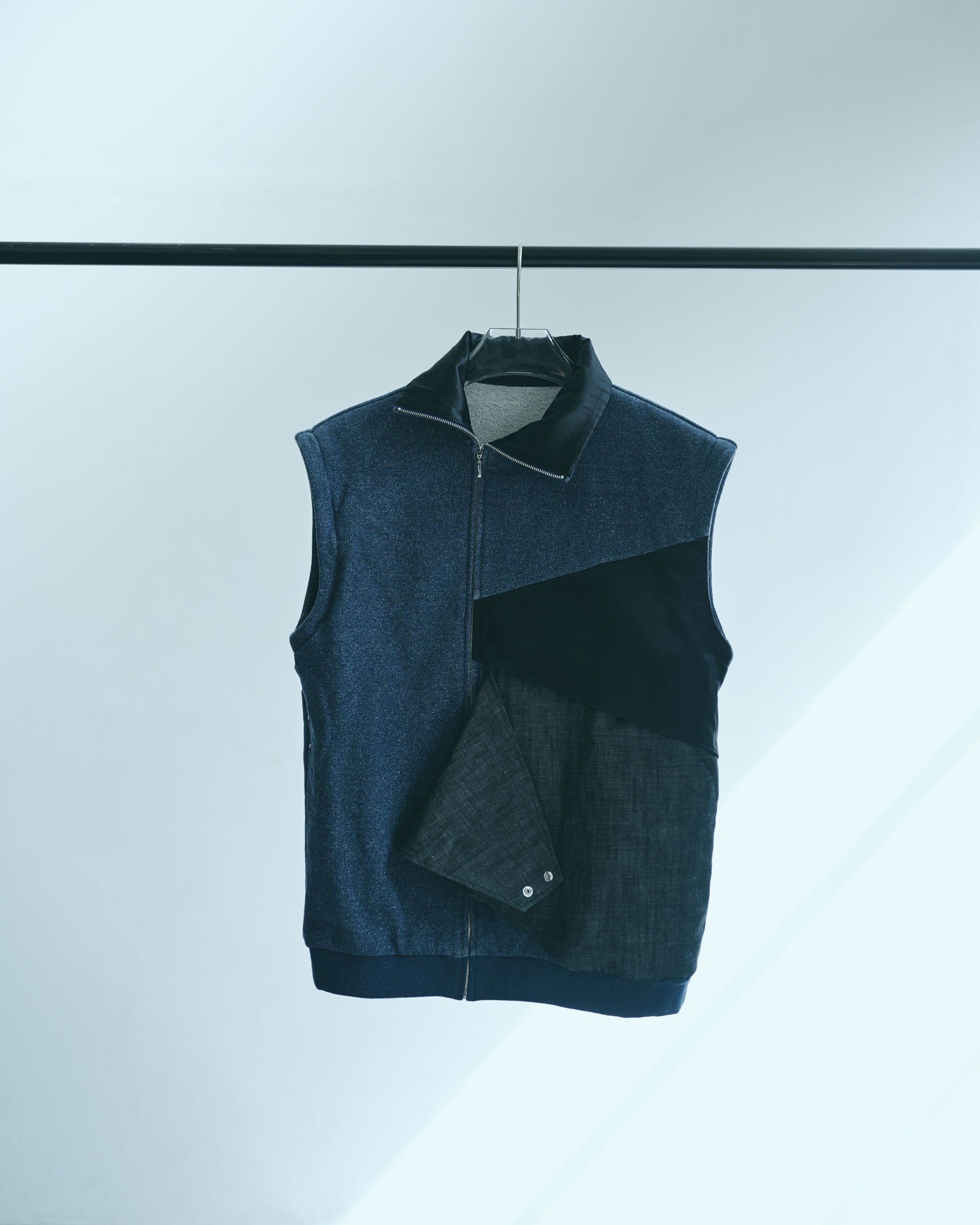 This three-dimensional piece is made from denim-like sweatshirt fabric and layers multiple fabrics with different textures.