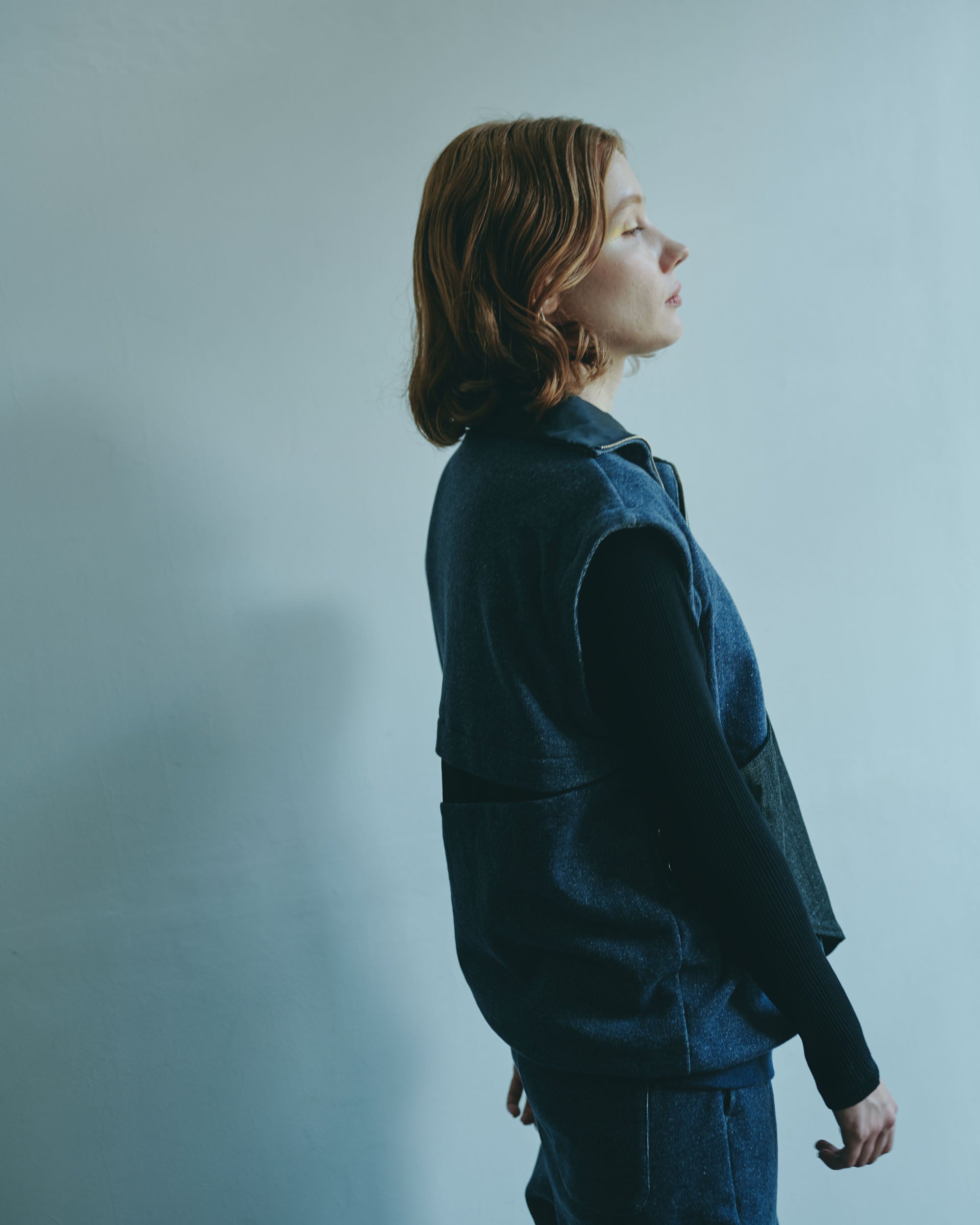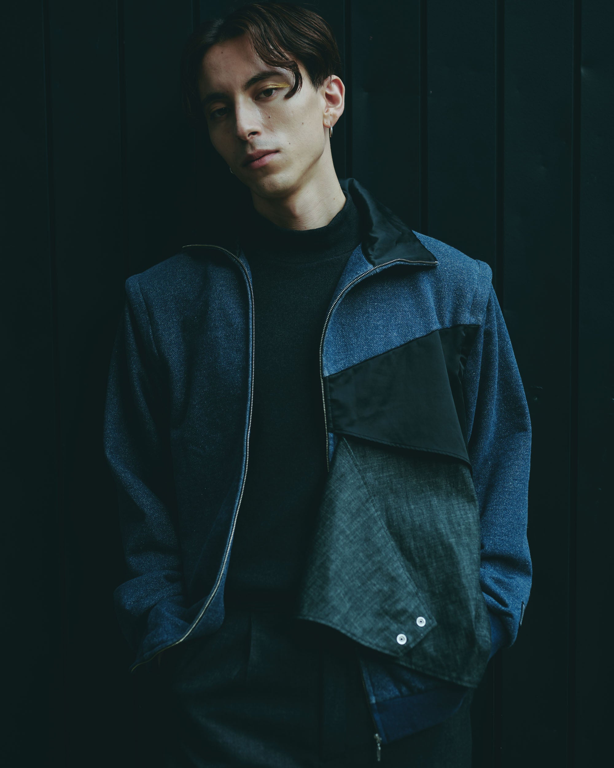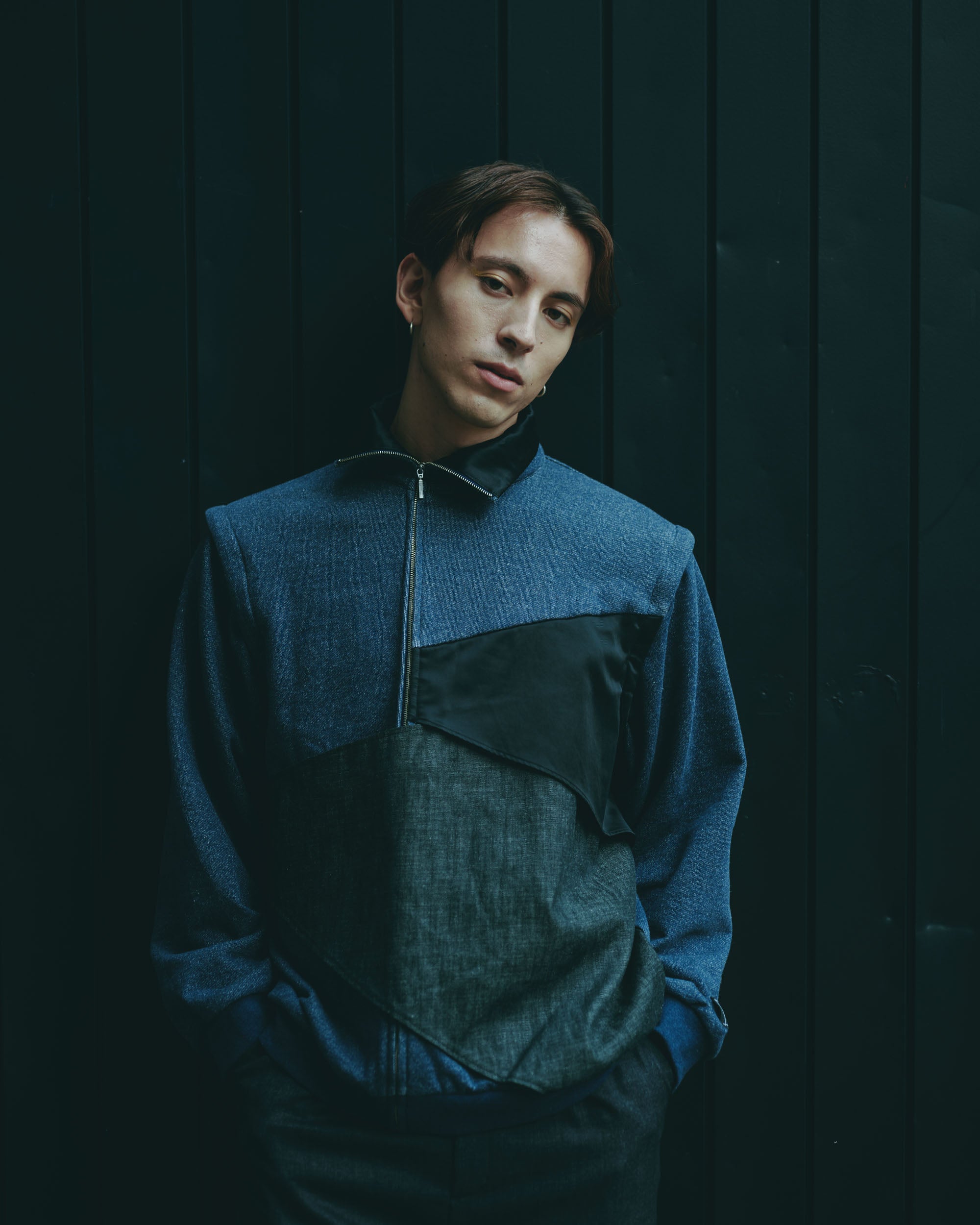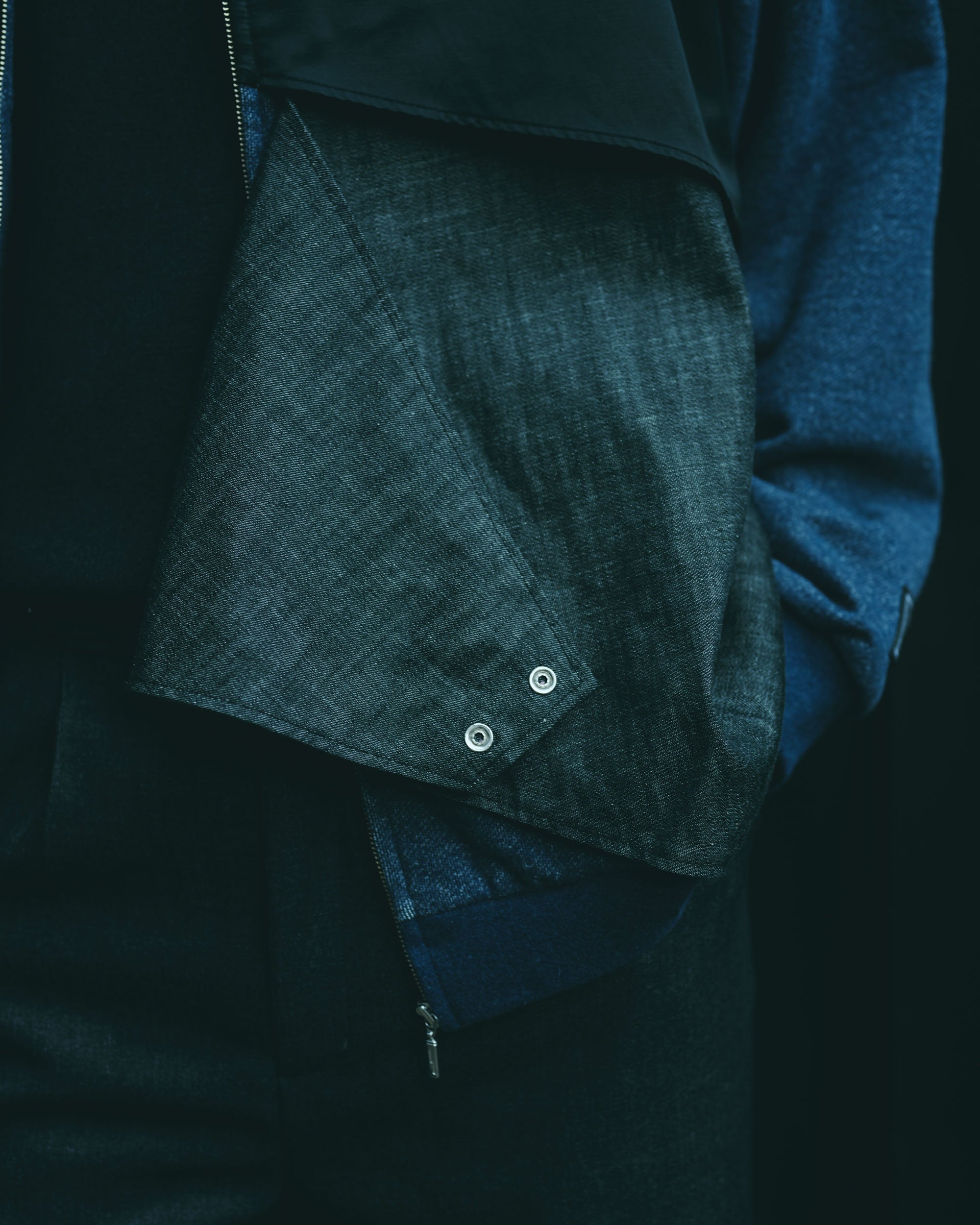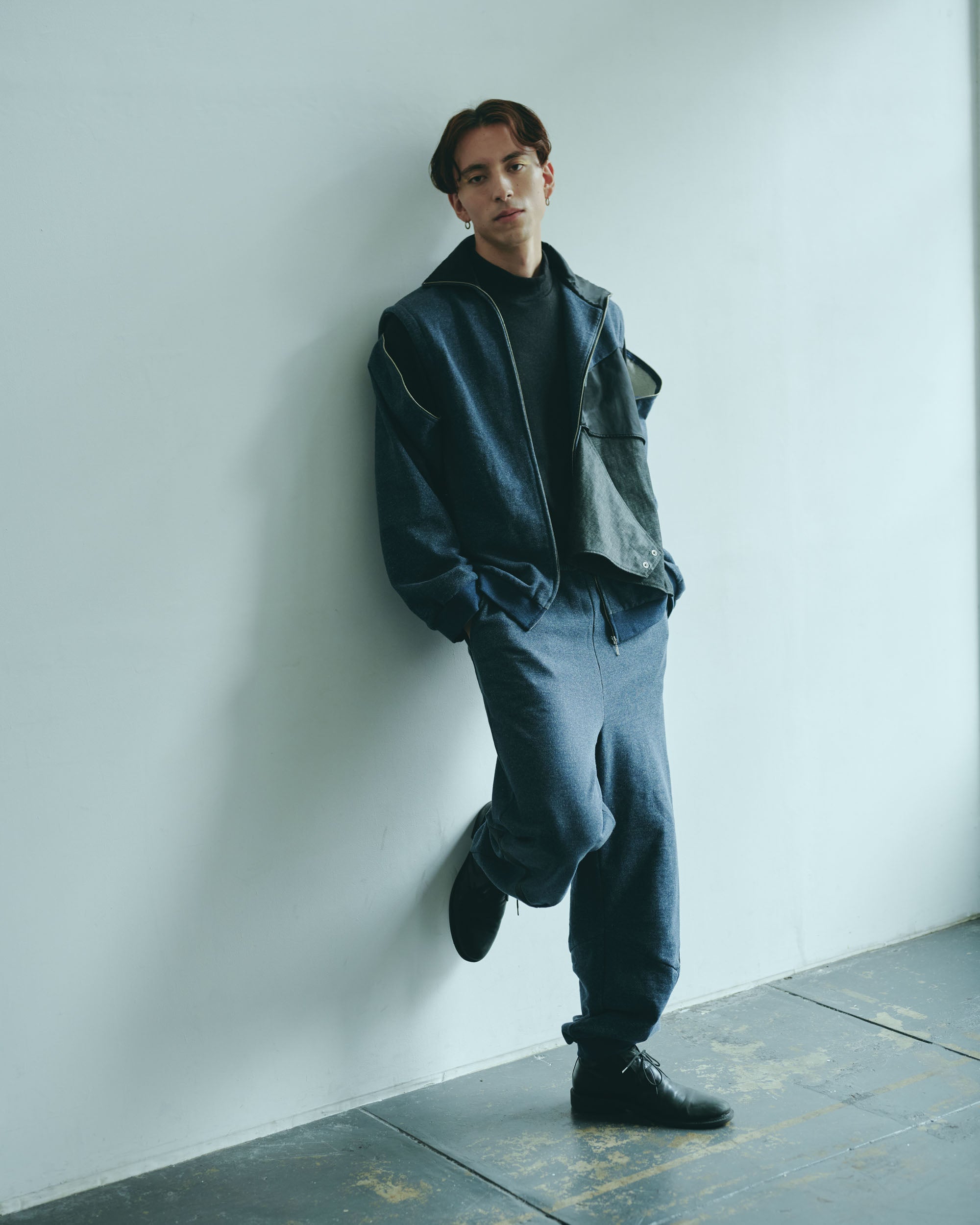This three-dimensional piece is made from denim-like sweatshirt fabric and layers multiple fabrics with different textures.
