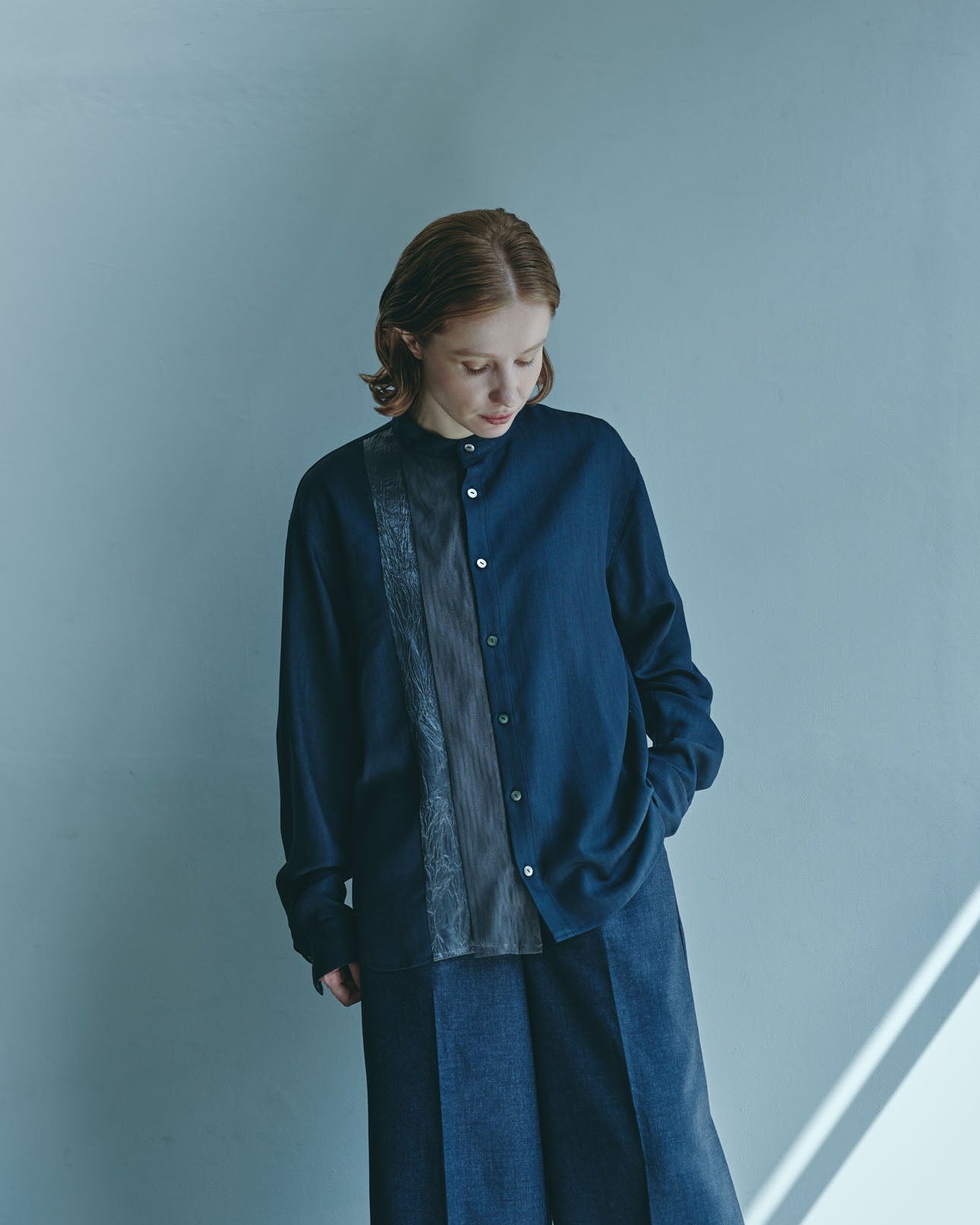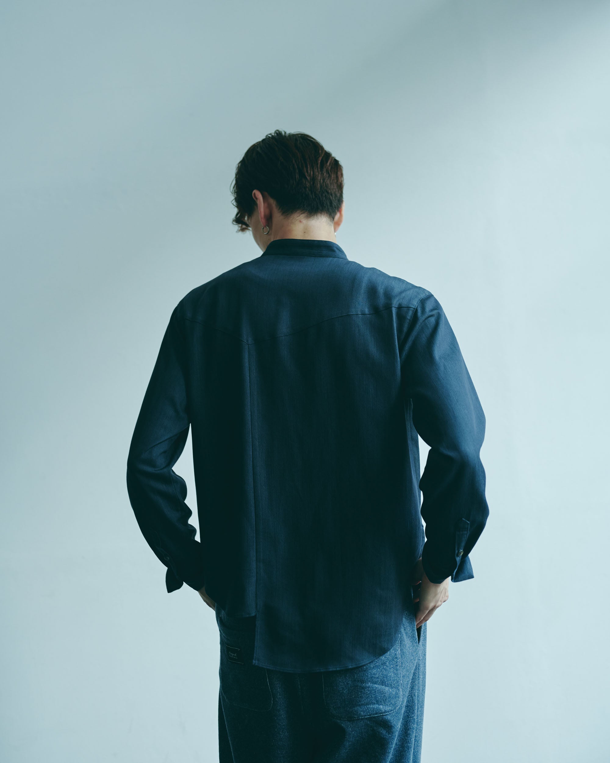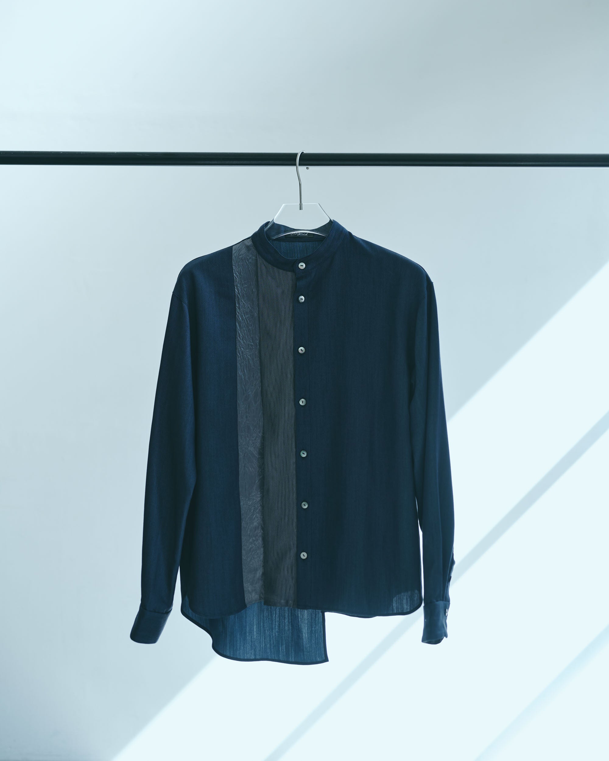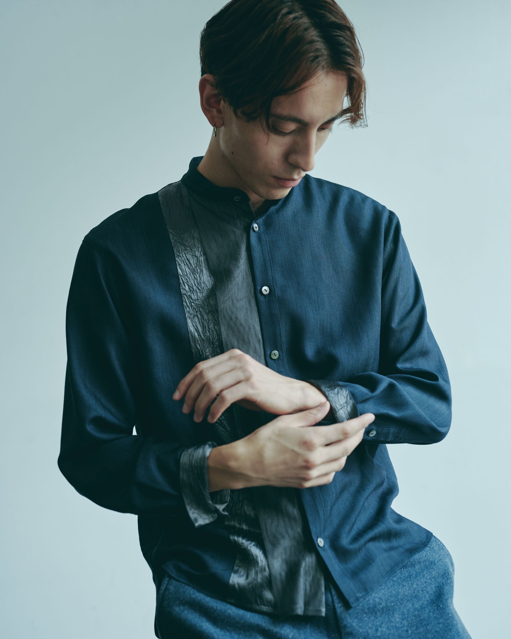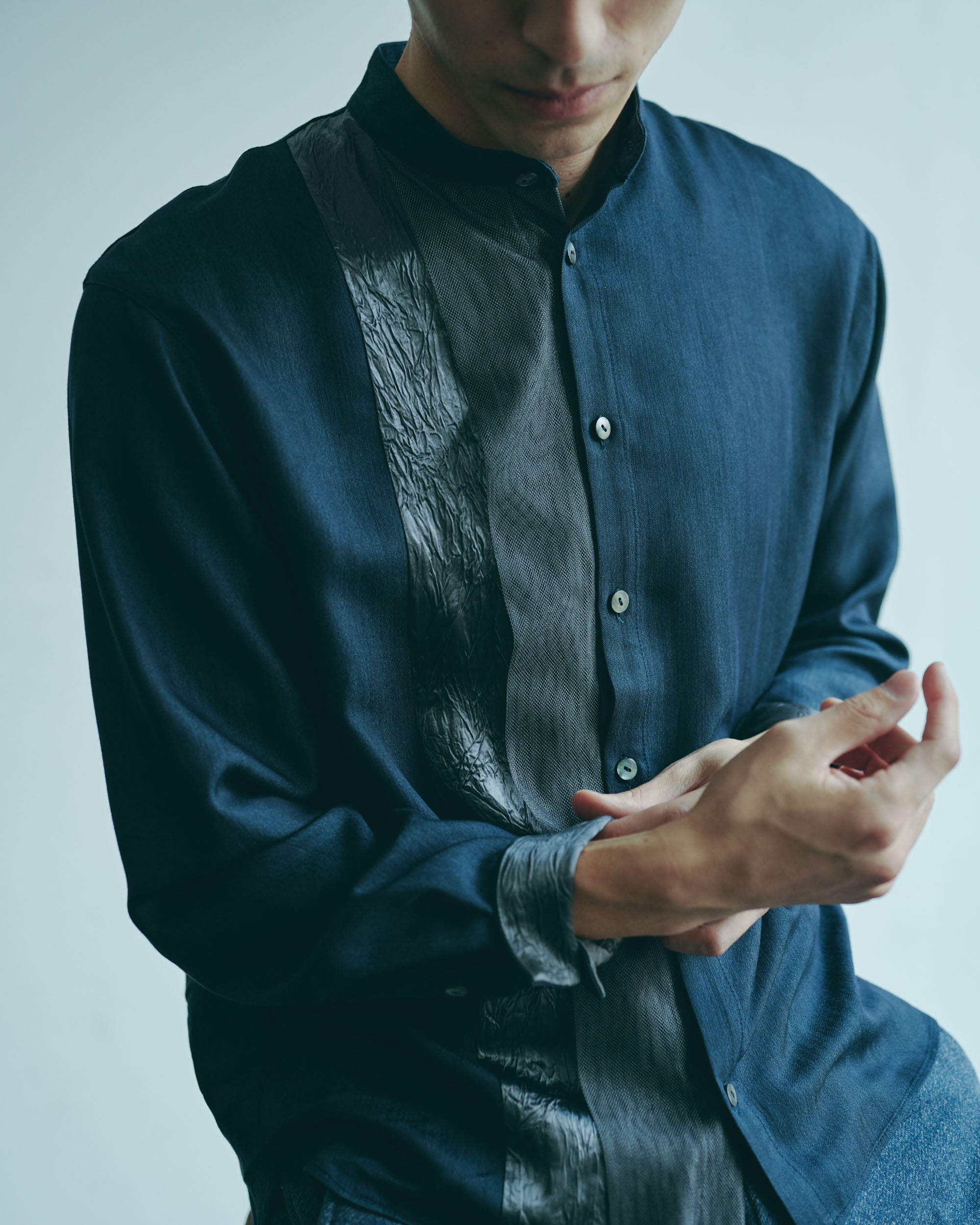 A band collar shirt with a design that combines a denim-like, casual texture with an elegant sheen.