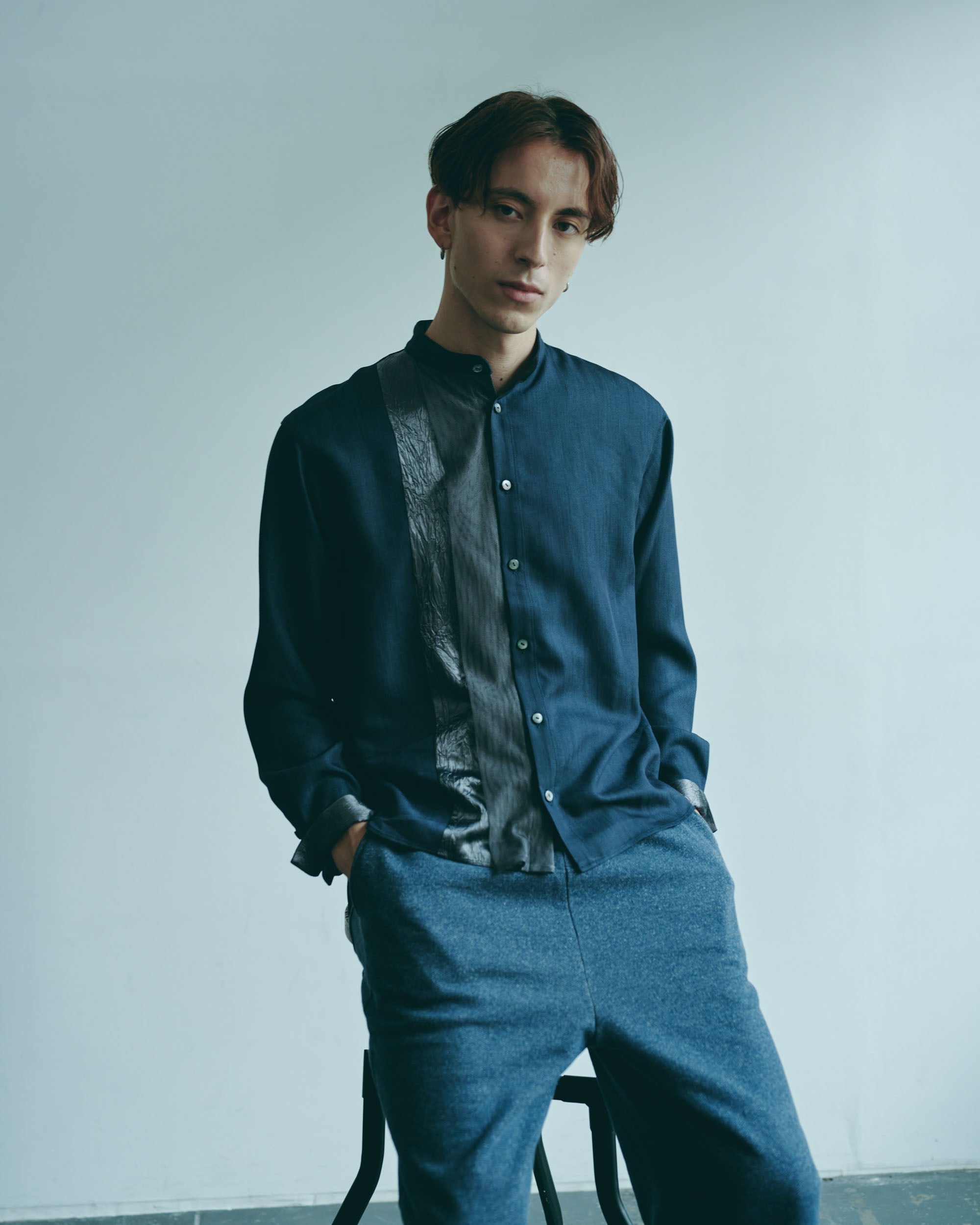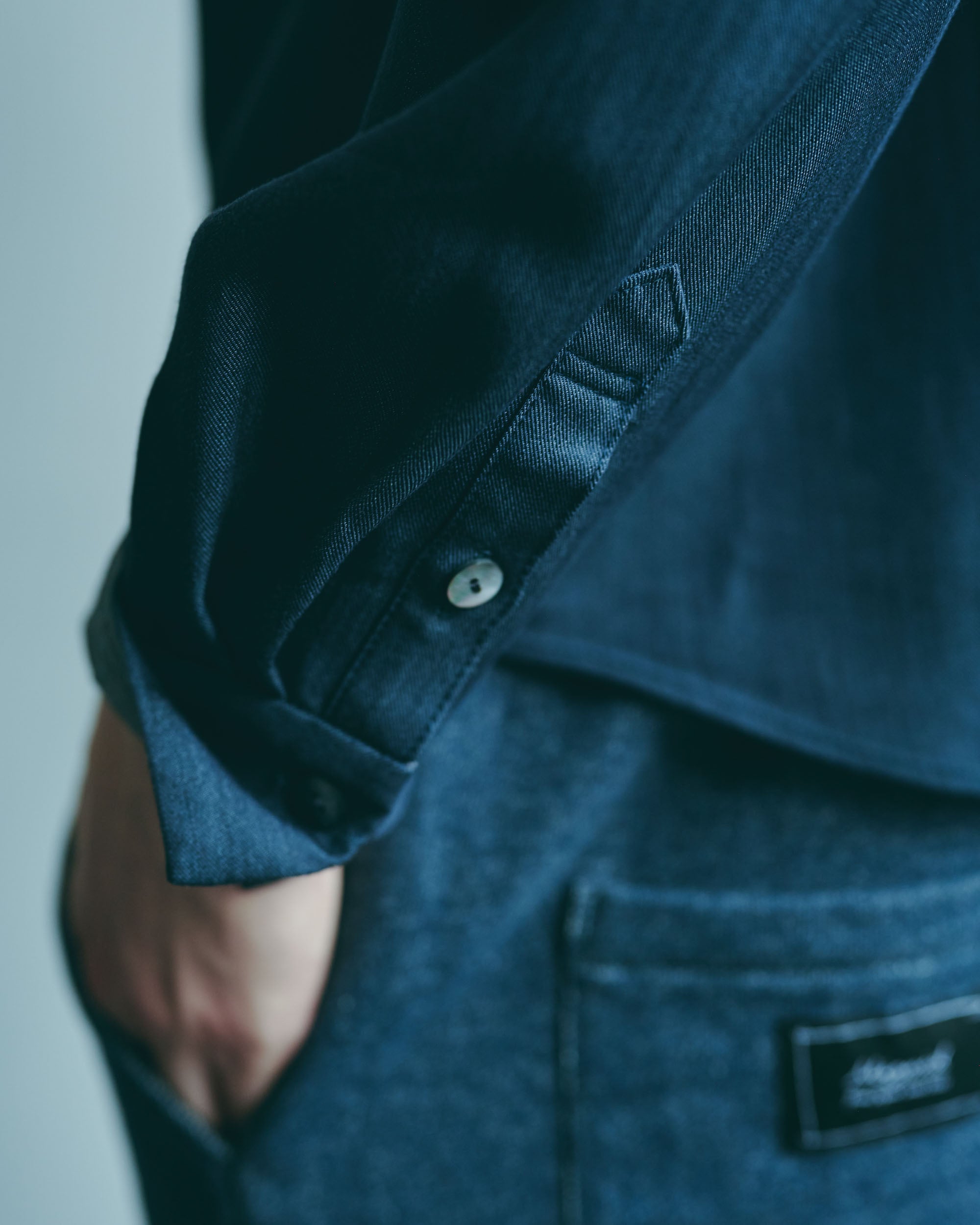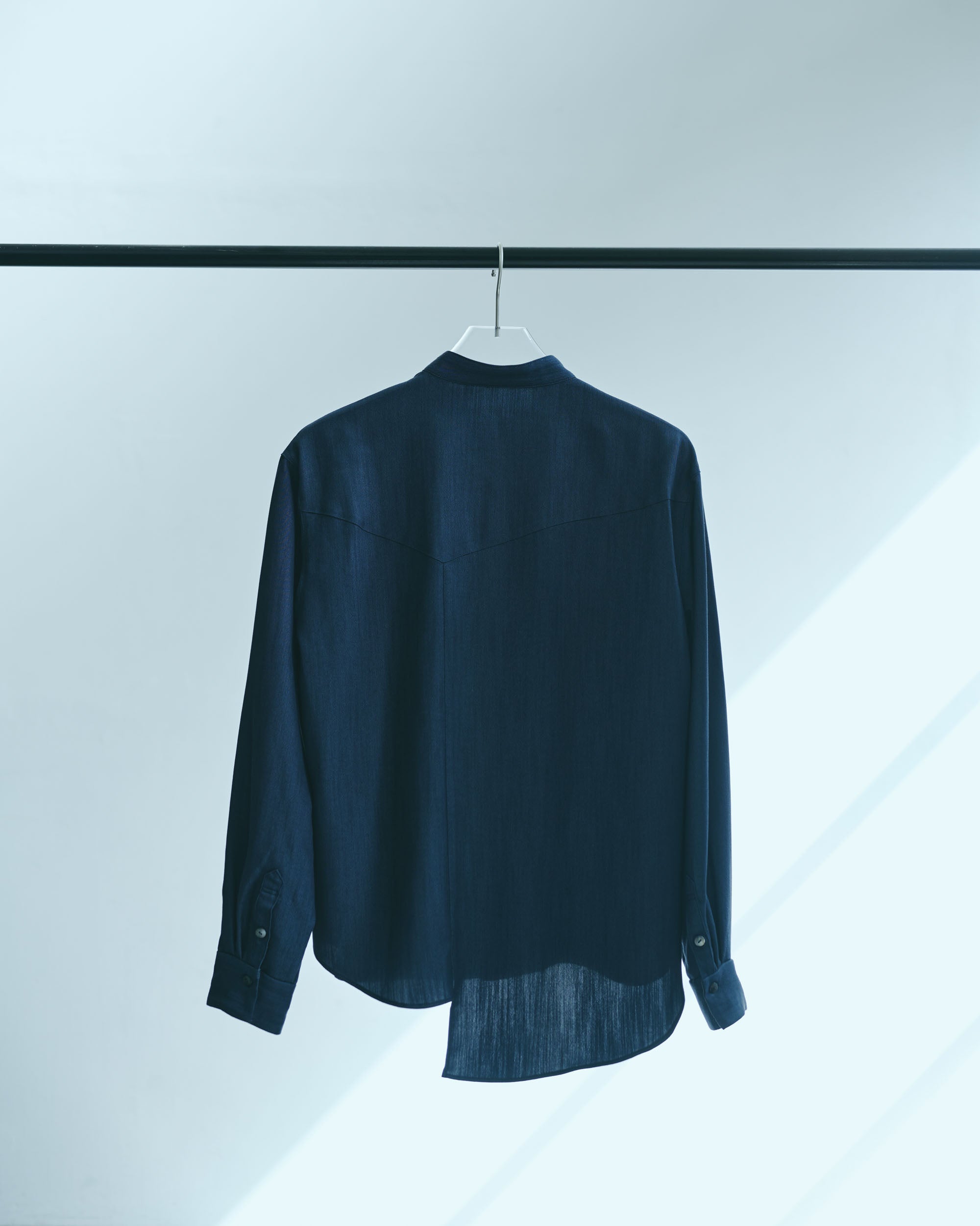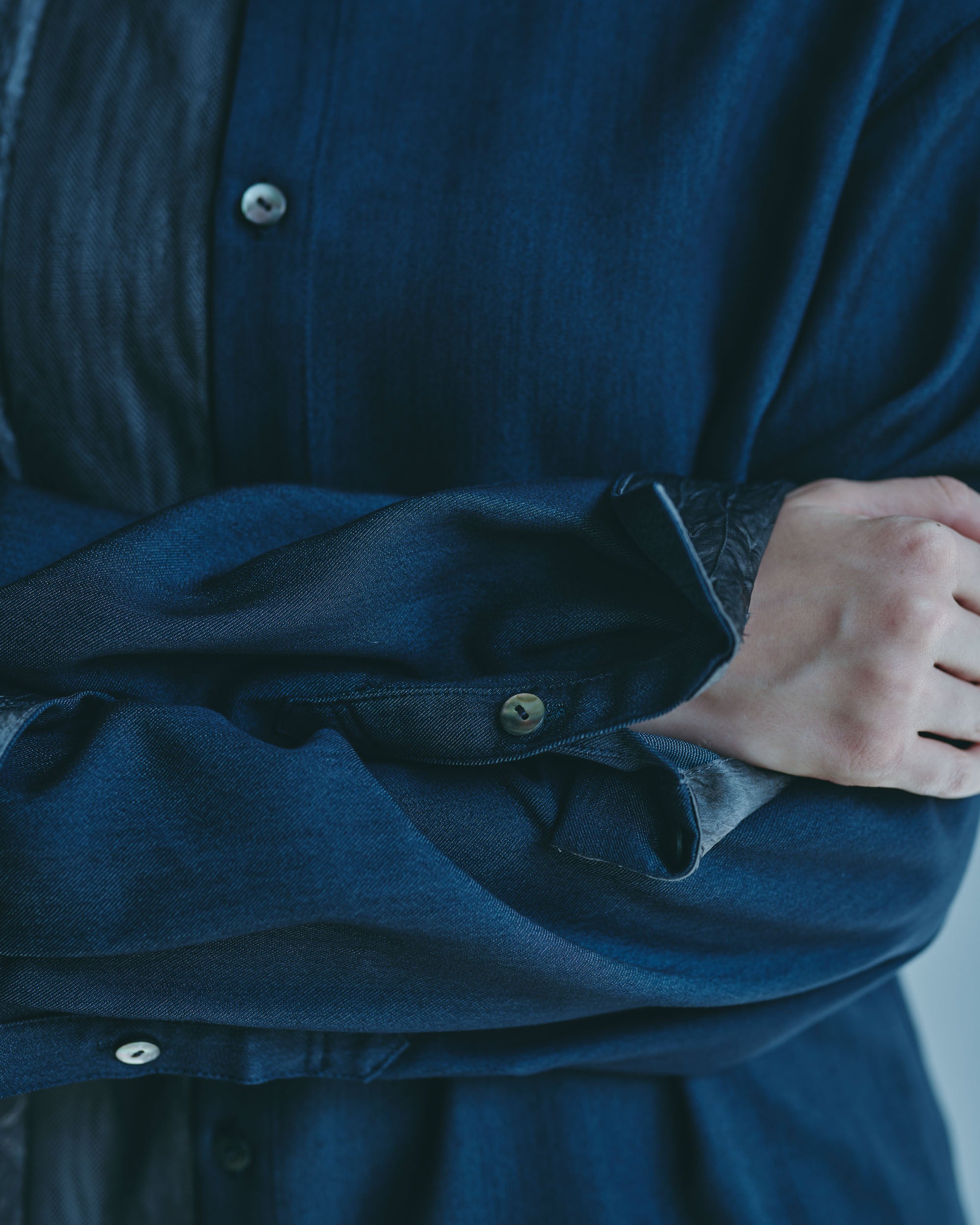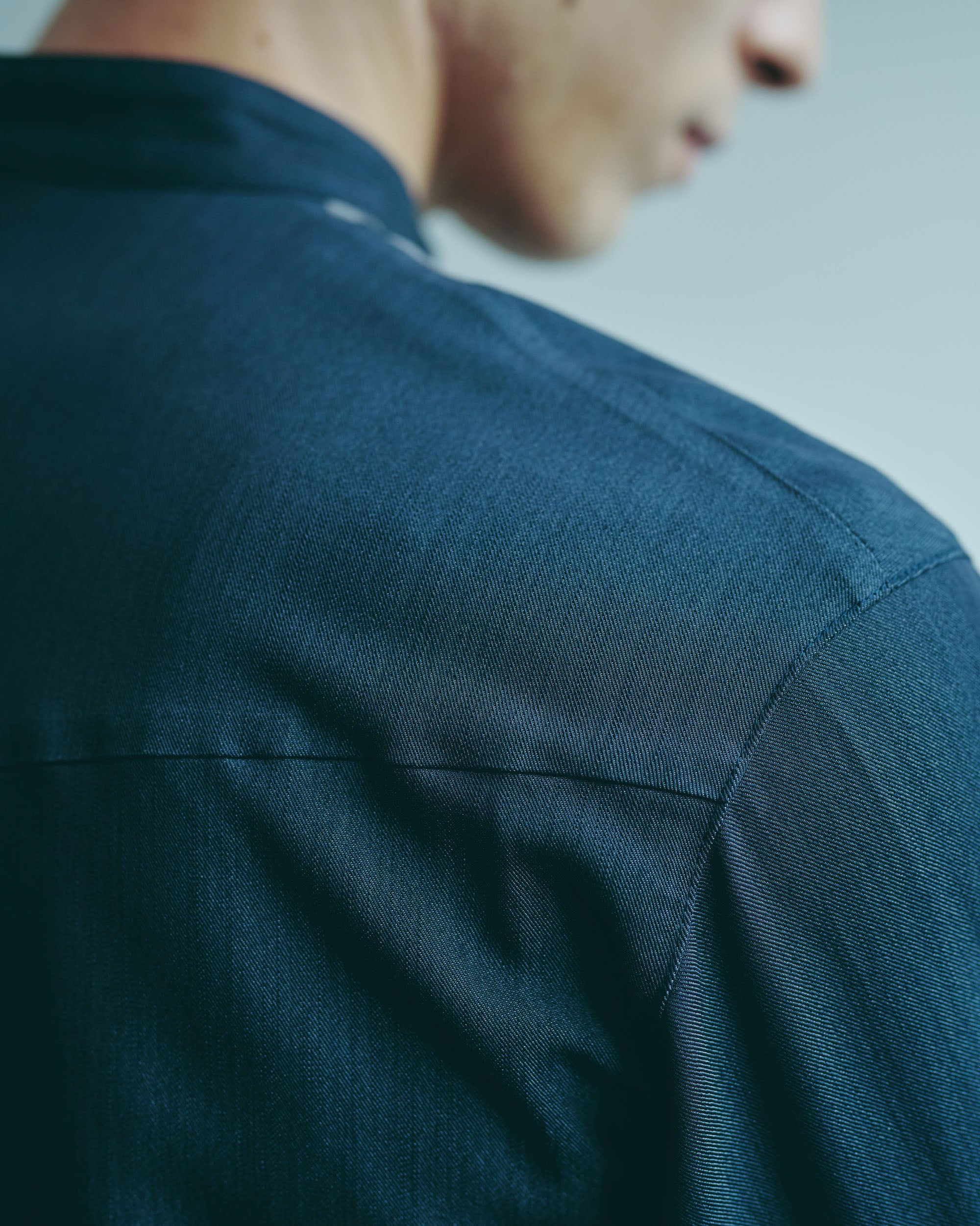 A band collar shirt with a design that combines a denim-like, casual texture with an elegant sheen.