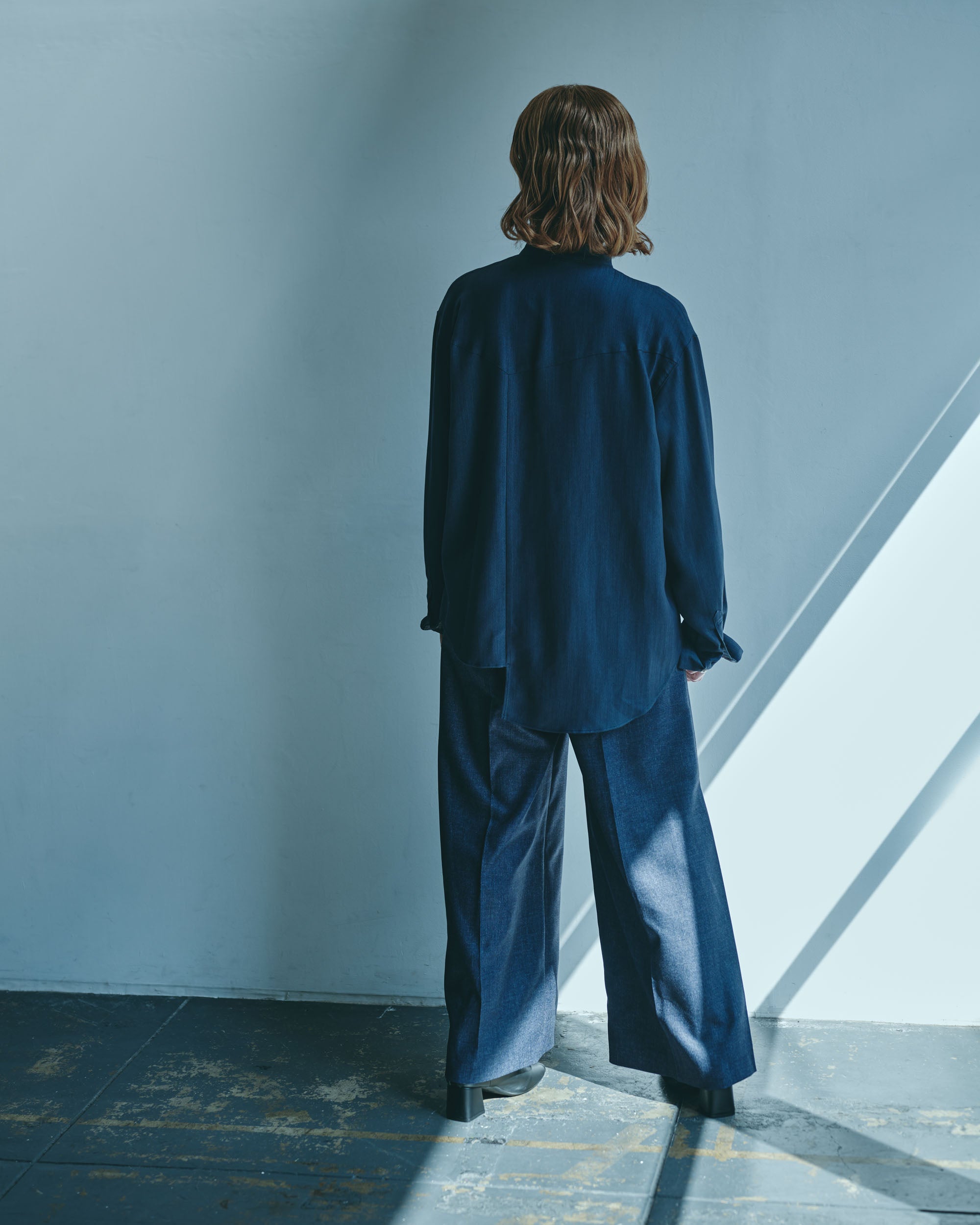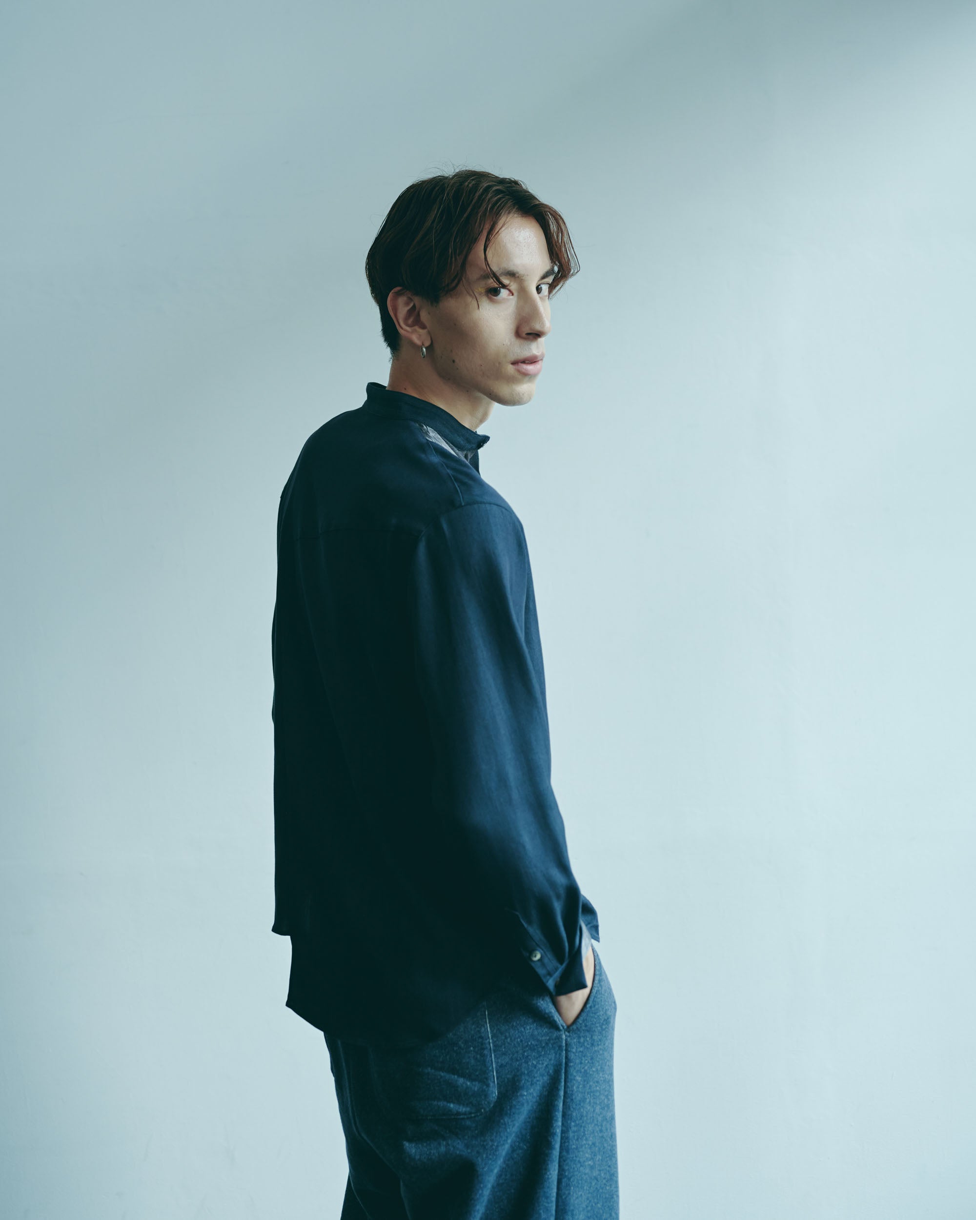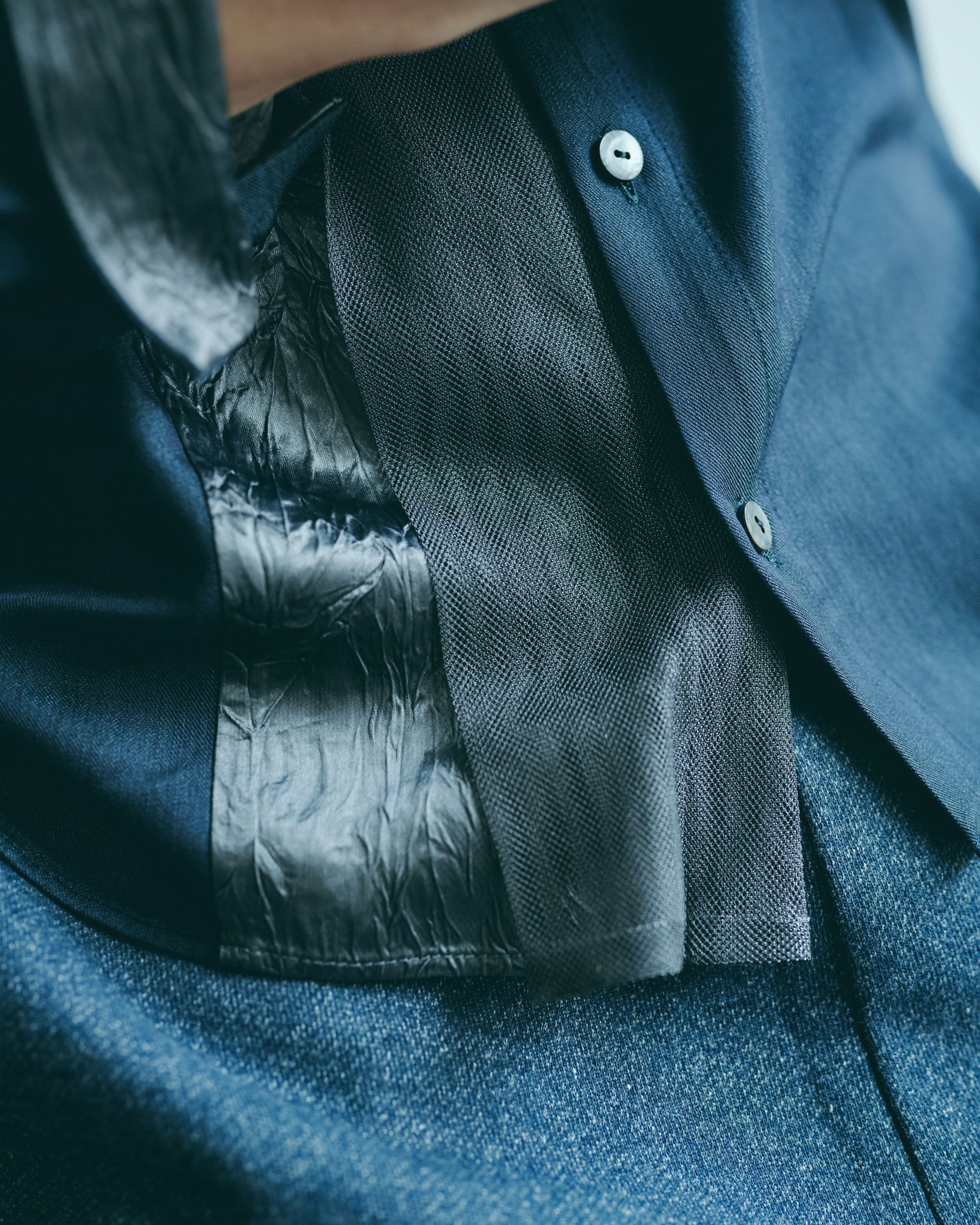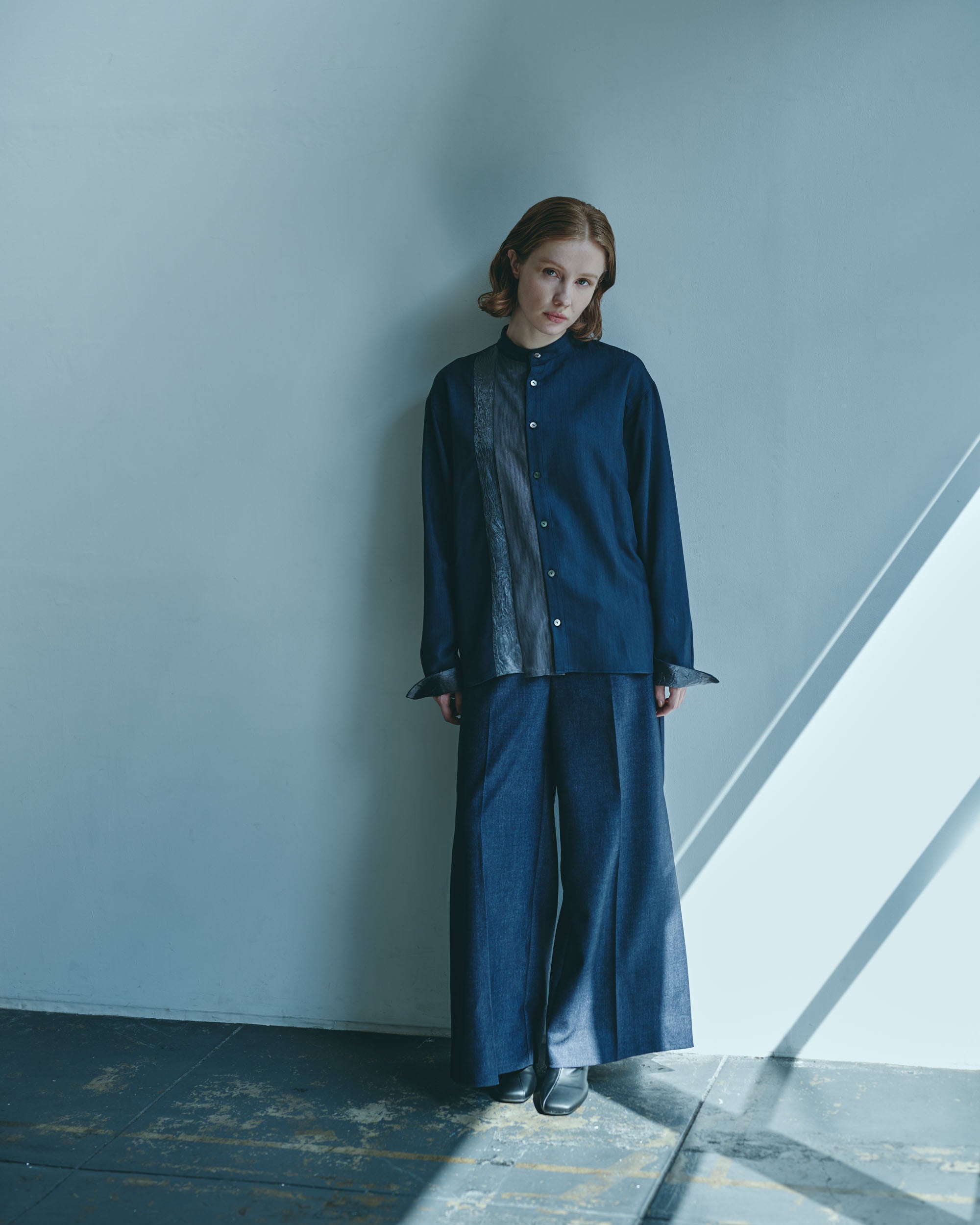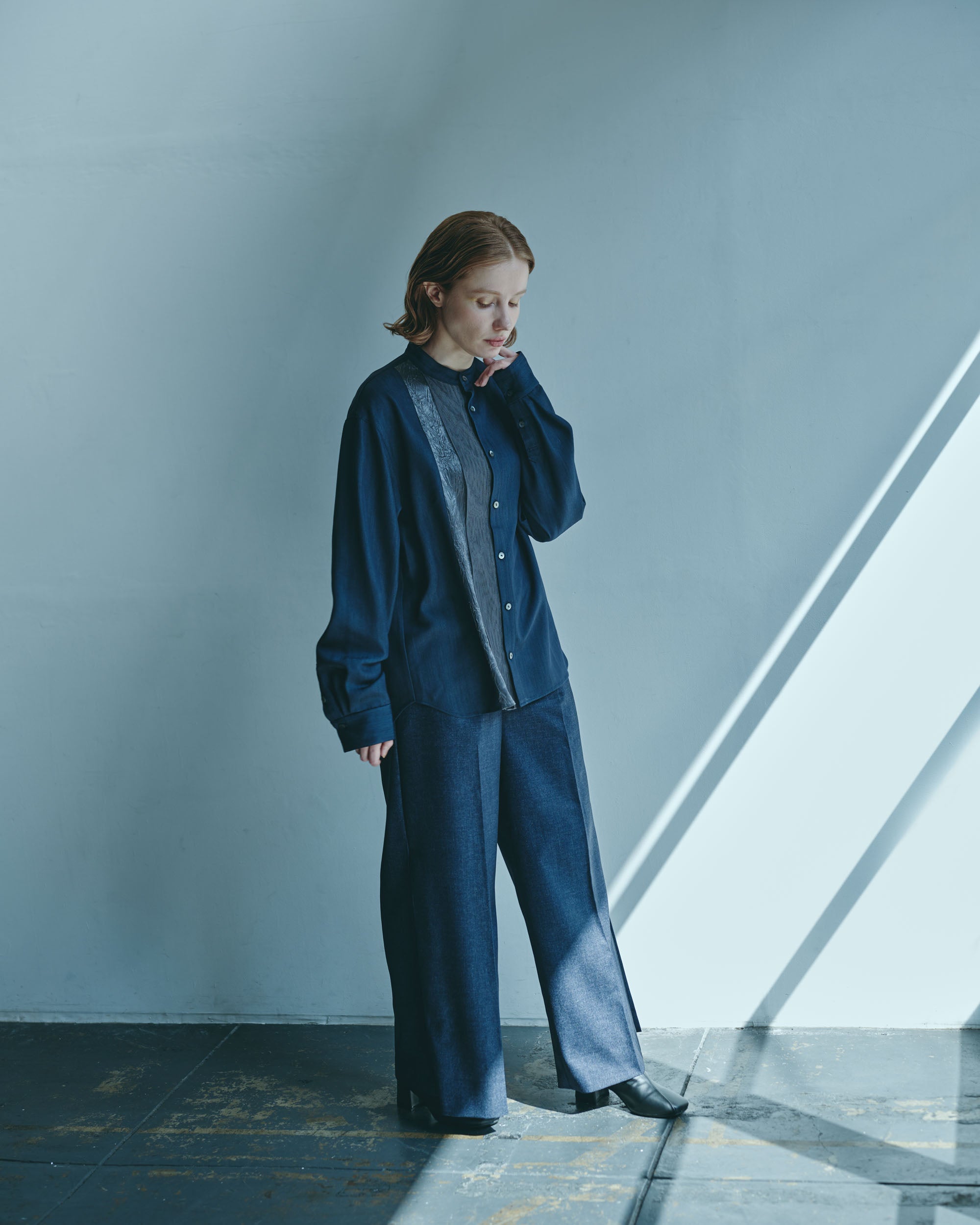 A band collar shirt with a design that combines a denim-like, casual texture with an elegant sheen.
