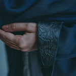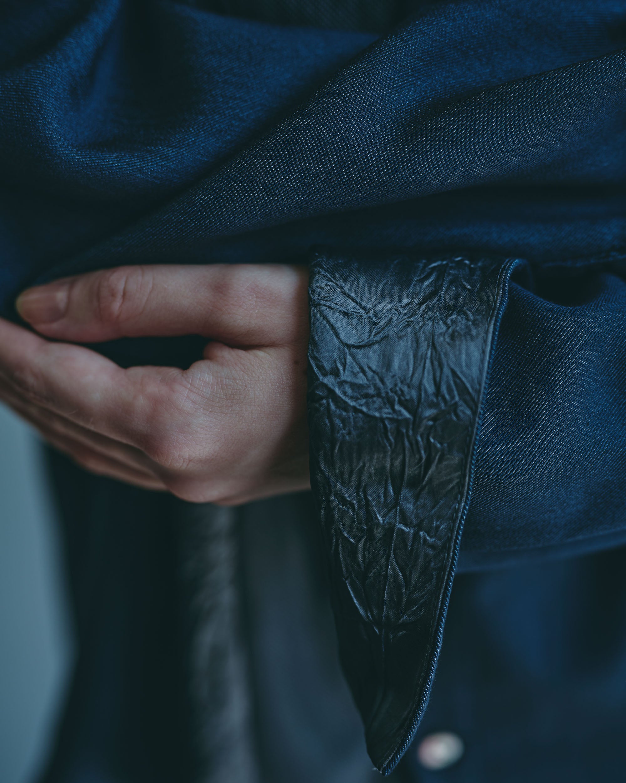 This piece is full of originality with detailed design details such as an asymmetrical back style and the use of different materials on the inside of the cuffs.