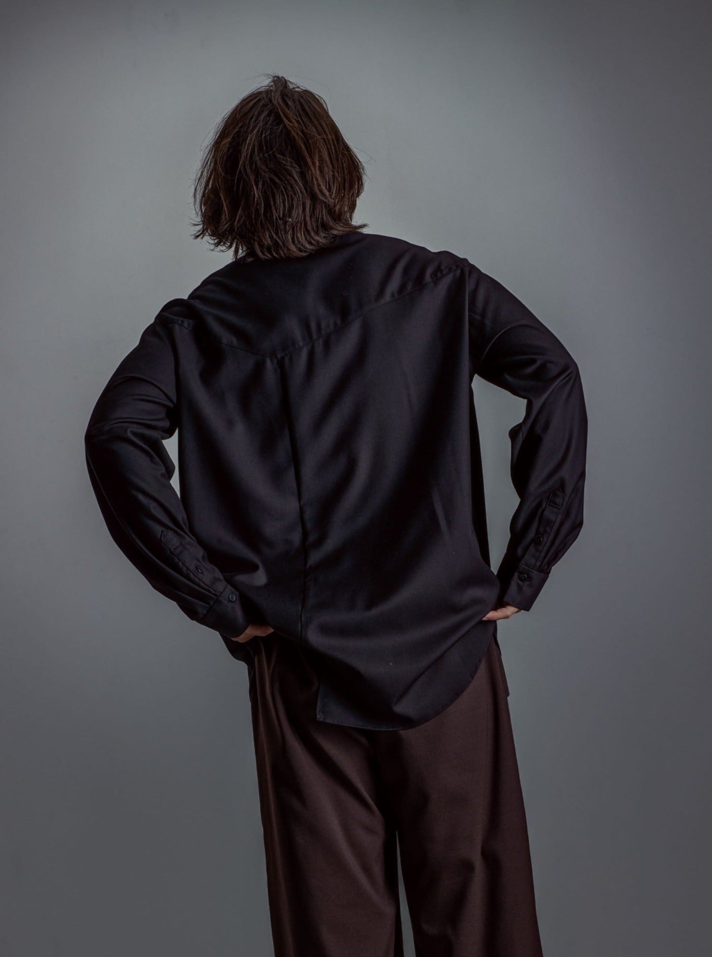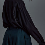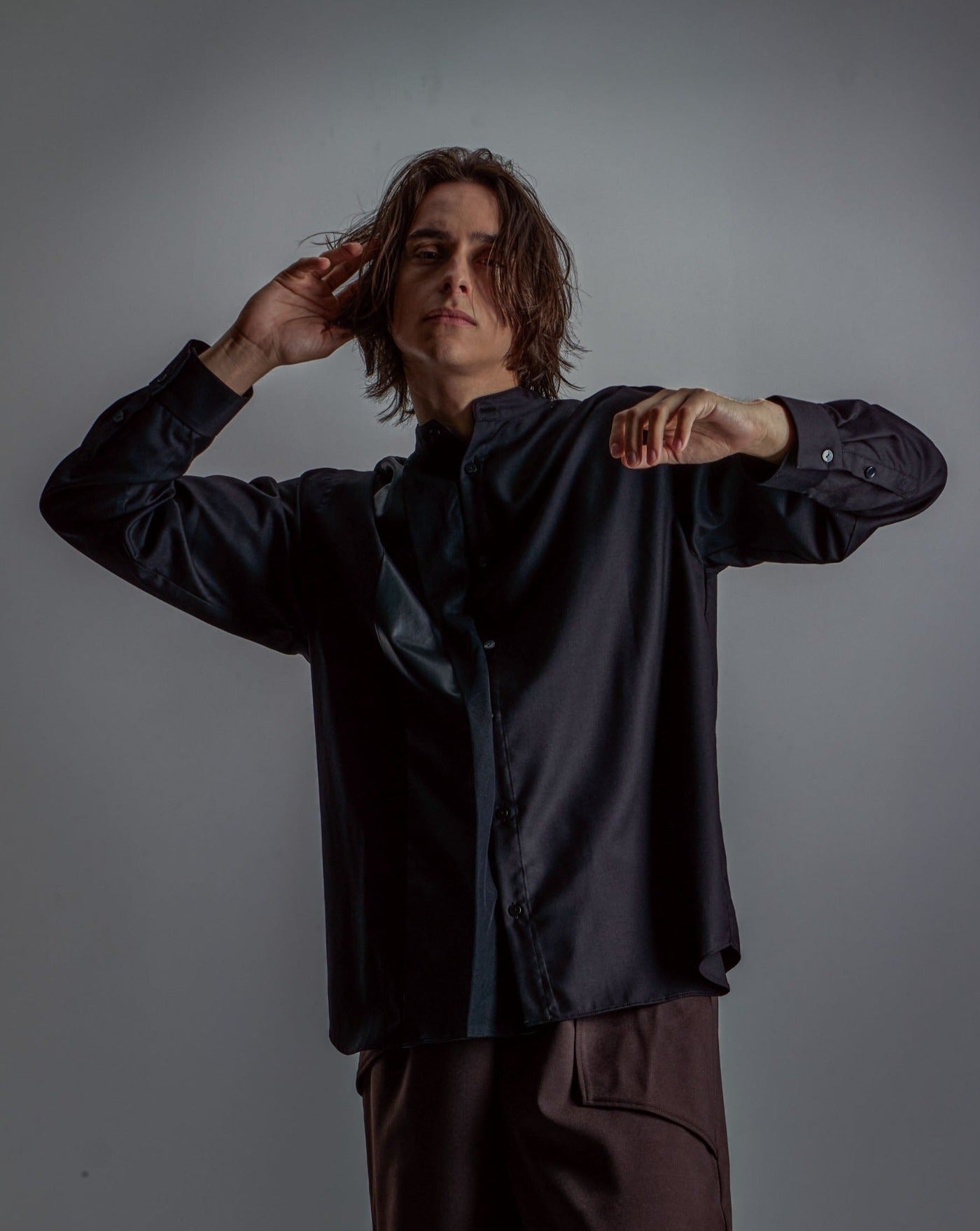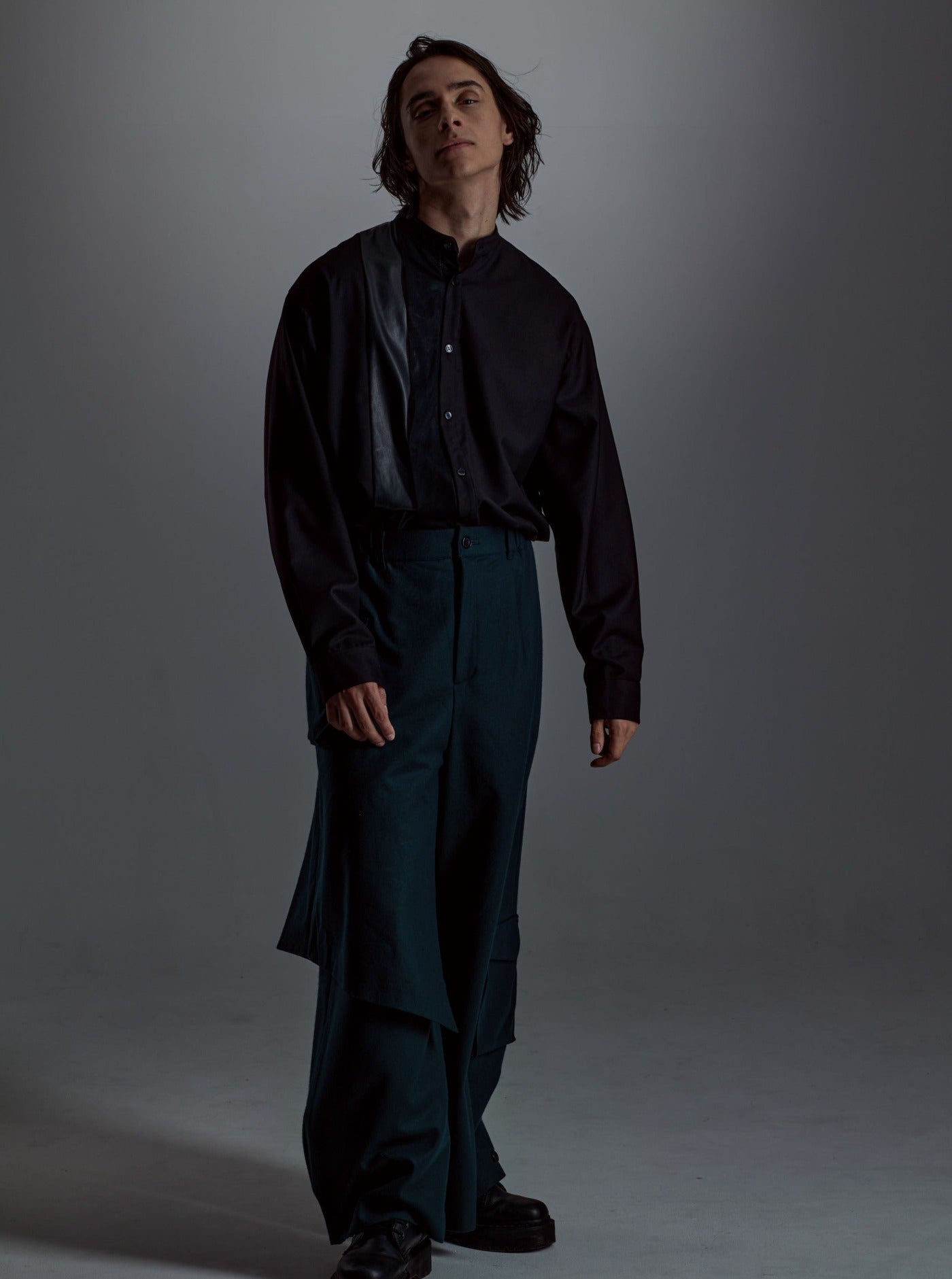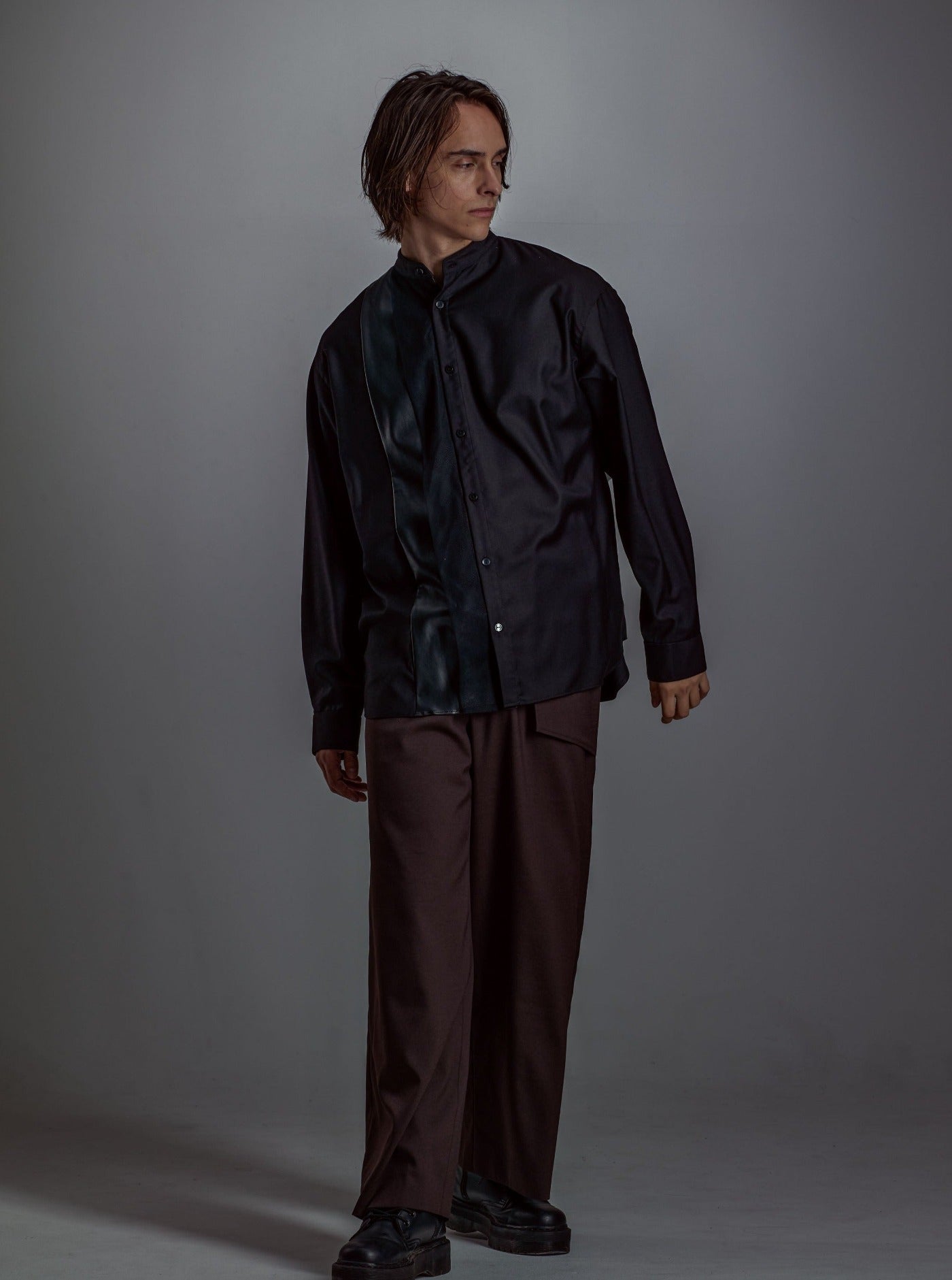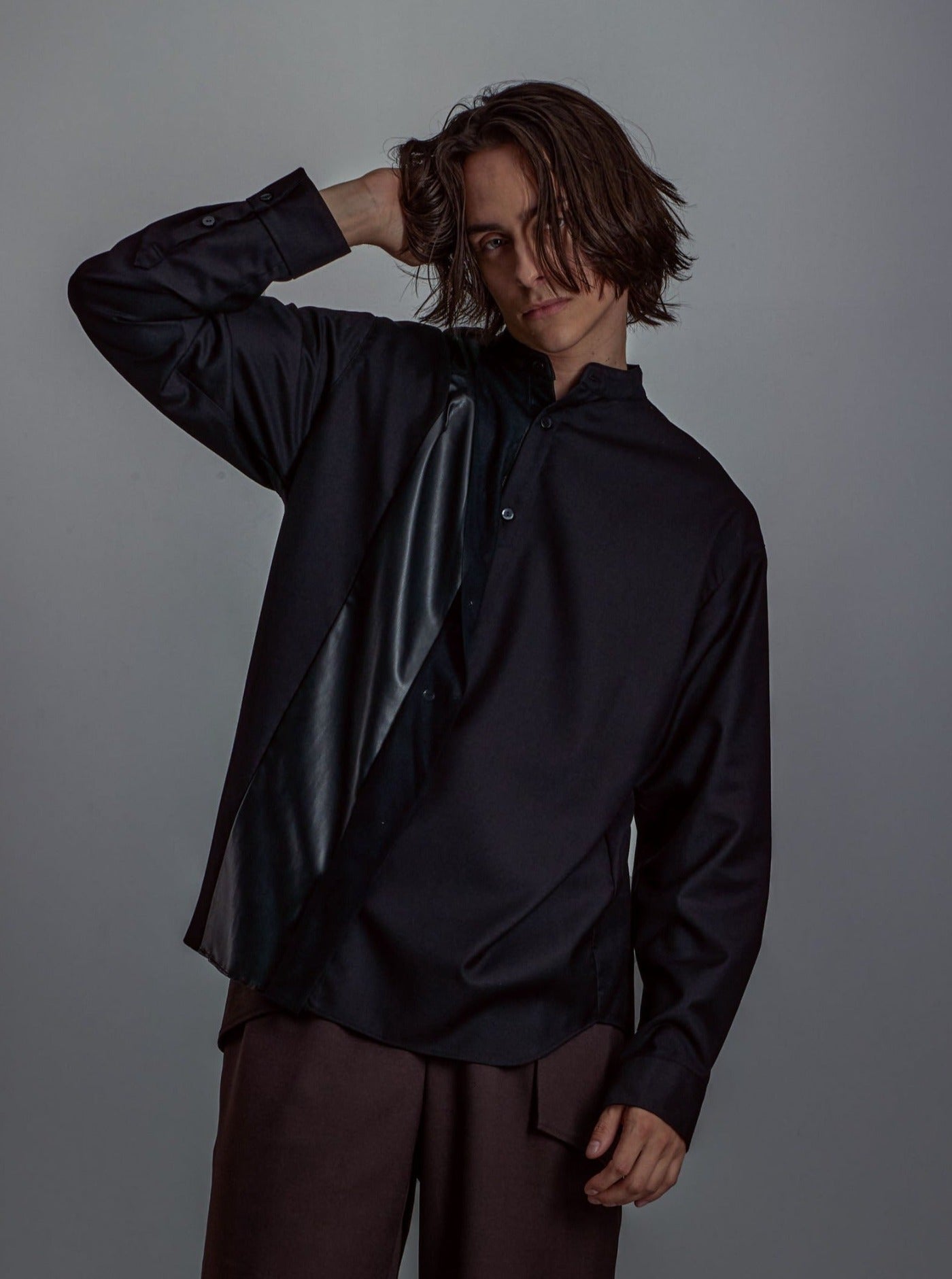 A shirt with a unique design made of a soft textured and elegant shiny fabric layered with faux leather and chambray tulle.