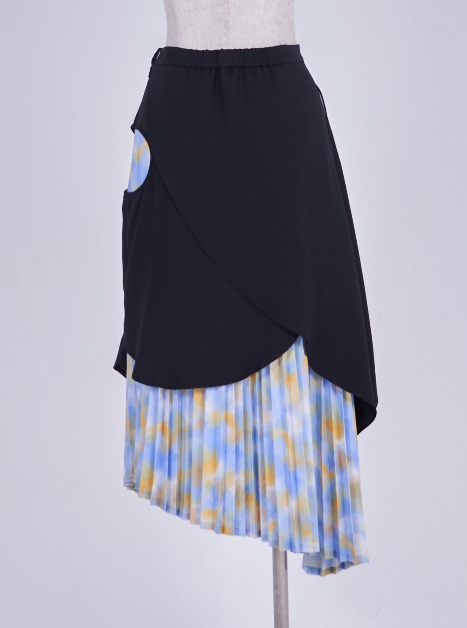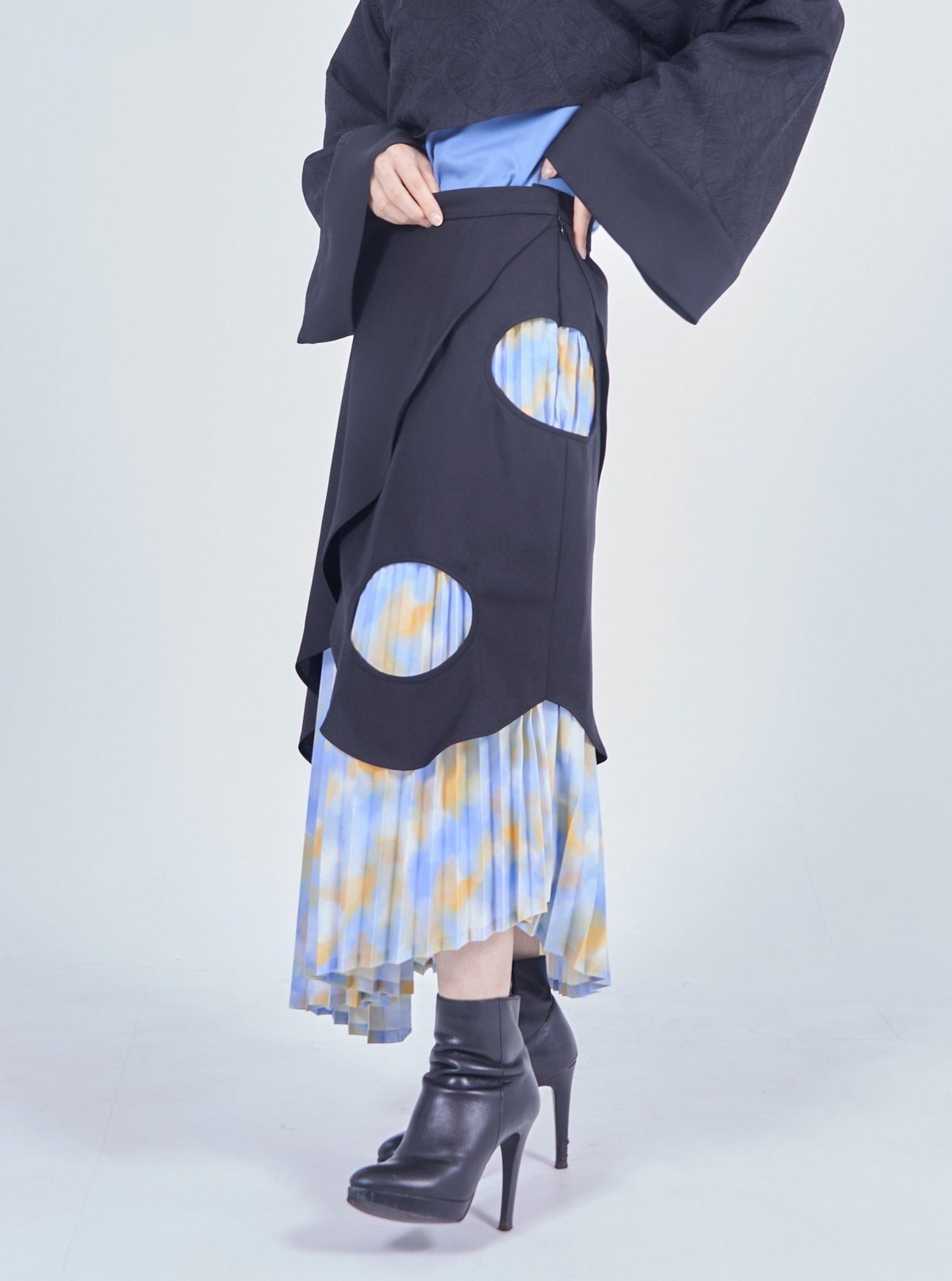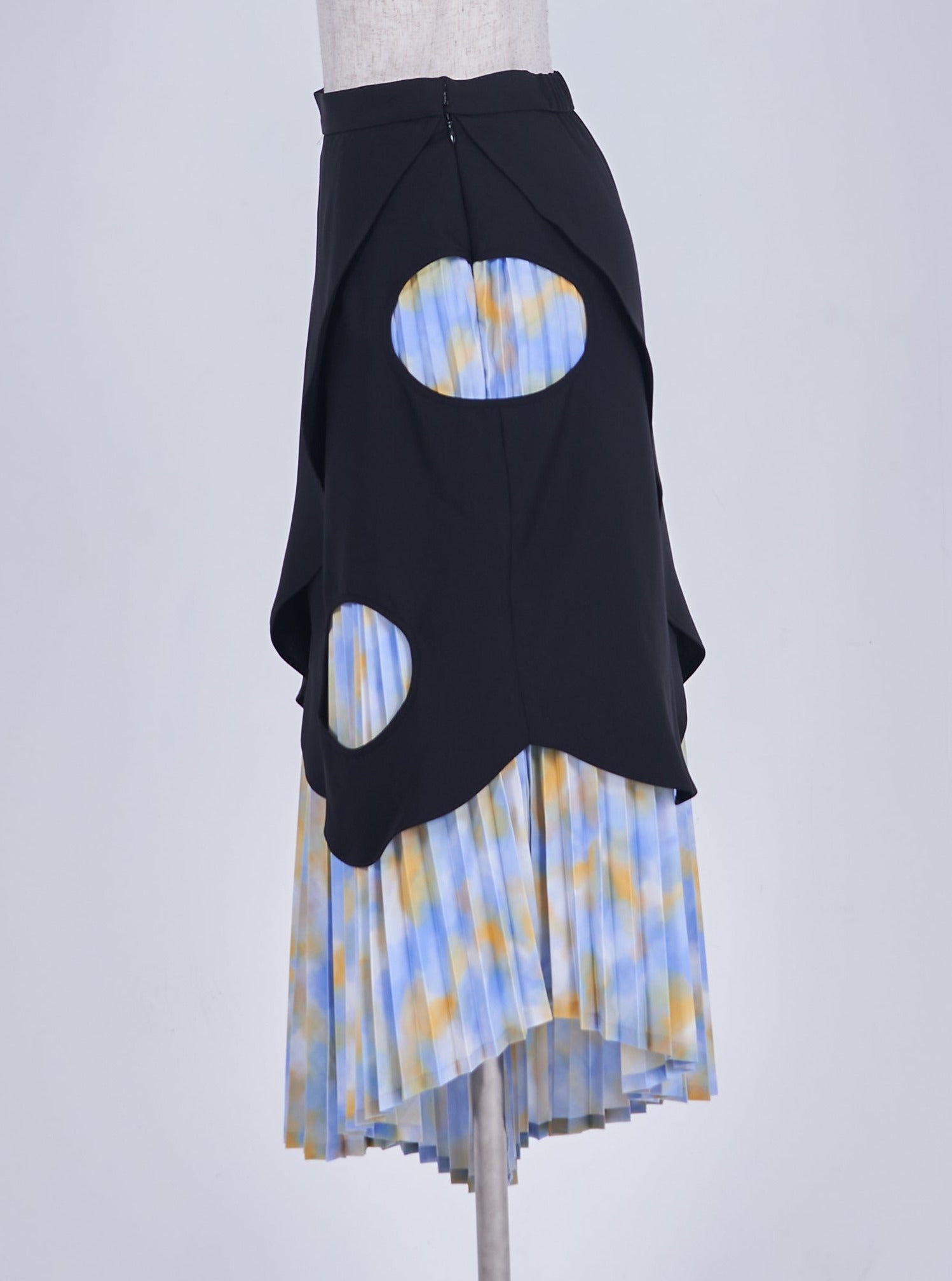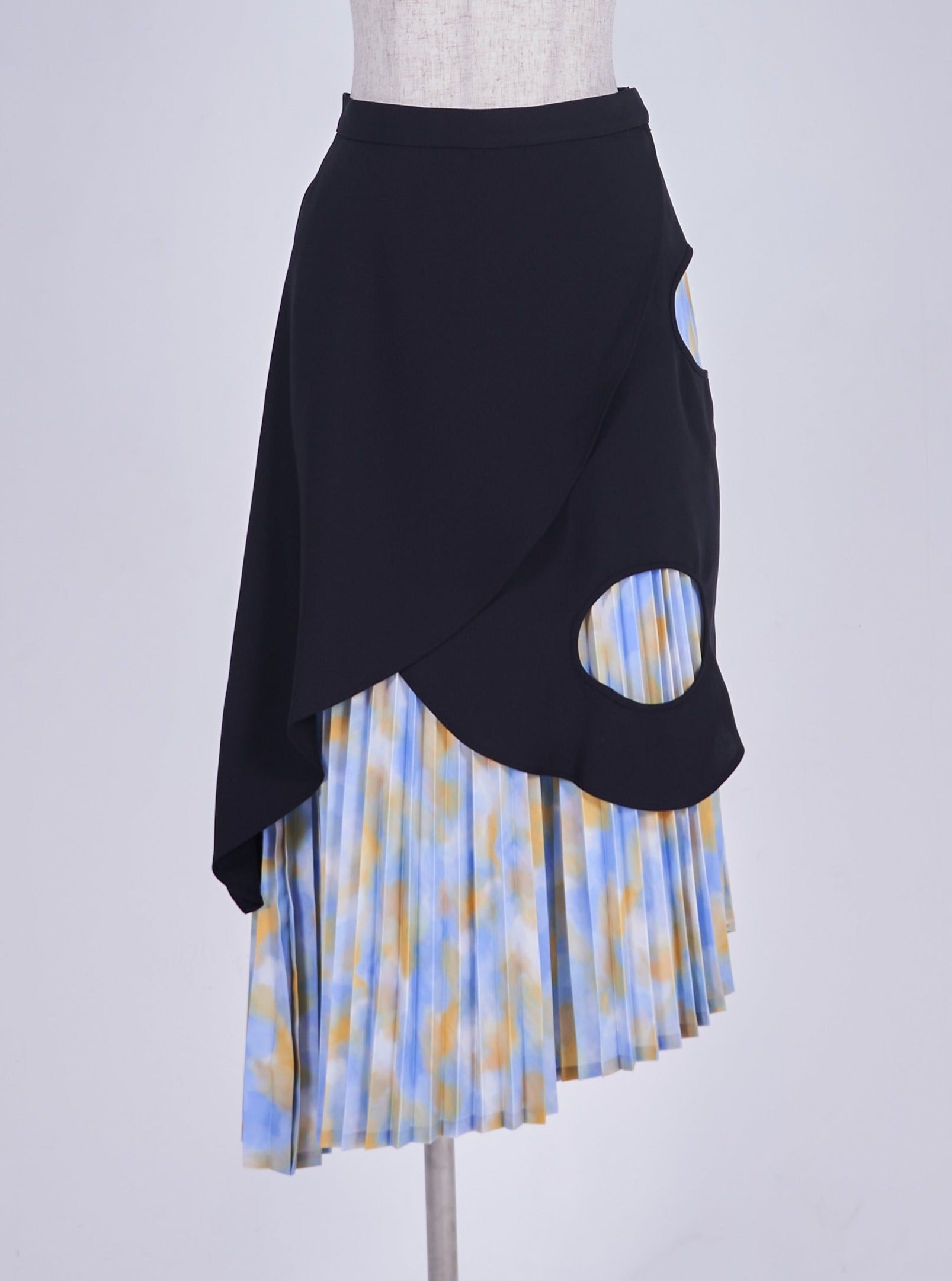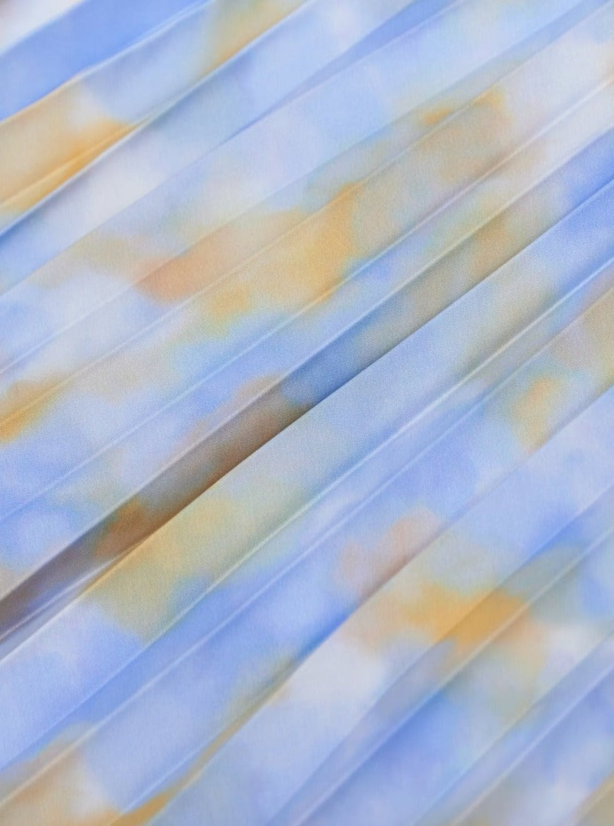 柔らかな光と流れを感じさせるプリント生地をアコーディオンプリーツで贅沢に仕立てたデザインスカート。