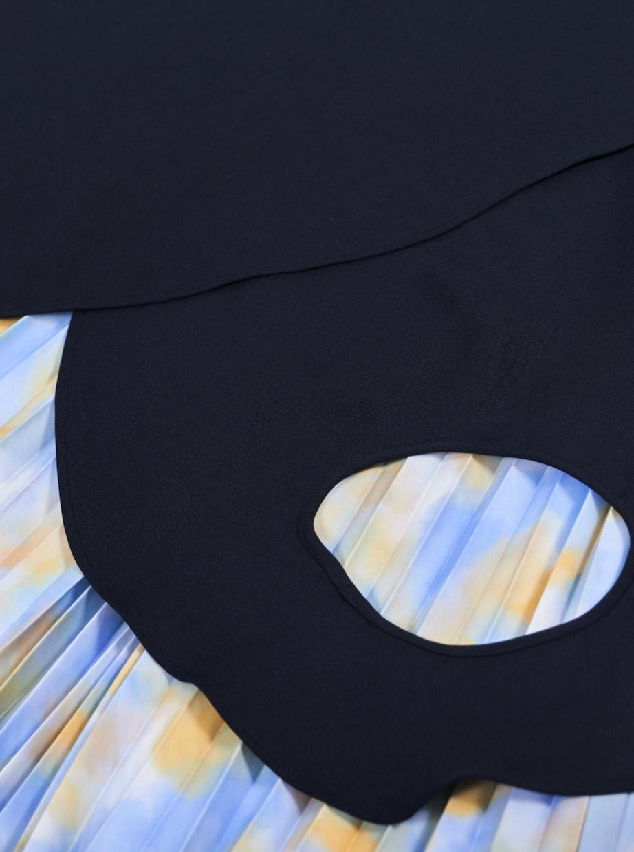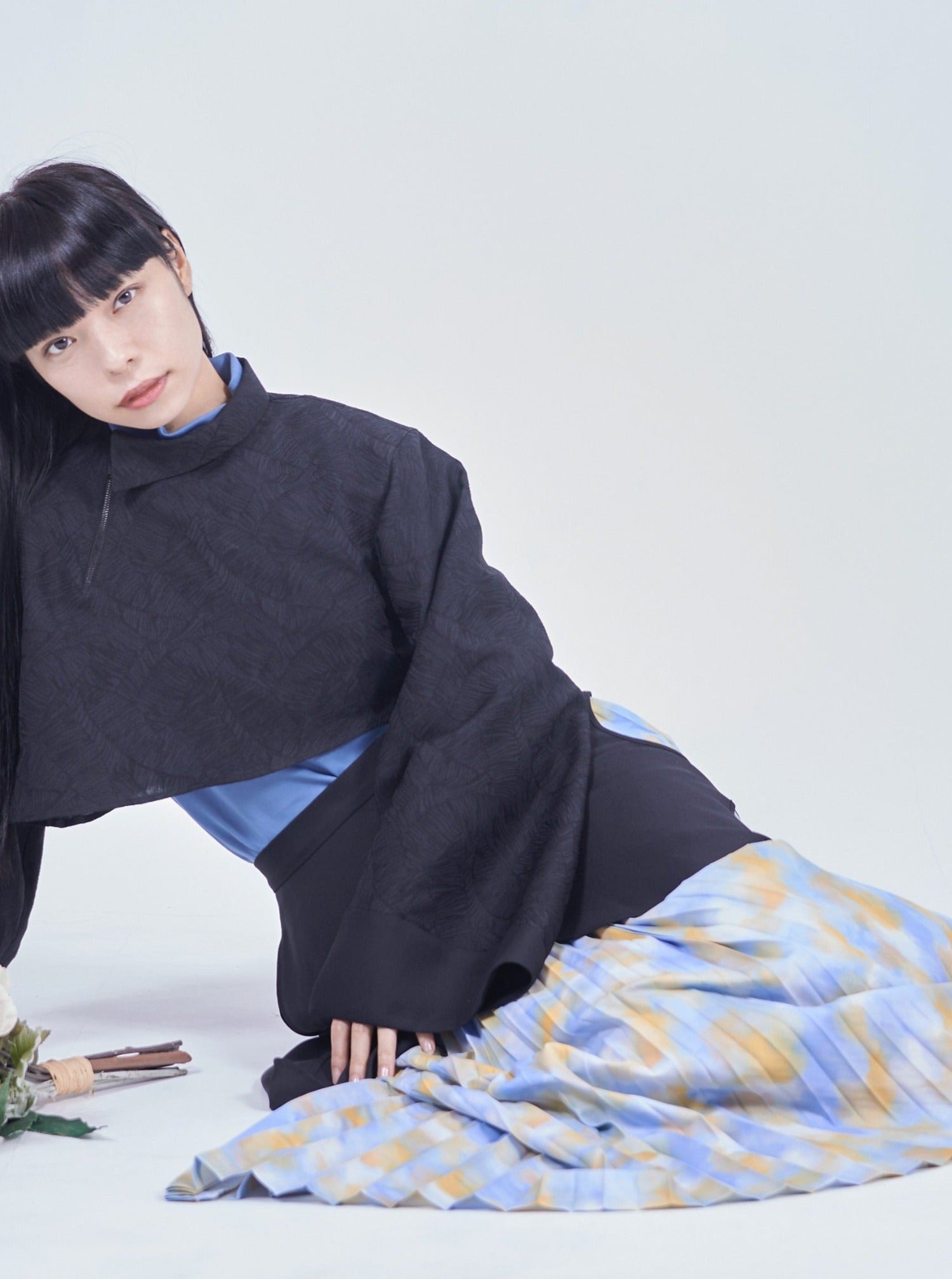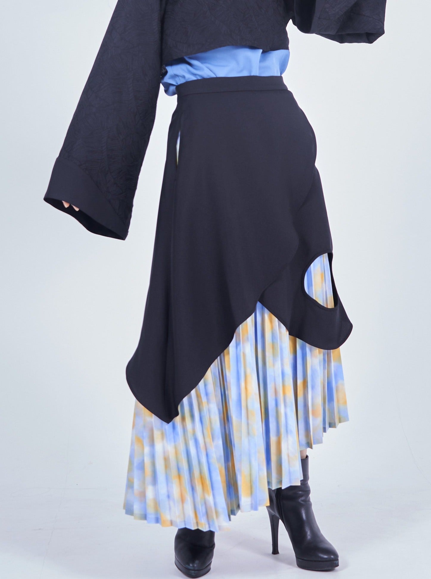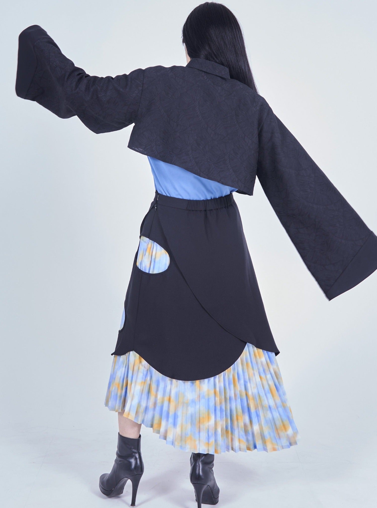 柔らかな光と流れを感じさせるプリント生地をアコーディオンプリーツで贅沢に仕立てたデザインスカート。