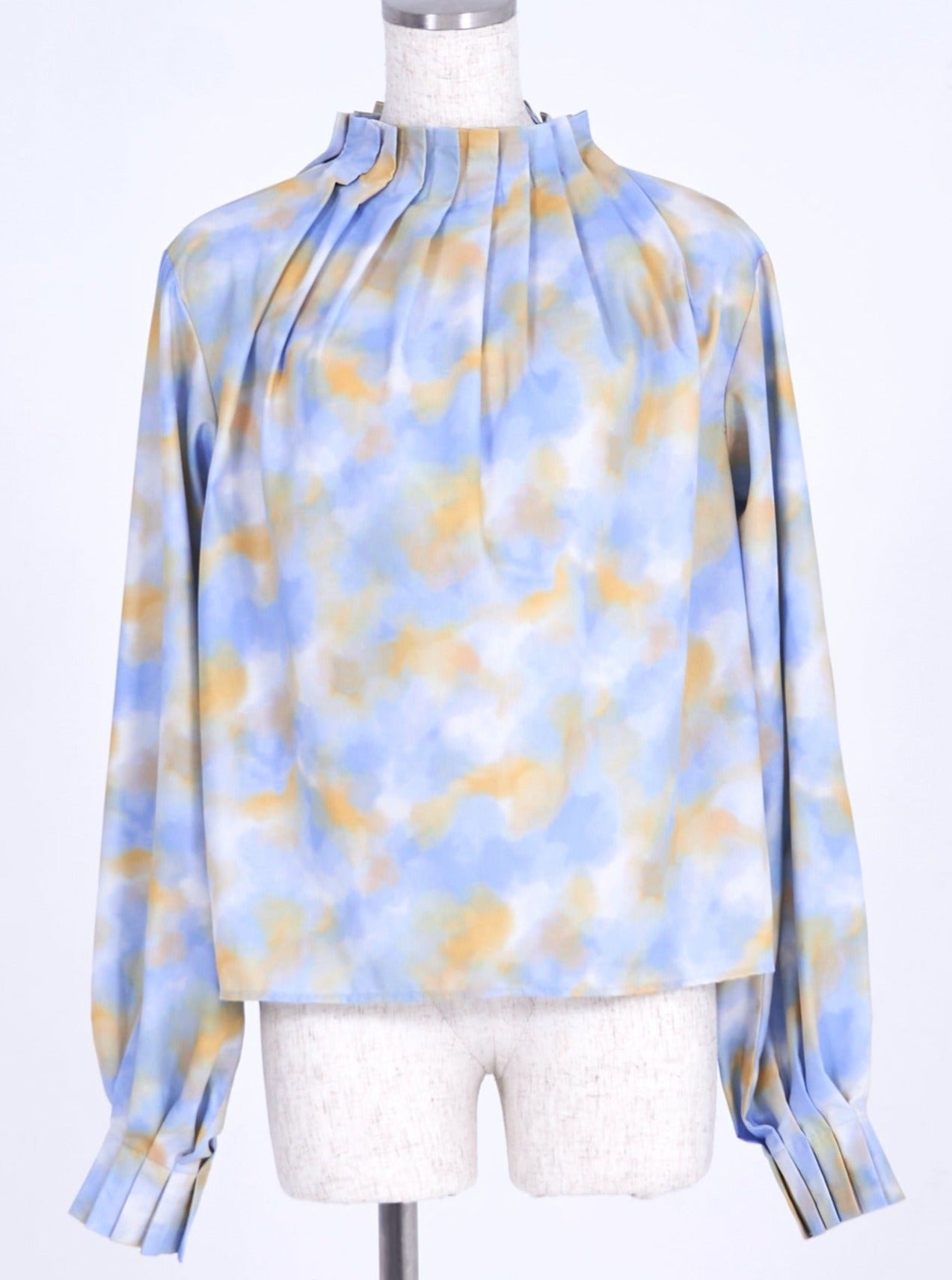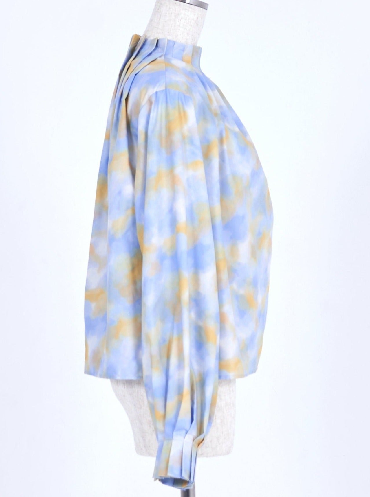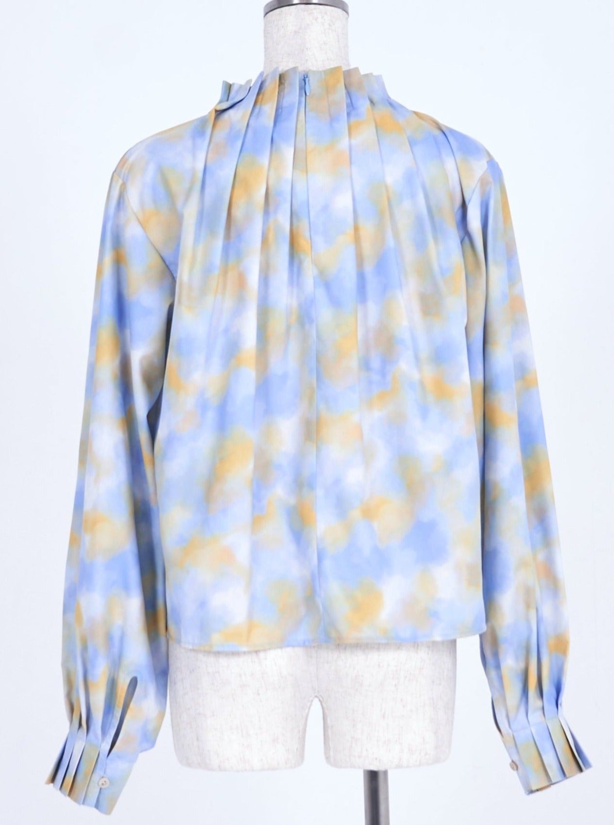 襟・袖の細かなでタックでさりげなく華やかに魅せるプリントブラウス。