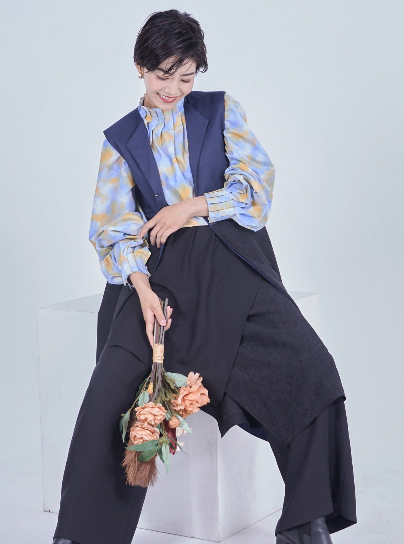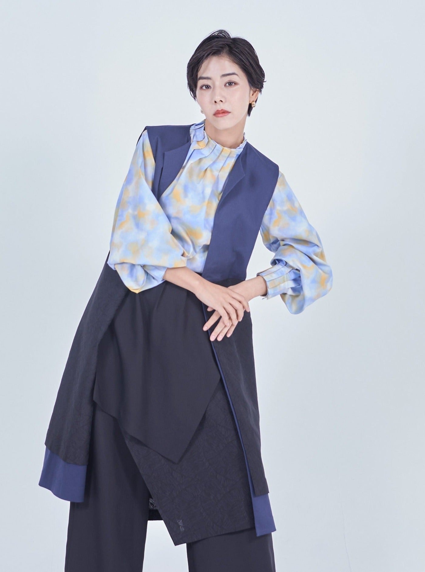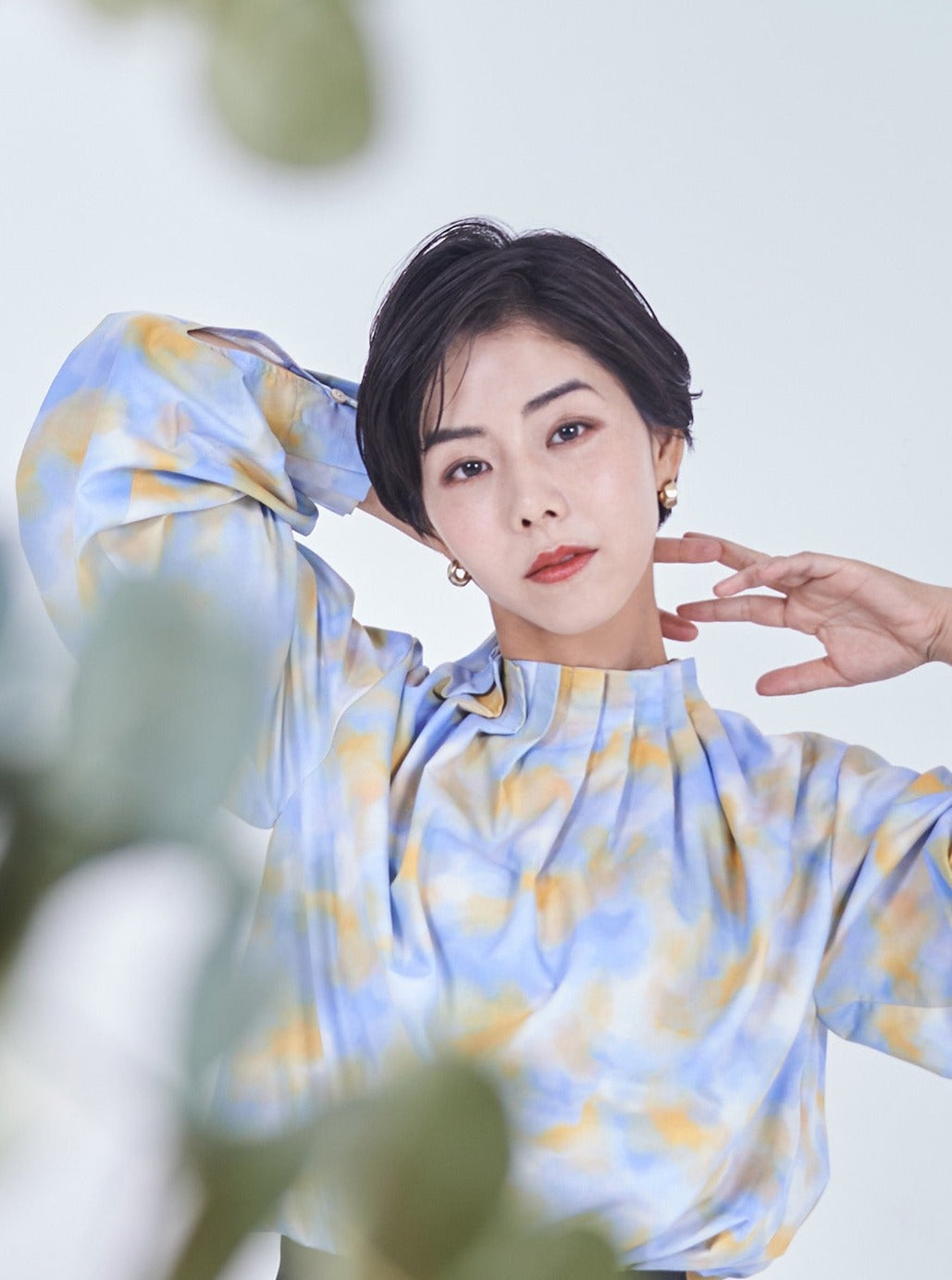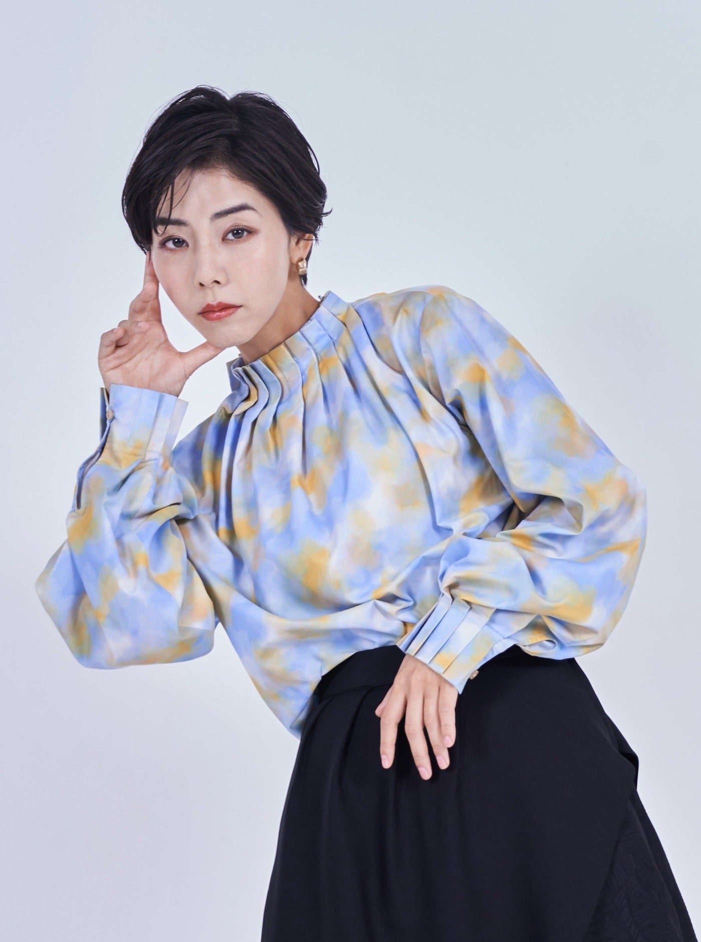 襟・袖の細かなでタックでさりげなく華やかに魅せるプリントブラウス。