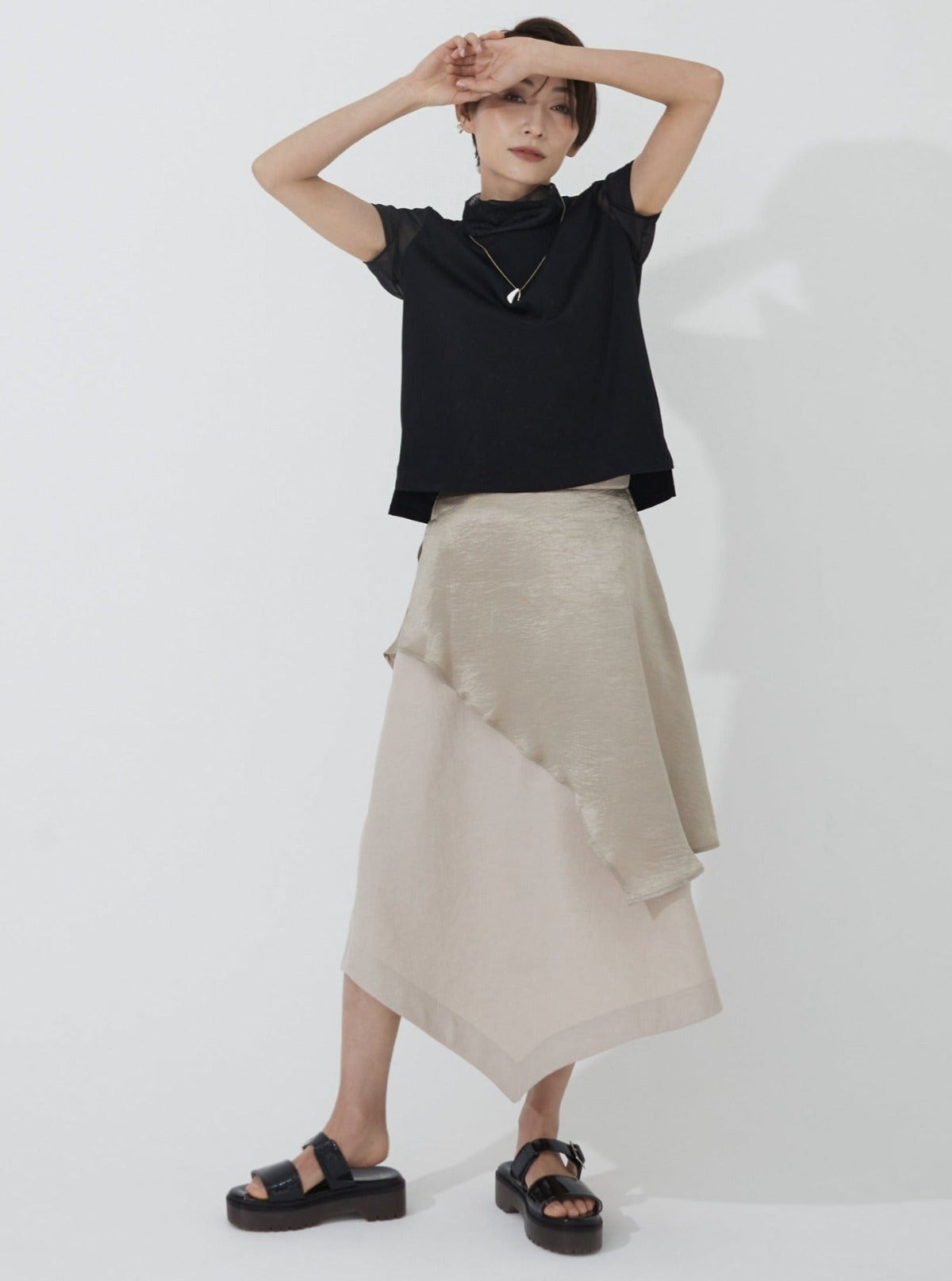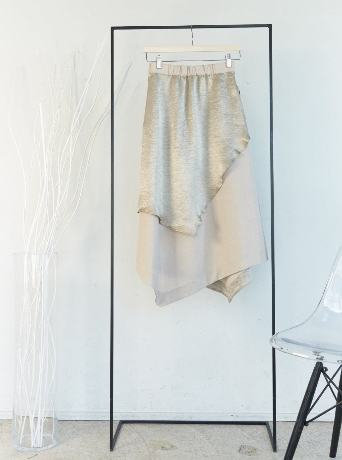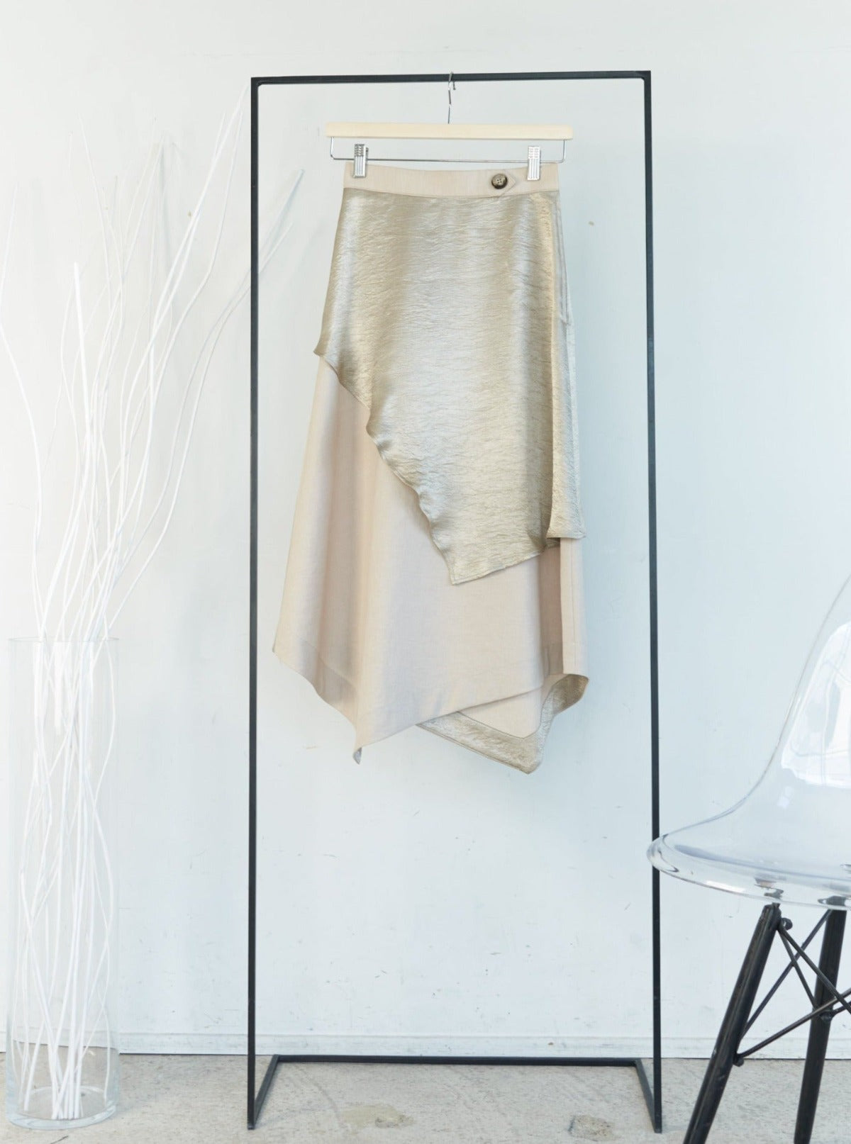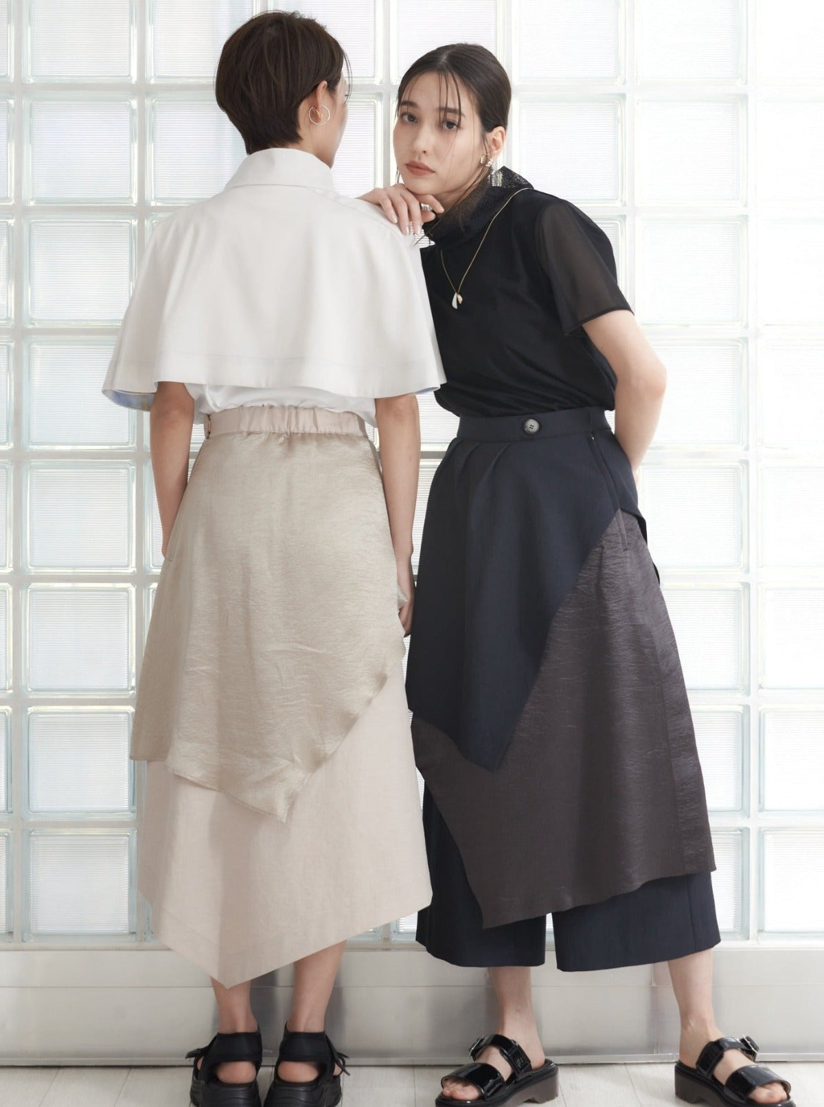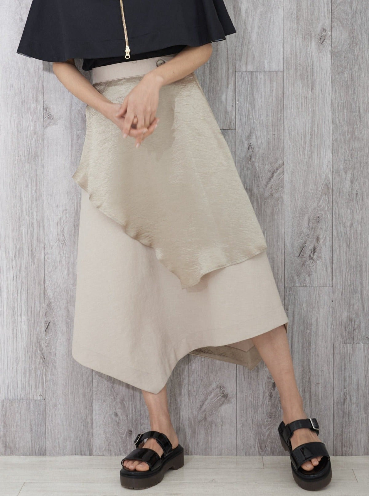 異素材の生地をアシンメトリーに重ねたレイヤードスカート。