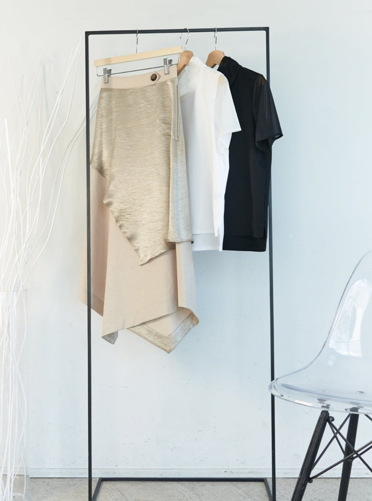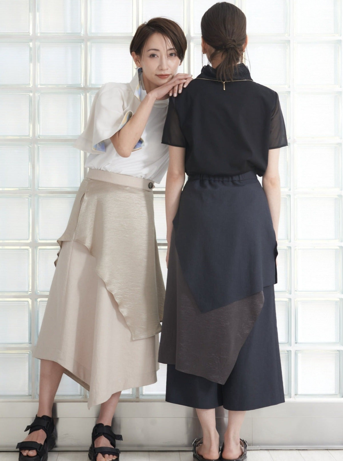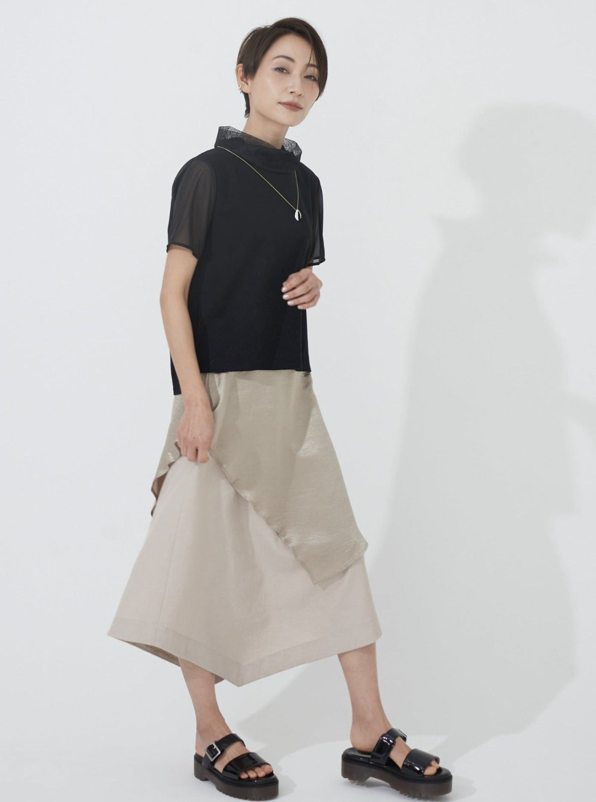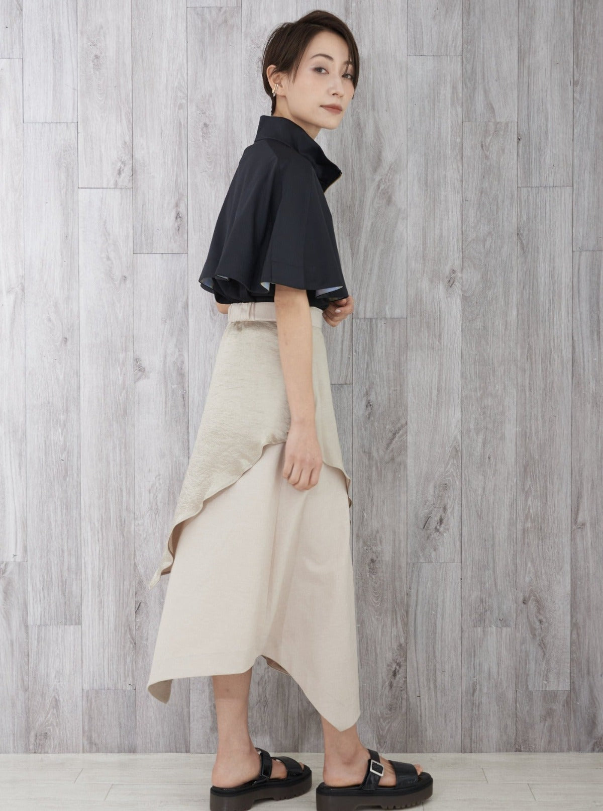 異素材の生地をアシンメトリーに重ねたレイヤードスカート。