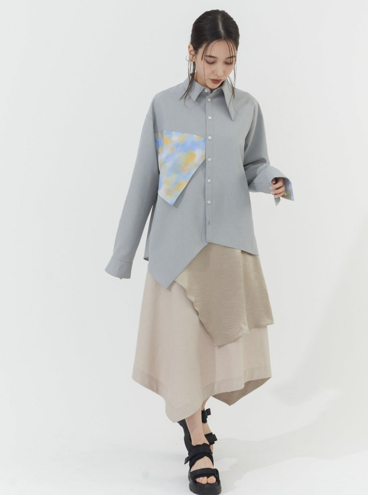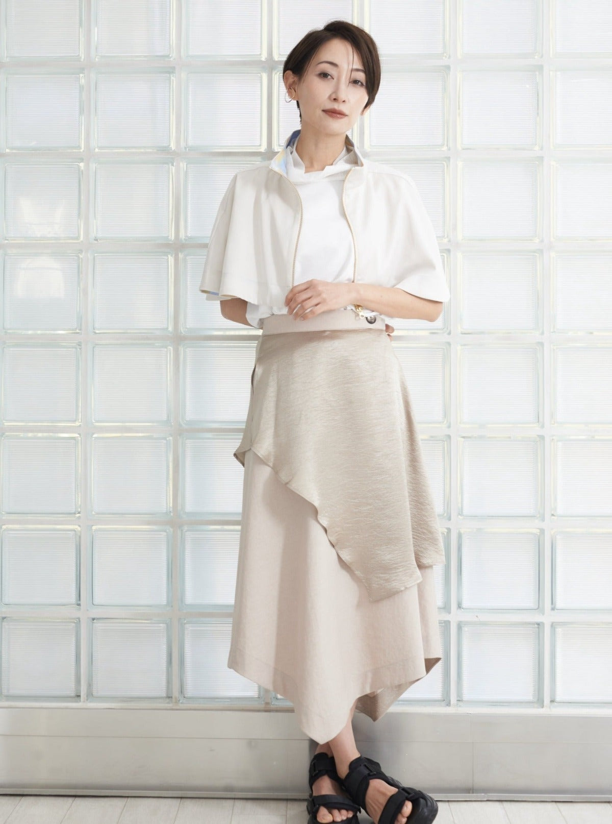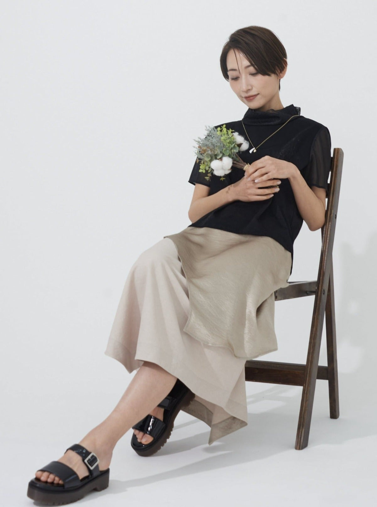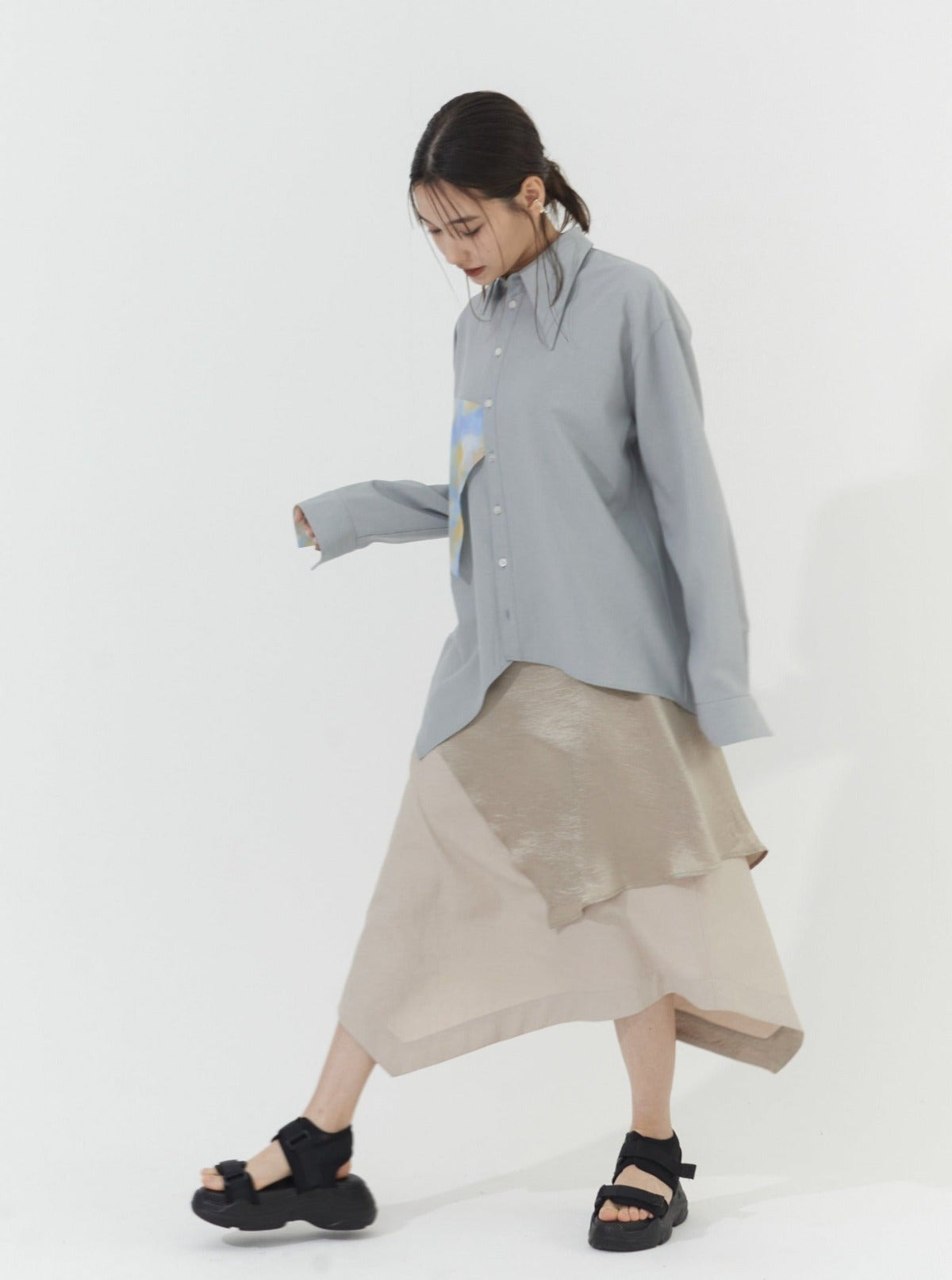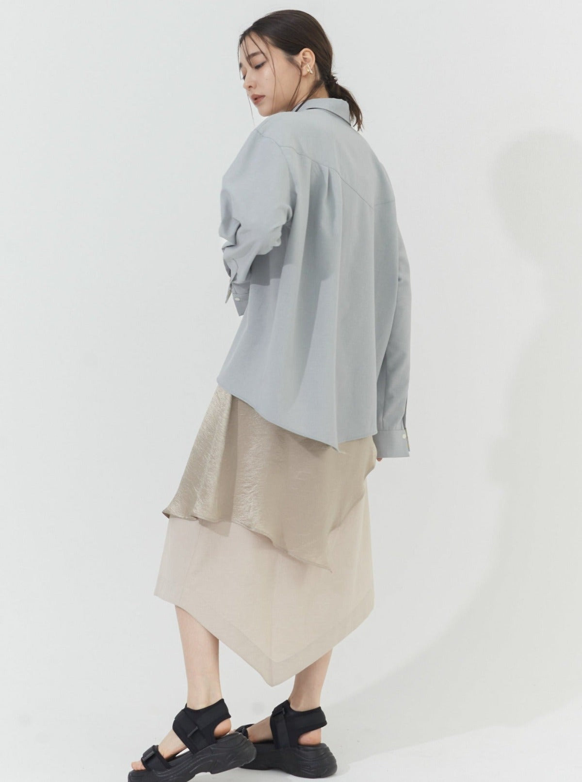 異素材の生地をアシンメトリーに重ねたレイヤードスカート。