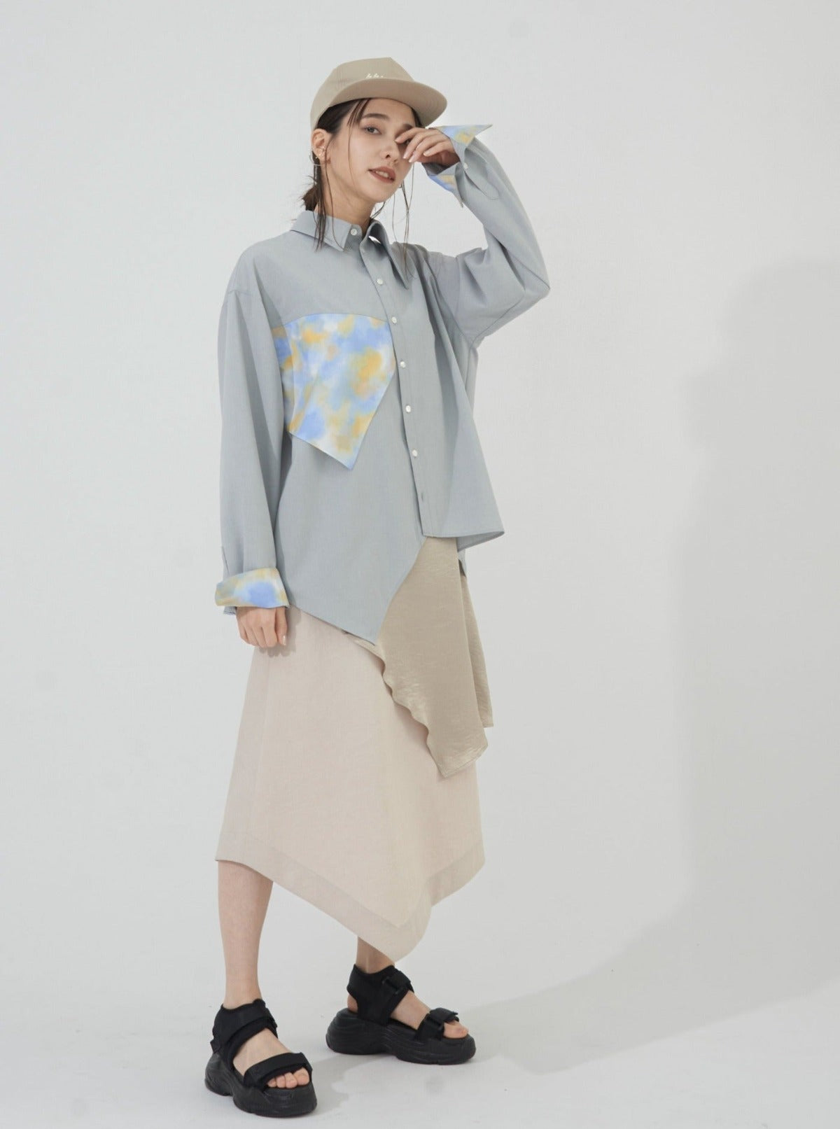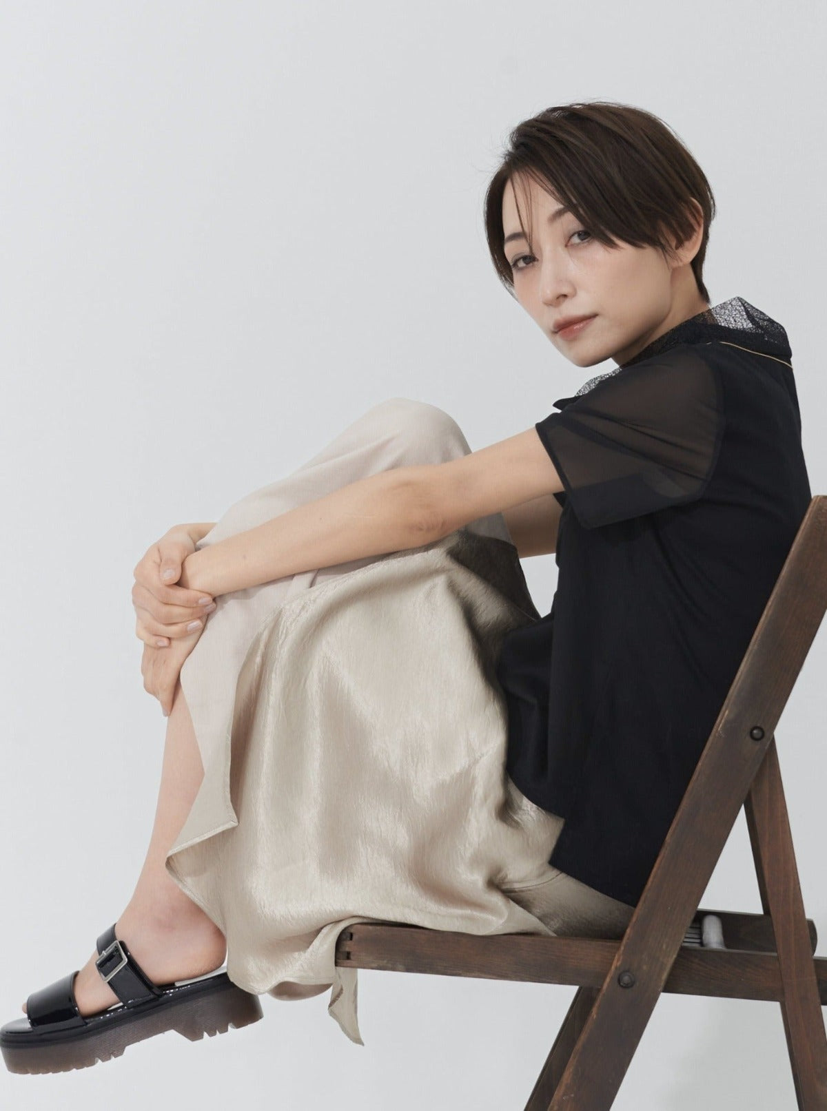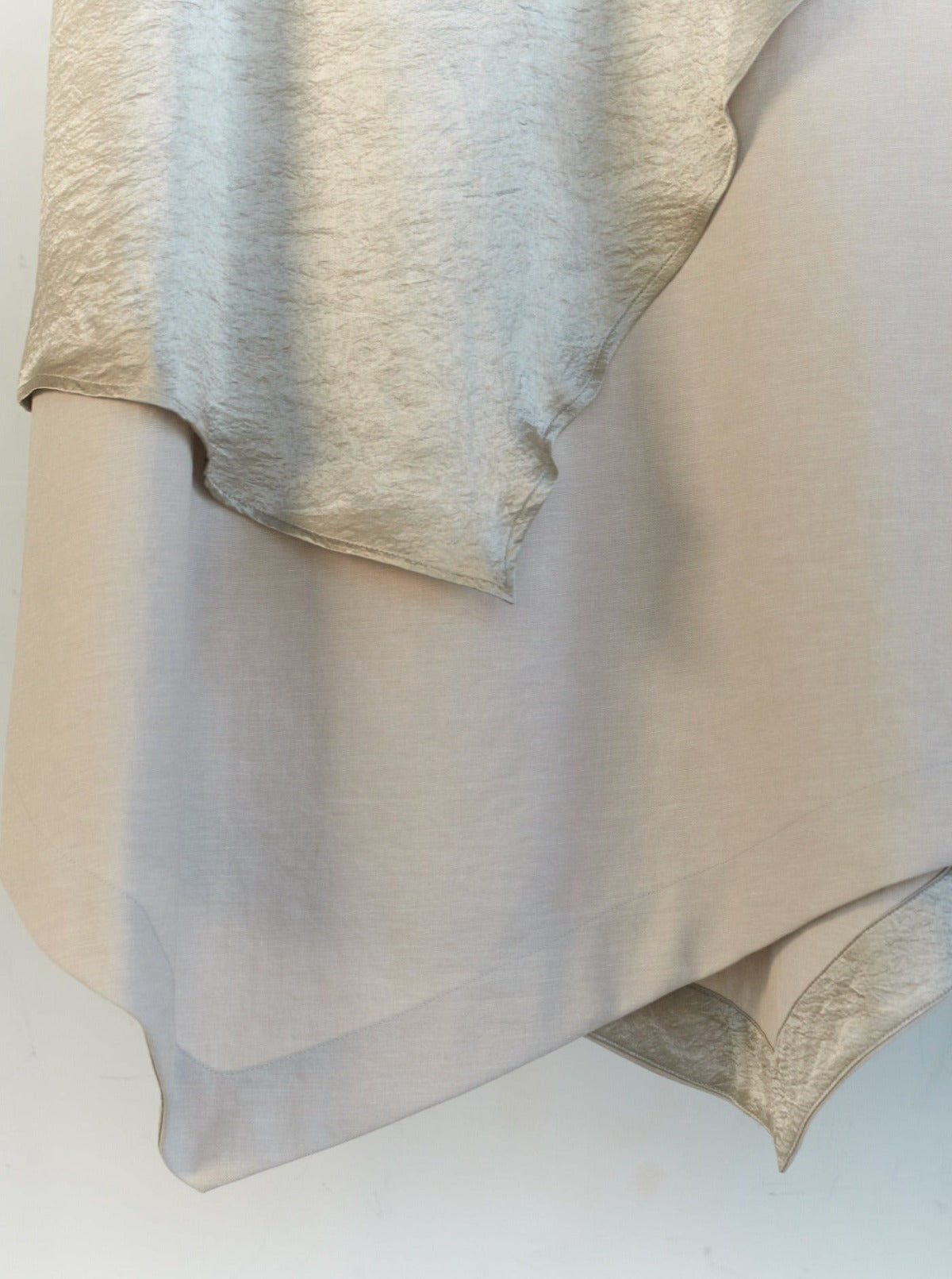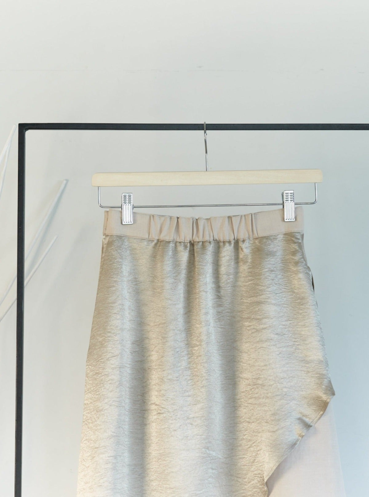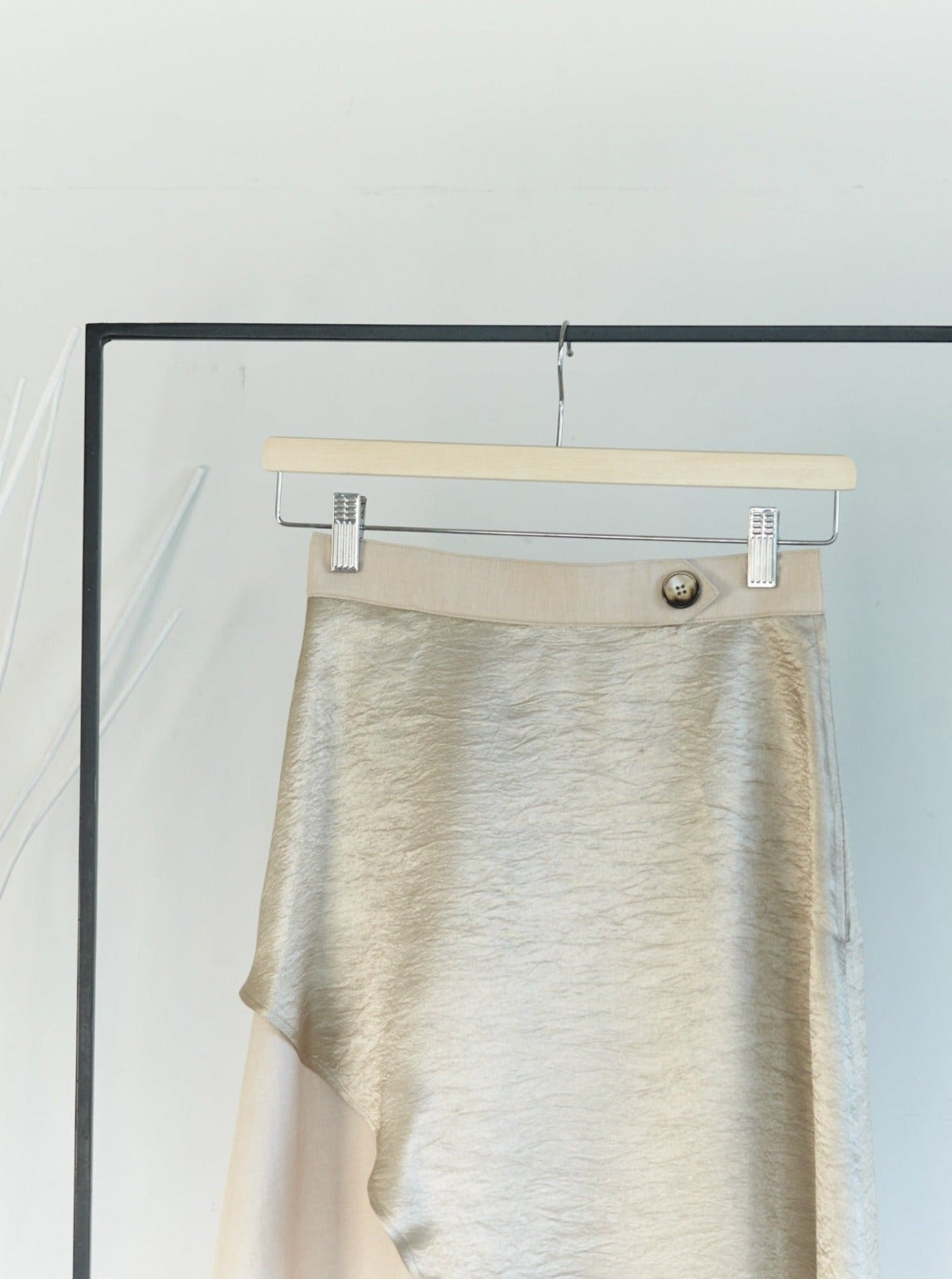 異素材の生地をアシンメトリーに重ねたレイヤードスカート。